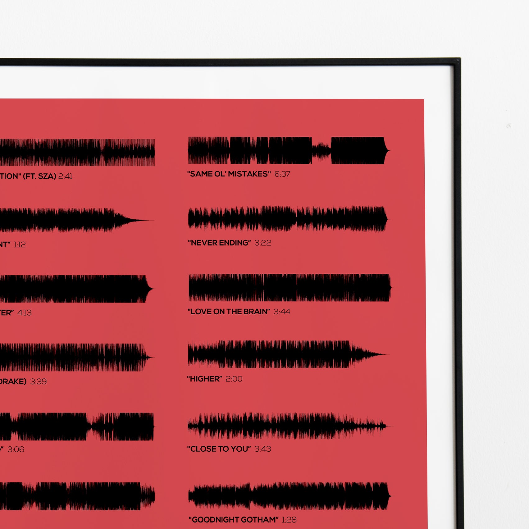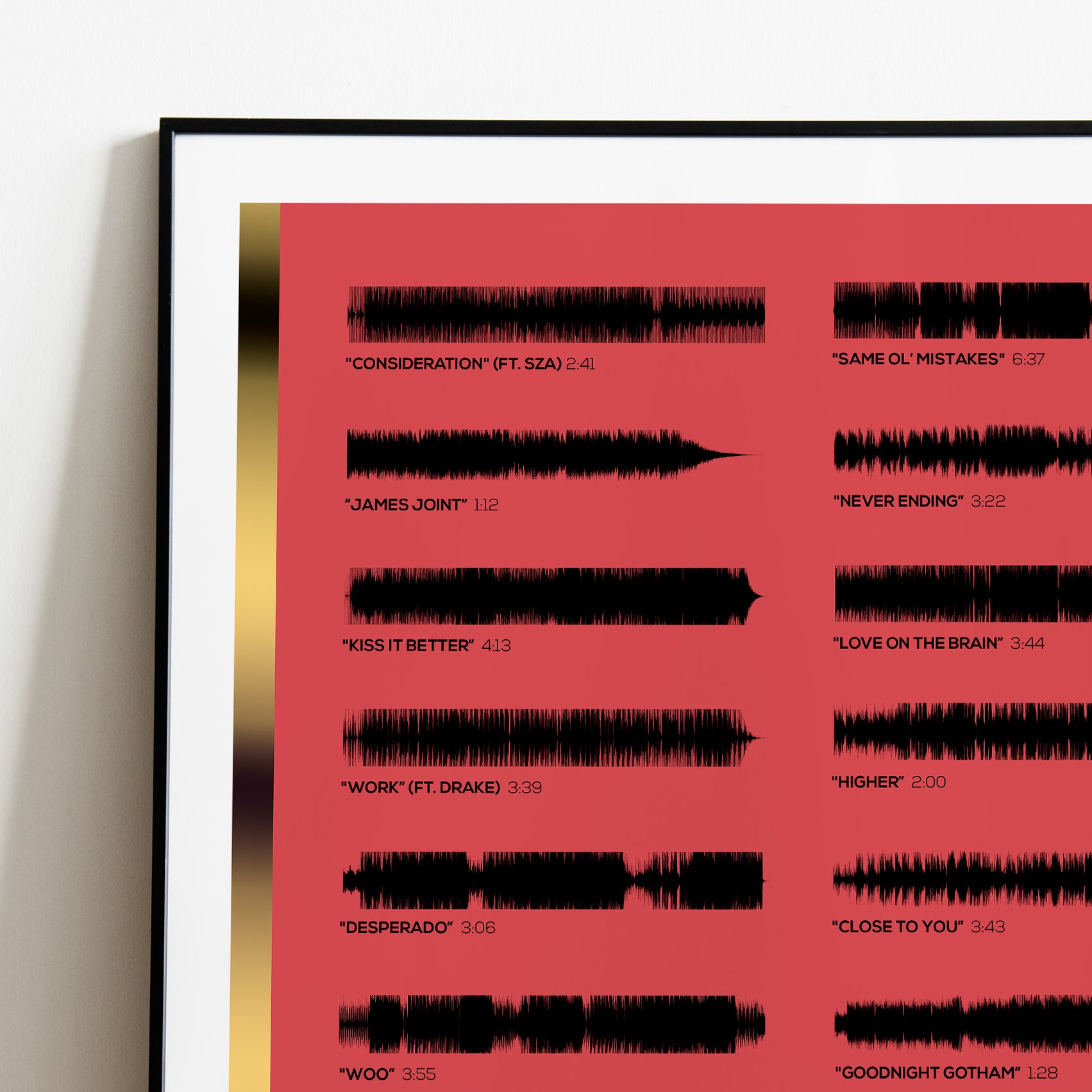 Make waves in your space with this unique soundwave album cover art for "ANTI" by Rihanna, available in three sizes: 16x20, 18x24, and 24x36 inches. Each piece is printed on high-quality 150GSM paper using industry-grade archival inks. Elevate your artwork by pairing it with a handcrafted, 100% hardwood frame in black, white, or natural wood, complete with hanging hardware for easy install & display. Certified authentic, each track’s soundwave is extrapolated using The Wav Room's lossless audio transcribing process, making it a must-have for Rihanna music enthusiasts.