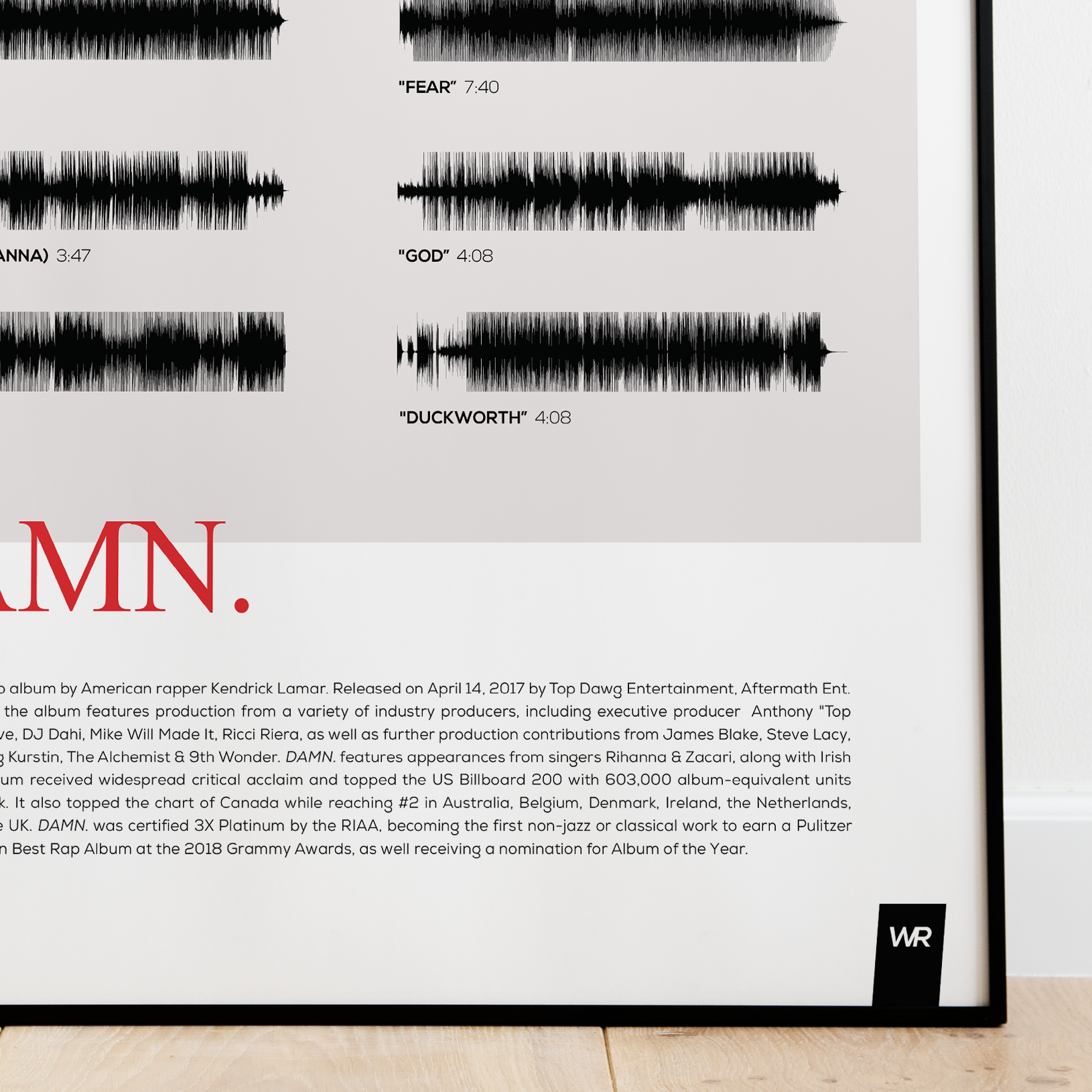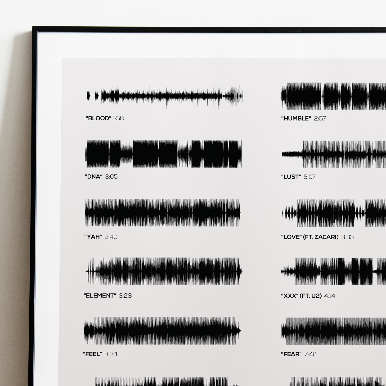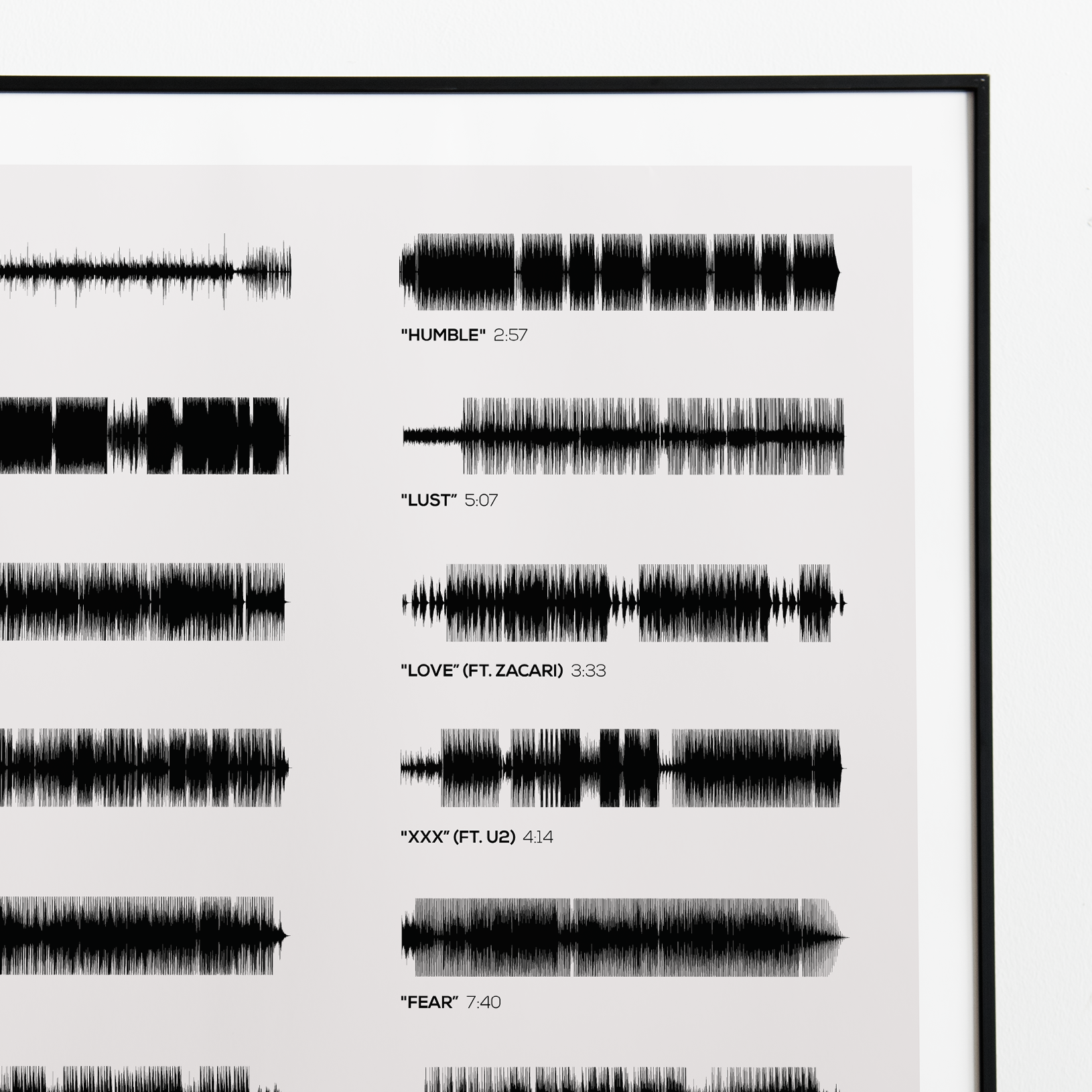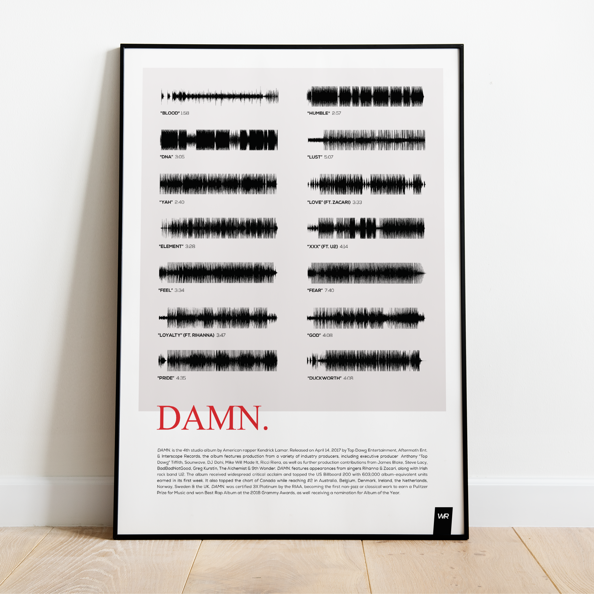 Make waves in your space with this unique soundwave album cover art for "DAMN." by Kendrick Lamar, available in three sizes: 16x20, 18x24, and 24x36 inches. Each piece is printed on high-quality 150GSM paper using industry-grade archival inks. Elevate your artwork by pairing it with a handcrafted, 100% hardwood frame in black, white, or natural wood, complete with hanging hardware for easy install & display. Certified authentic, each track’s soundwave is extrapolated using The Wav Room's lossless audio transcribing process, making it a must-have for Kendrick Lamar music enthusiasts.