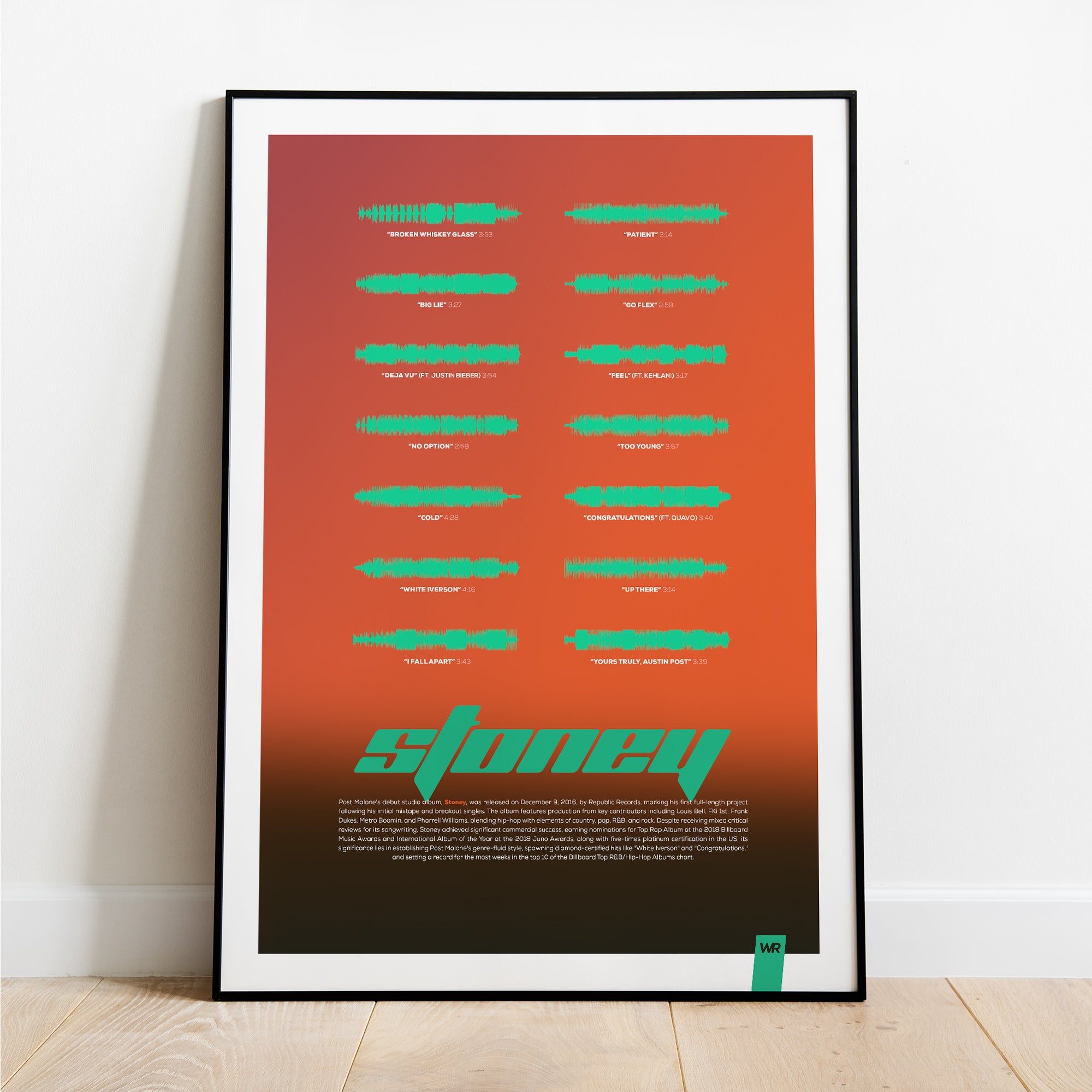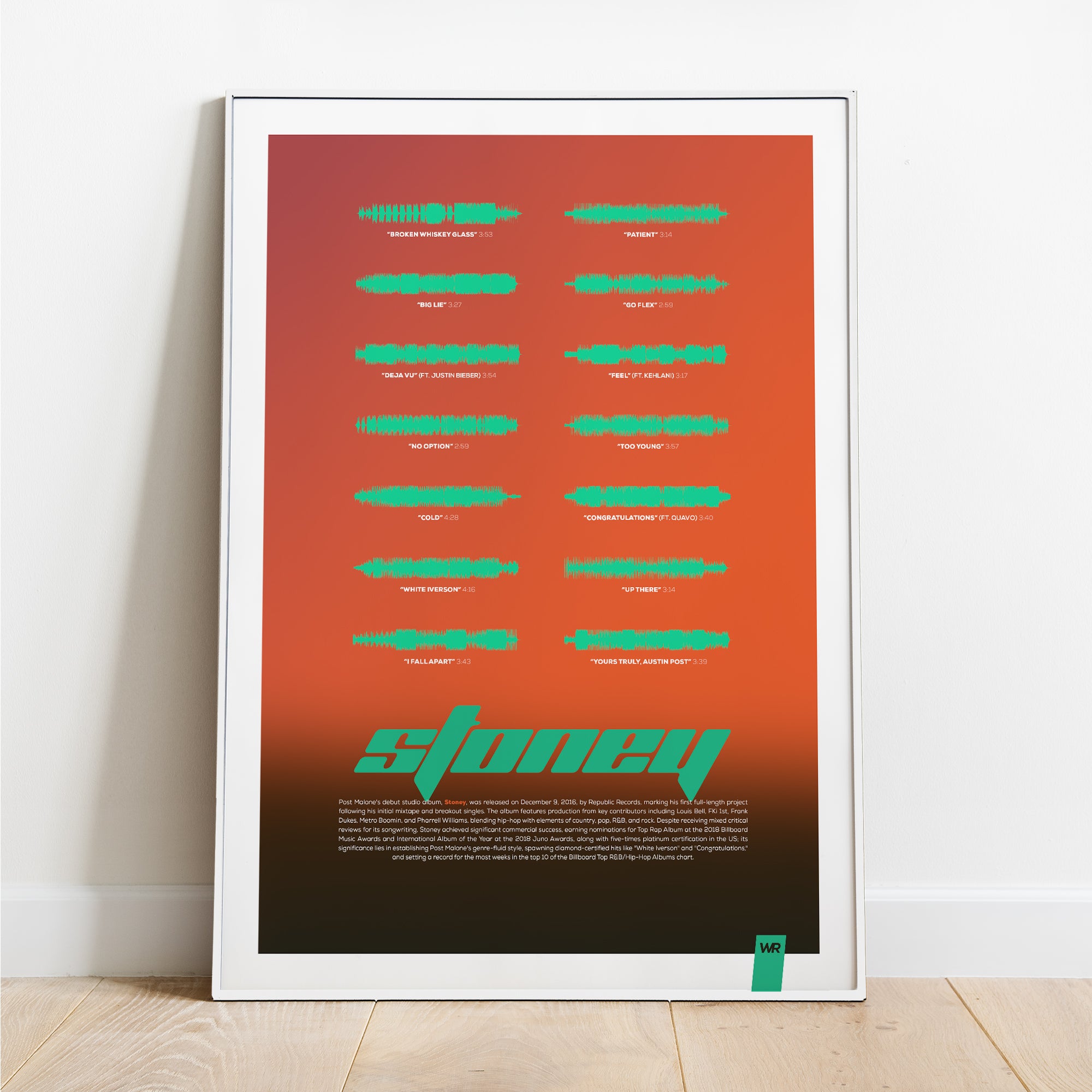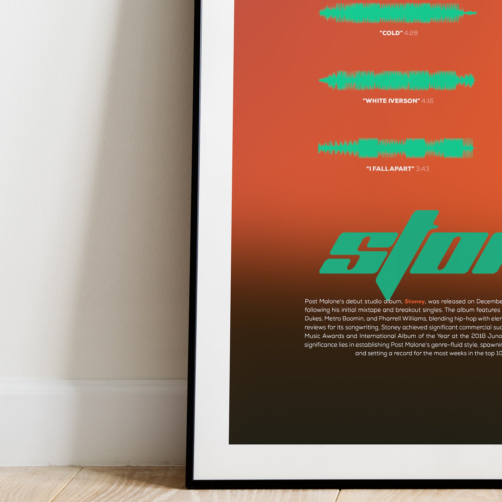 Make waves in your space with this unique soundwave album cover art for "Stoney" by Post Malone, available in three sizes: 16x20, 18x24, and 24x36 inches. Each piece is printed on high-quality 150GSM paper using industry-grade archival inks. Elevate your artwork by pairing it with a handcrafted, 100% hardwood frame in black, white, or natural wood, complete with hanging hardware for easy install & display. Certified authentic, each track’s soundwave is extrapolated using The Wav Room's lossless audio transcribing process, making it a must-have for Post Malone music enthusiasts.