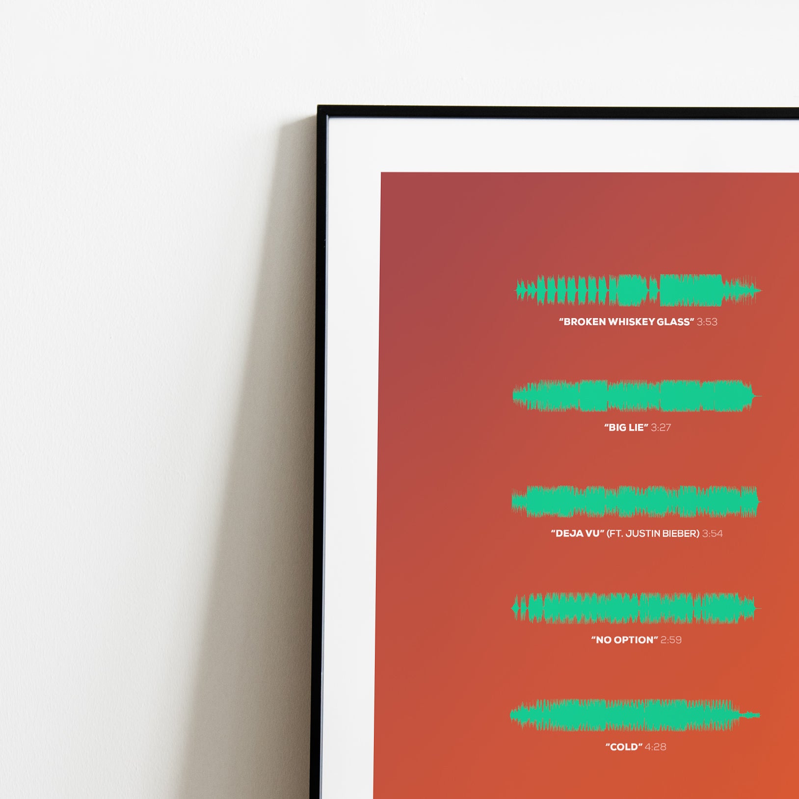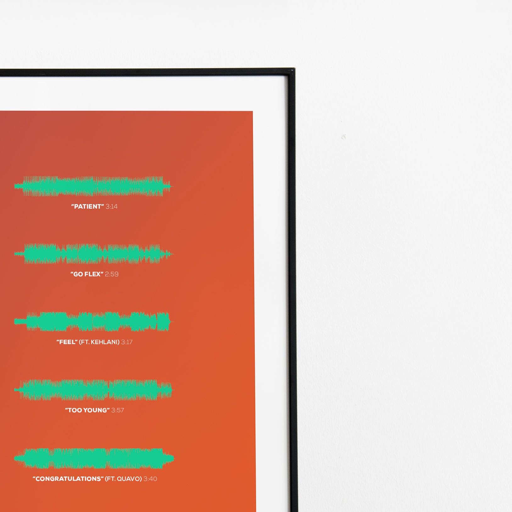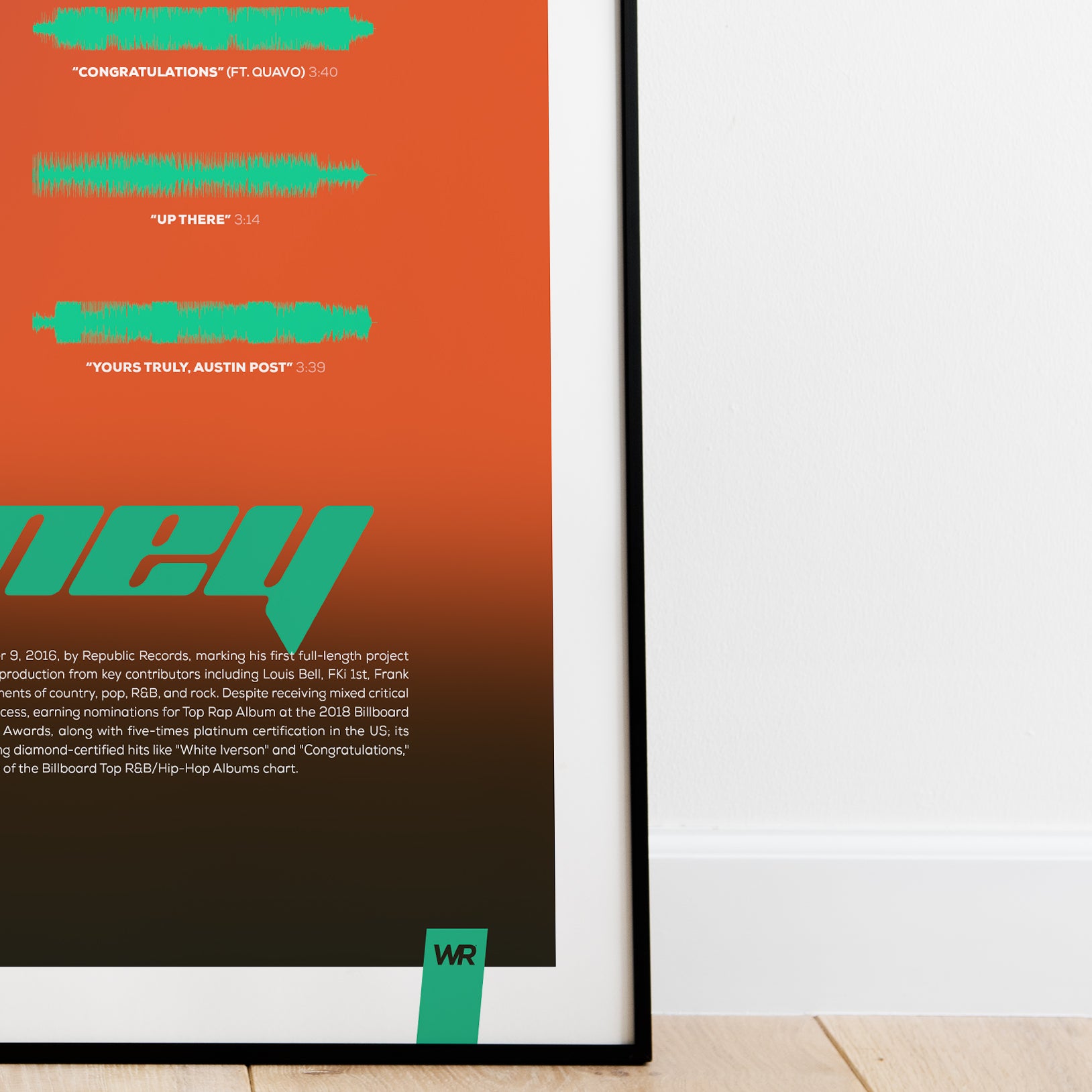 Make waves in your space with this unique soundwave album cover art for "Stoney" by Post Malone, available in three sizes: 16x20, 18x24, and 24x36 inches. Each piece is printed on high-quality 150GSM paper using industry-grade archival inks. Elevate your artwork by pairing it with a handcrafted, 100% hardwood frame in black, white, or natural wood, complete with hanging hardware for easy install & display. Certified authentic, each track’s soundwave is extrapolated using The Wav Room's lossless audio transcribing process, making it a must-have for Post Malone music enthusiasts.