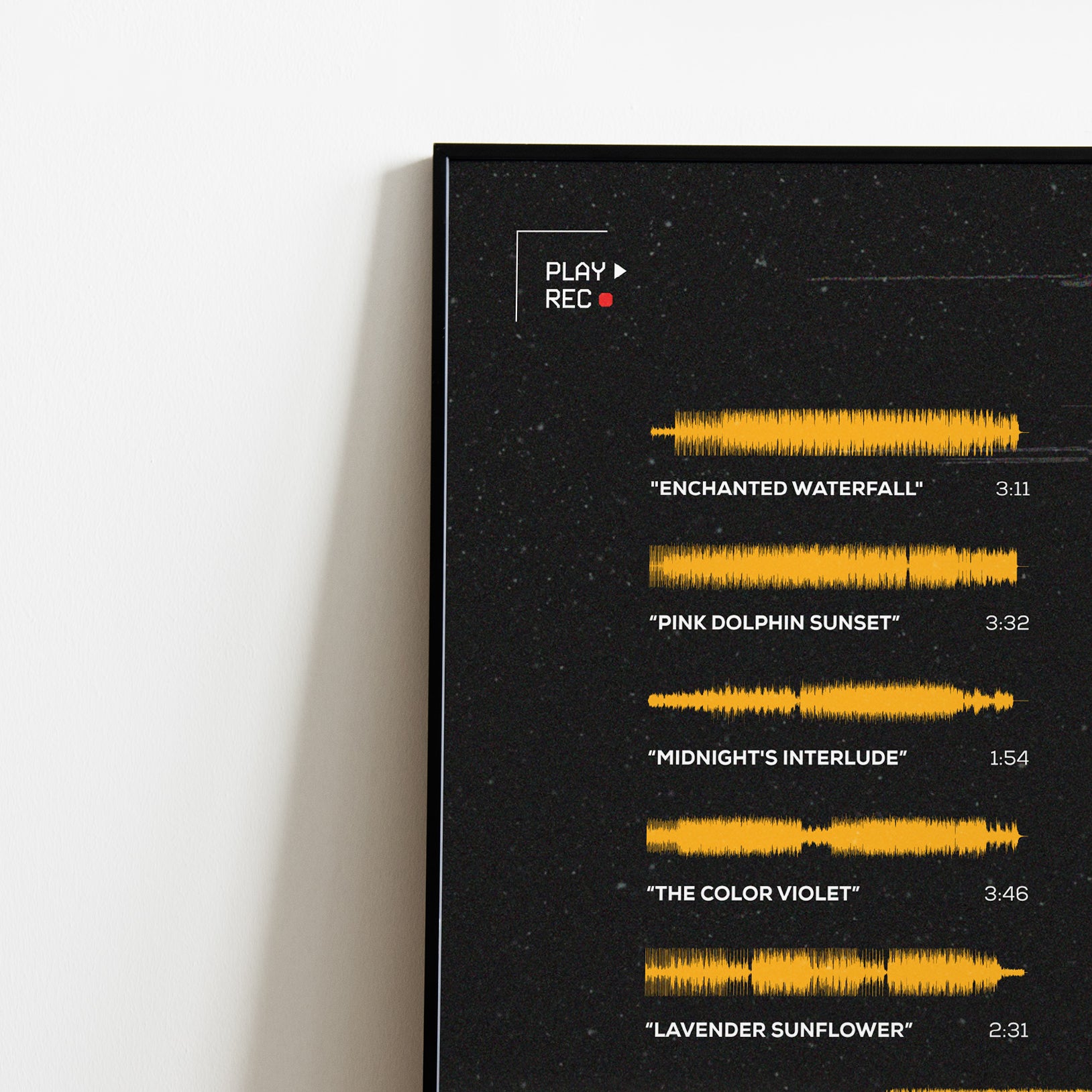 Make waves in your space with this unique soundwave album cover art for "Alone at Prom" by Tory Lanez, available in three sizes: 16x20, 18x24, and 24x36 inches. Each piece is printed on high-quality 150GSM paper using industry-grade archival inks. Elevate your artwork by pairing it with a handcrafted, 100% hardwood frame in black, white, or natural wood, complete with hanging hardware for easy install & display. Certified authentic, each track’s soundwave is extrapolated using The Wav Room's lossless audio transcribing process, making it a must-have for Tory Lanez music enthusiasts.