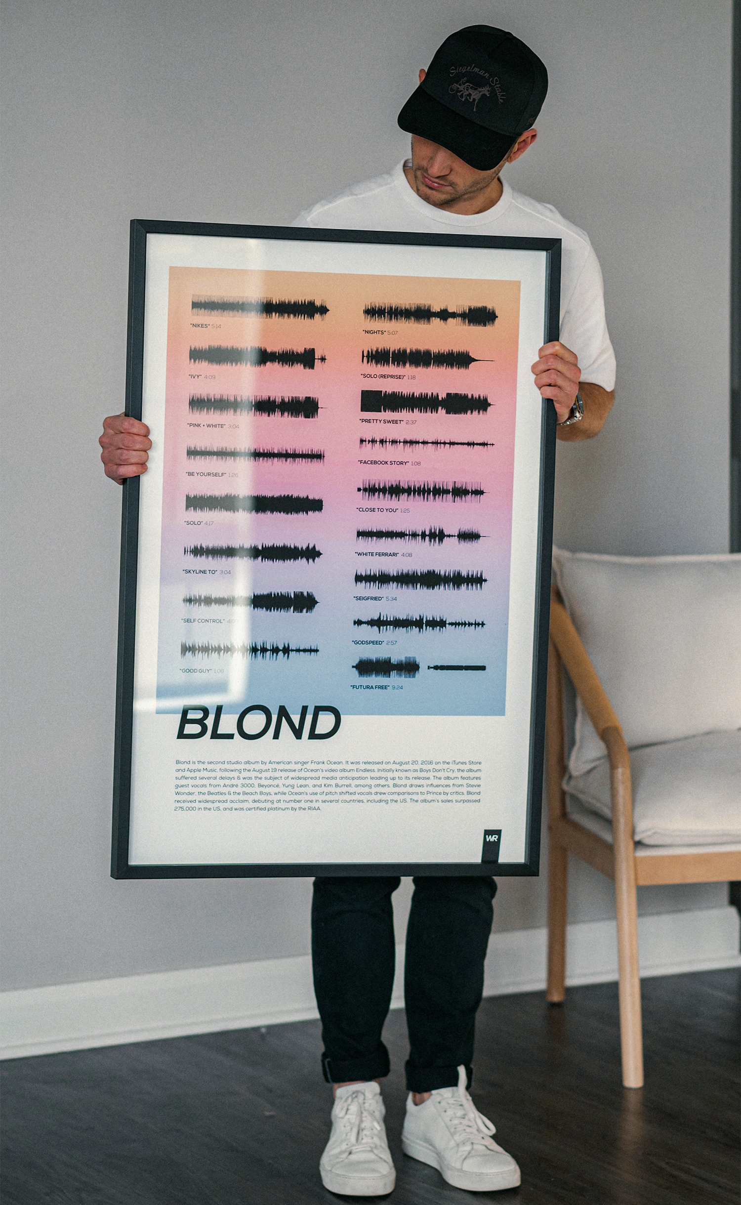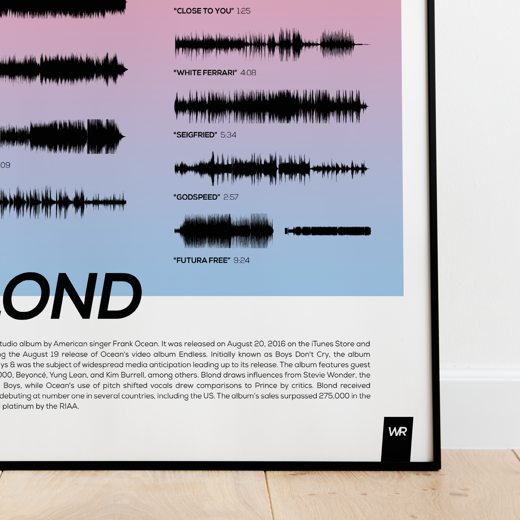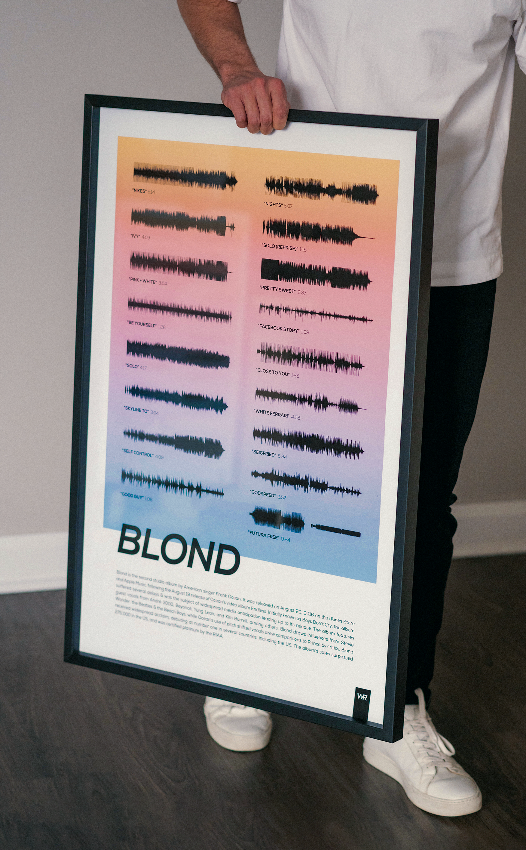 Make waves in your space with this unique soundwave album cover art for "Blond" by Frank Ocean, available in three sizes: 16x20, 18x24, and 24x36 inches. Each piece is printed on high-quality 150GSM paper using industry-grade archival inks. Elevate your artwork by pairing it with a handcrafted, 100% hardwood frame in black, white, or natural wood, complete with hanging hardware for easy install & display. Certified authentic, each track’s soundwave is extrapolated using The Wav Room's lossless audio transcribing process, making it a must-have for Frank Ocean music enthusiasts.