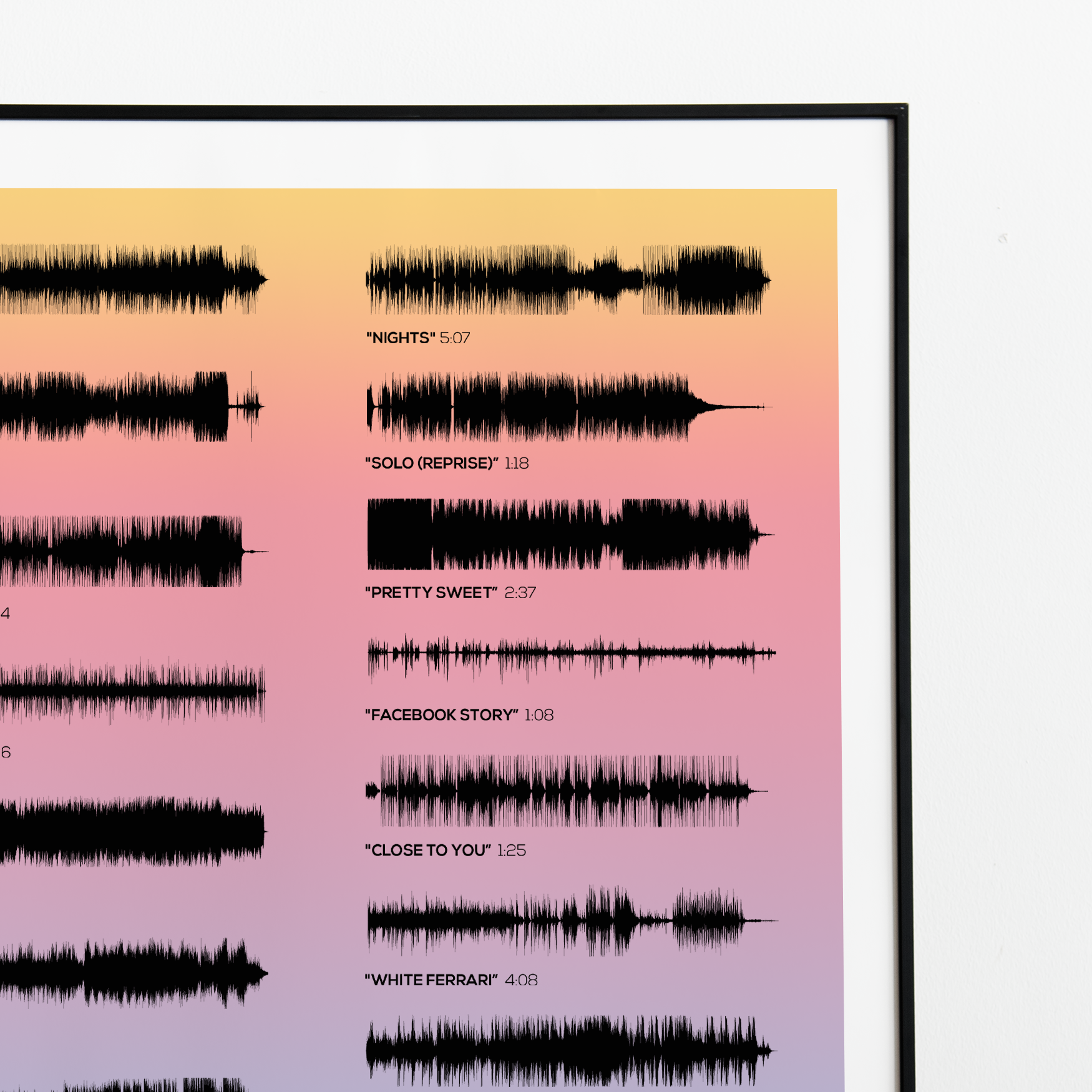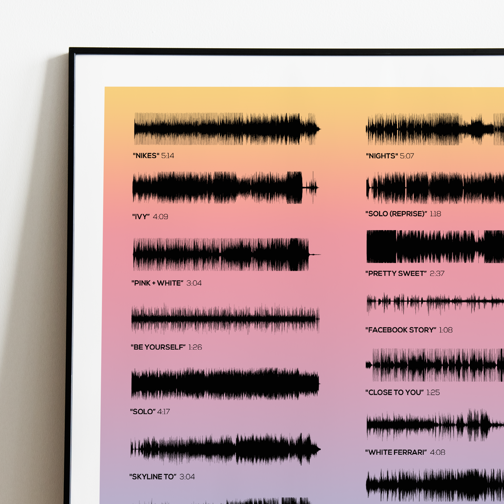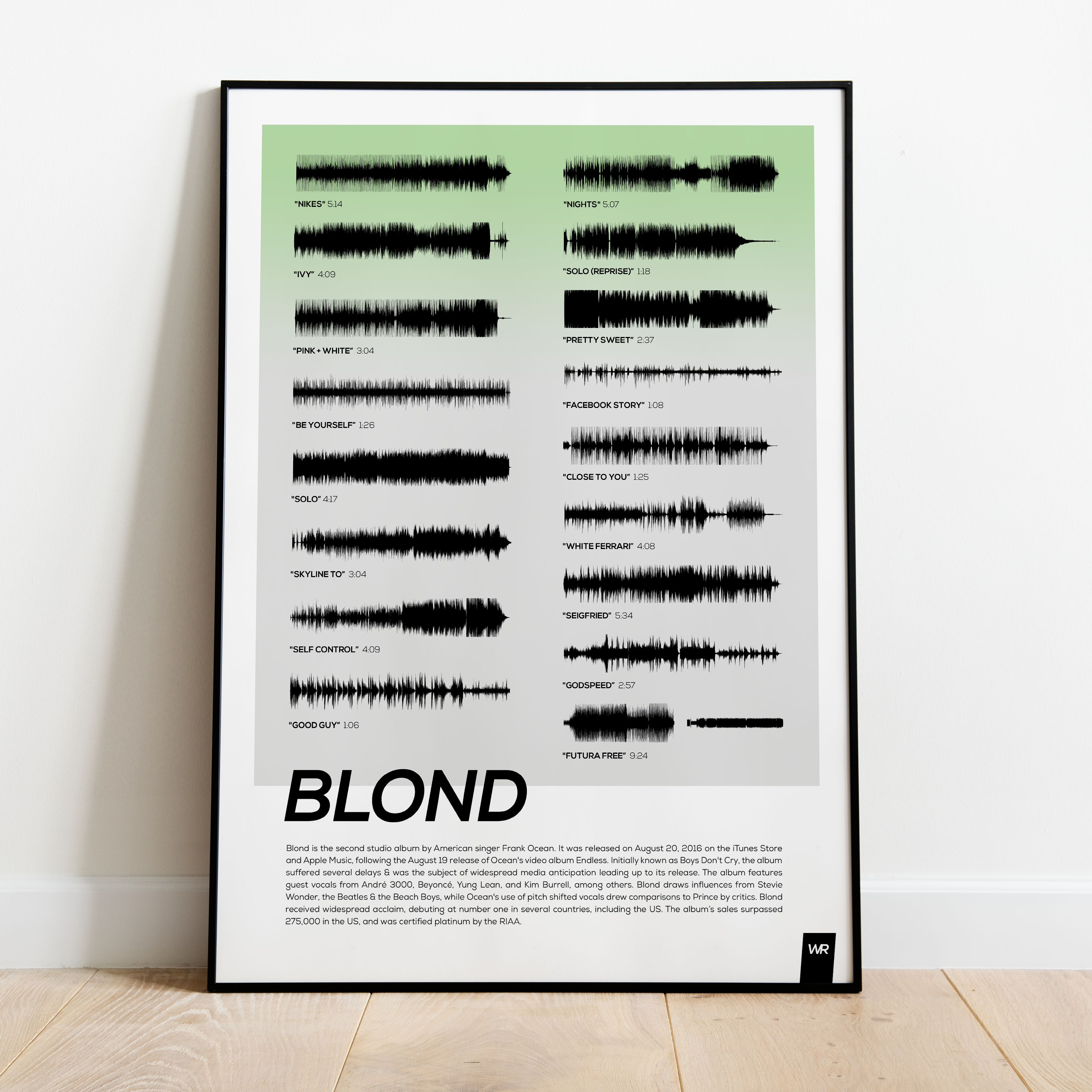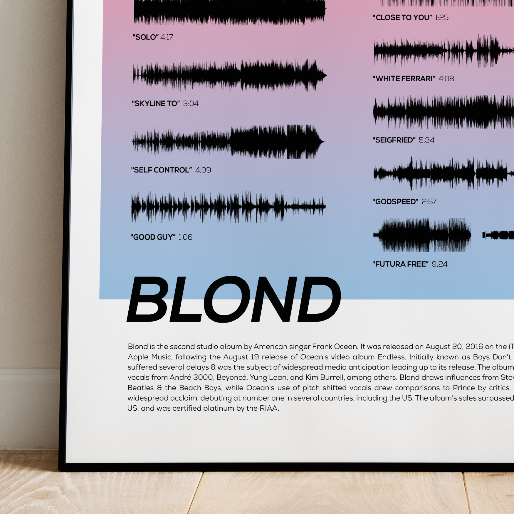 Make waves in your space with this unique soundwave album cover art for "Blond" by Frank Ocean, available in three sizes: 16x20, 18x24, and 24x36 inches. Each piece is printed on high-quality 150GSM paper using industry-grade archival inks. Elevate your artwork by pairing it with a handcrafted, 100% hardwood frame in black, white, or natural wood, complete with hanging hardware for easy install & display. Certified authentic, each track’s soundwave is extrapolated using The Wav Room's lossless audio transcribing process, making it a must-have for Frank Ocean music enthusiasts.