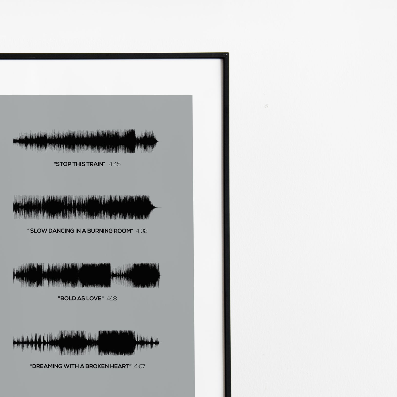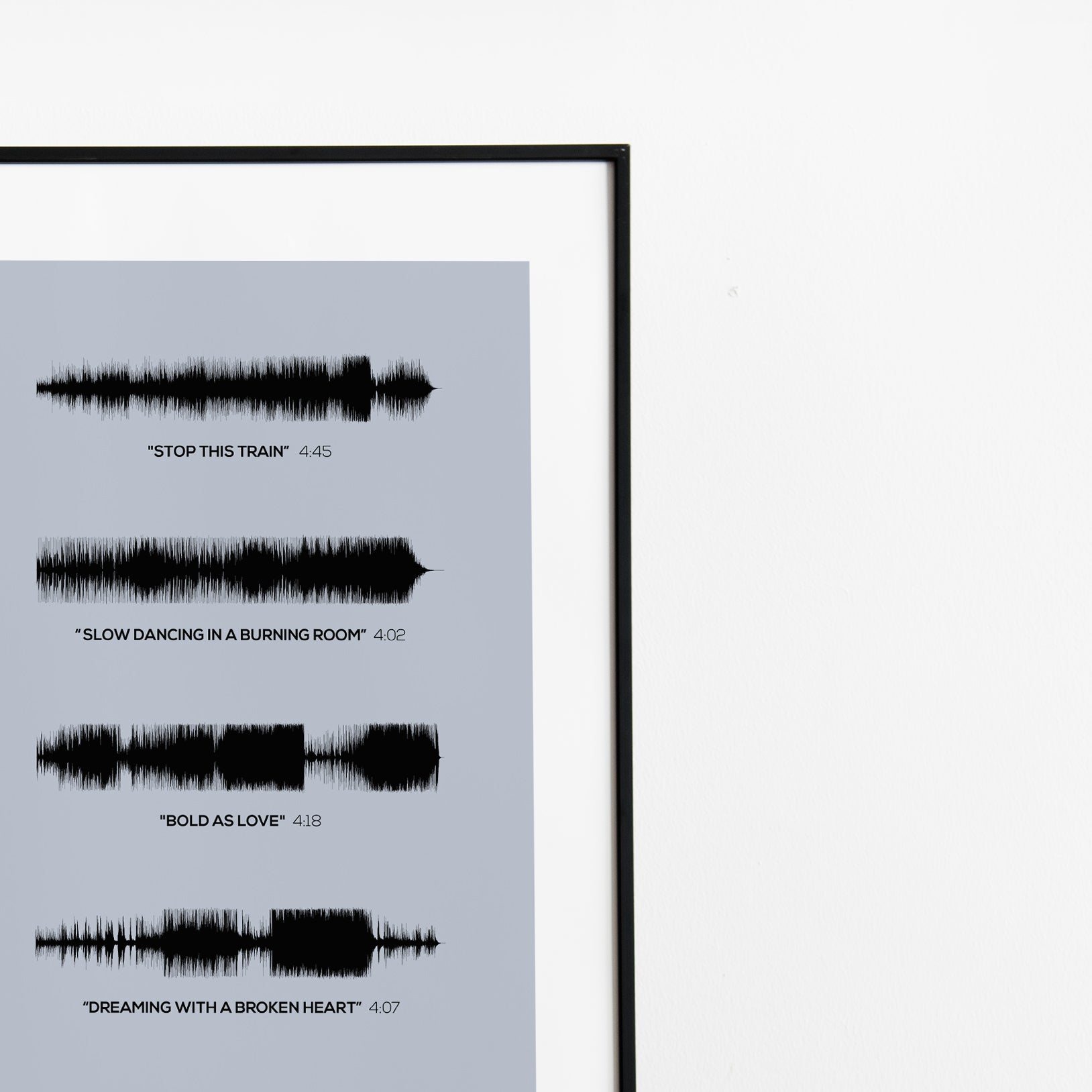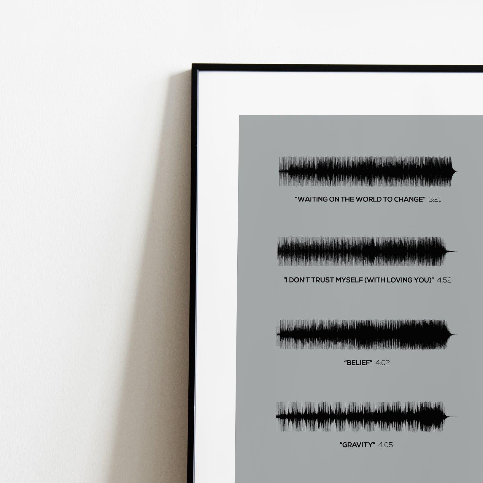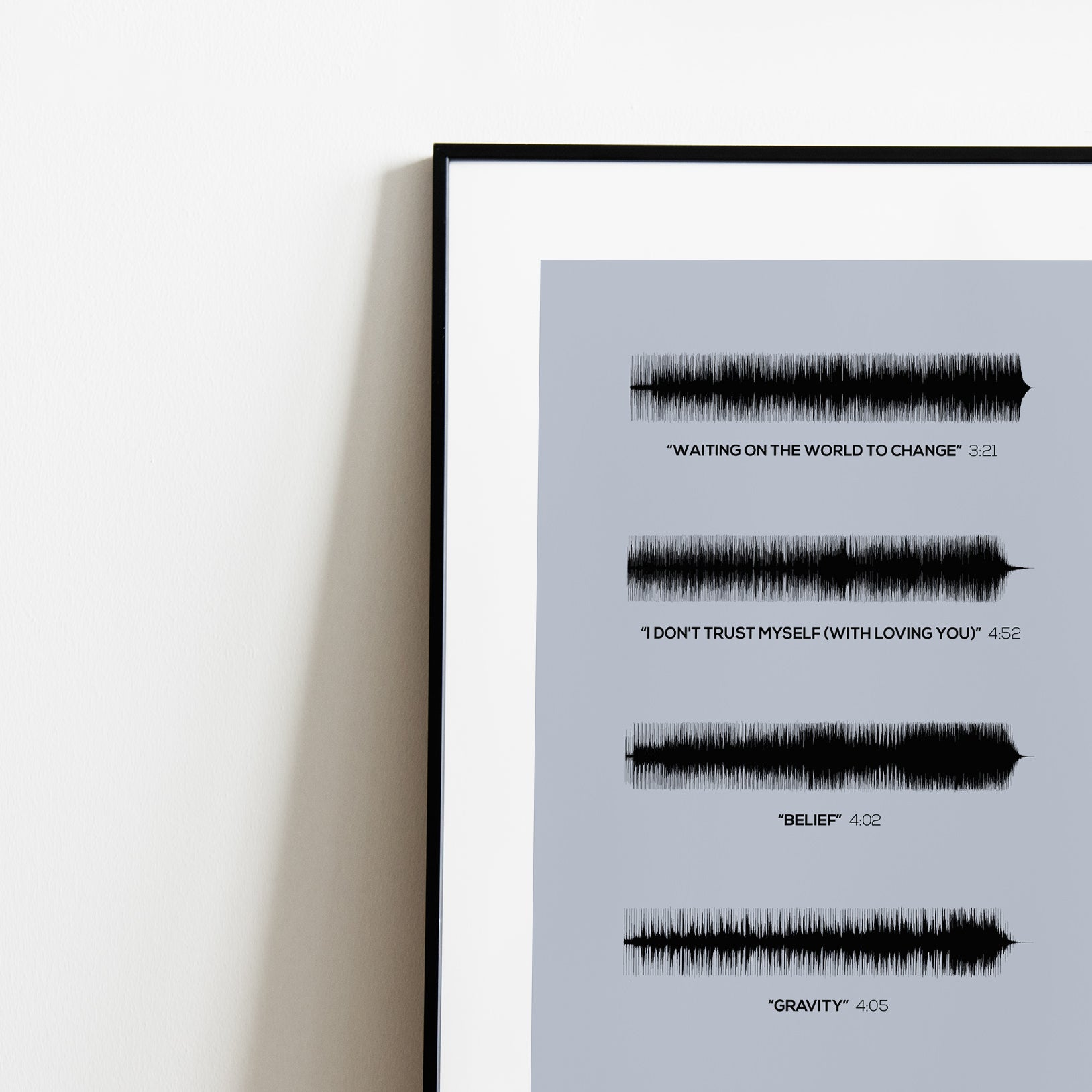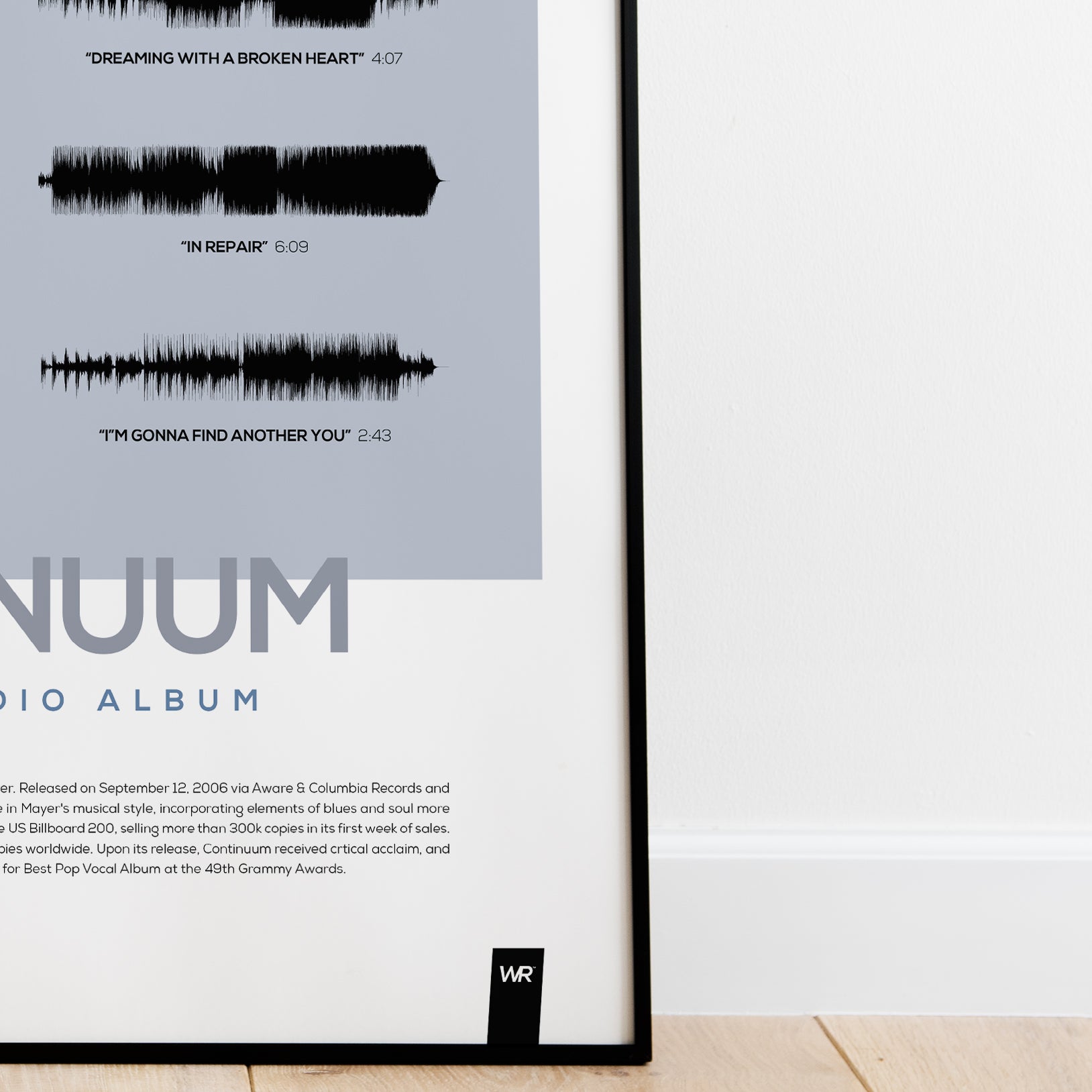 Make waves in your space with this unique soundwave album cover art for "Continuum" by John Mayer, available in three sizes: 16x20, 18x24, and 24x36 inches. Each piece is printed on high-quality 150GSM paper using industry-grade archival inks. Elevate your artwork by pairing it with a handcrafted, 100% hardwood frame in black, white, or natural wood, complete with hanging hardware for easy install & display. Certified authentic, each track’s soundwave is extrapolated using The Wav Room's lossless audio transcribing process, making it a must-have for John Mayer music enthusiasts.