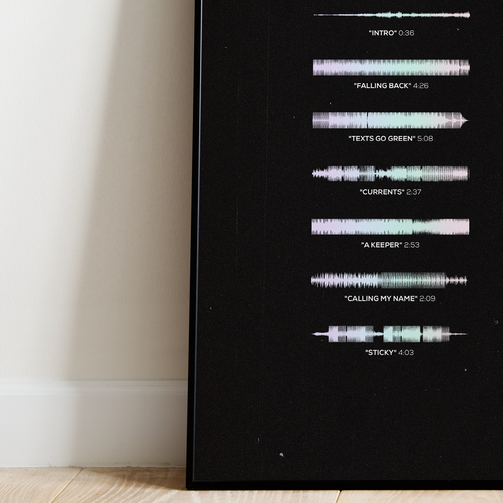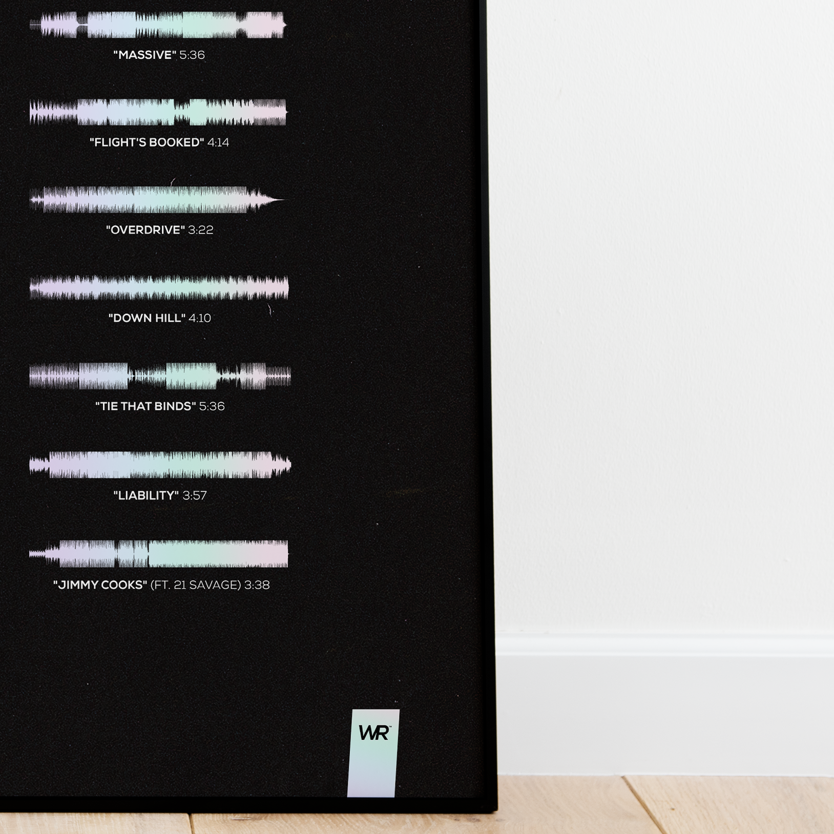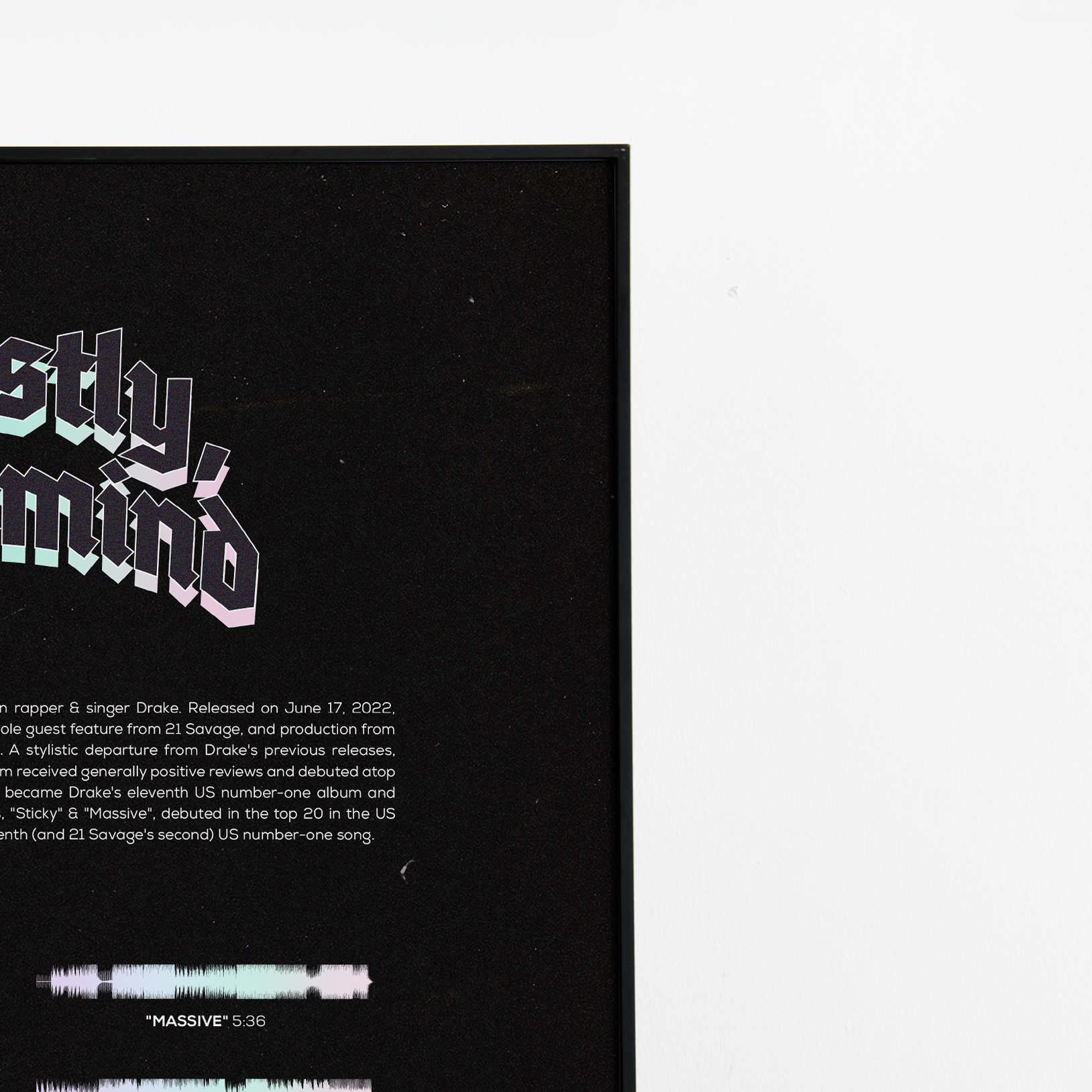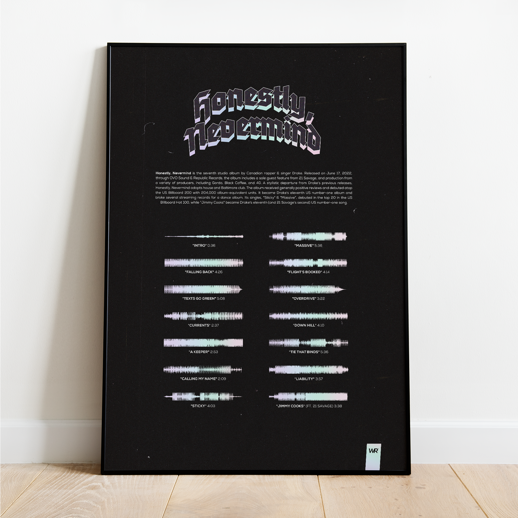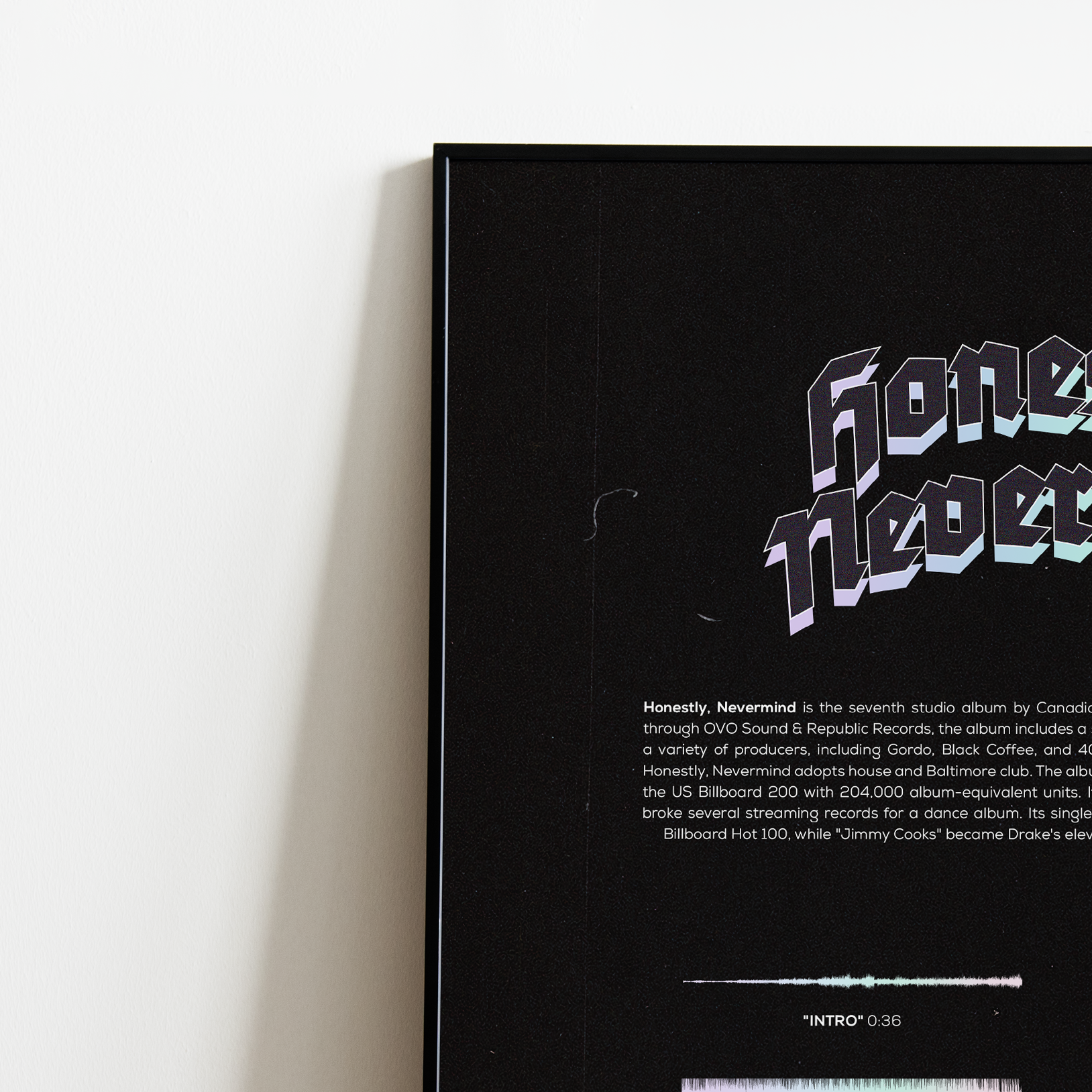 Make waves in your space with this unique soundwave album cover art for "Honestly, Nevermind" by Drake, available in three sizes: 16x20, 18x24, and 24x36 inches. Each piece is printed on high-quality 150GSM paper using industry-grade archival inks. Elevate your artwork by pairing it with a handcrafted, 100% hardwood frame in black, white, or natural wood, complete with hanging hardware for easy install & display. Certified authentic, each track’s soundwave is extrapolated using The Wav Room's lossless audio transcribing process, making it a must-have for Drake music enthusiasts.