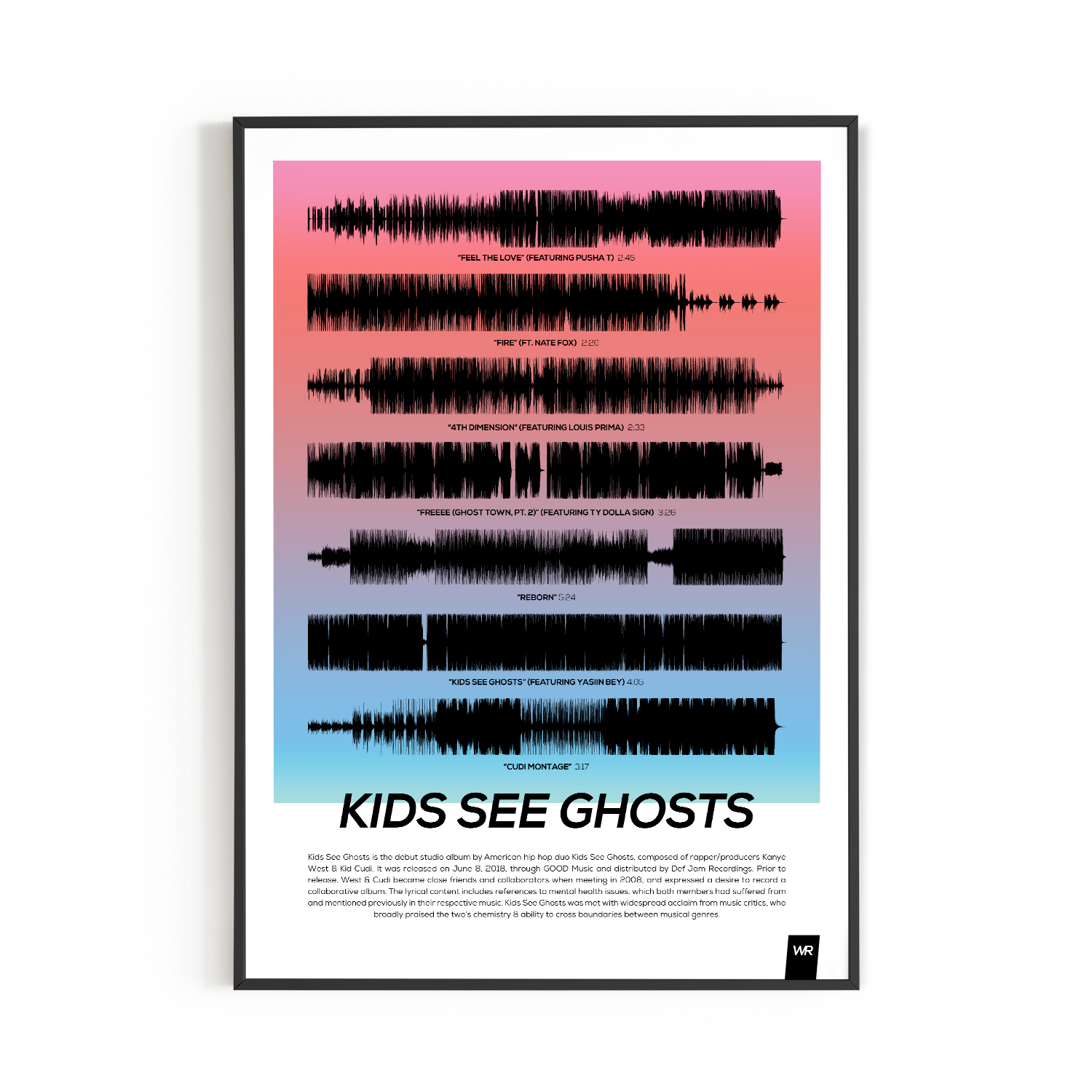 Make waves in your space with this unique soundwave album cover art for "Kids See Ghosts" by Kanye West & Kid Cudi, available in three sizes: 16x20, 18x24, and 24x36 inches. Each piece is printed on high-quality 150GSM paper using industry-grade archival inks. Elevate your artwork by pairing it with a handcrafted, 100% hardwood frame in black, white, or natural wood, complete with hanging hardware for easy install & display. Certified authentic, each track’s soundwave is extrapolated using The Wav Room's lossless audio transcribing process, making it a must-have for Kanye West & Kid Cudi music enthusiasts.
