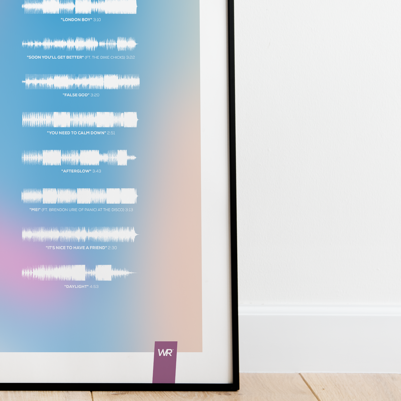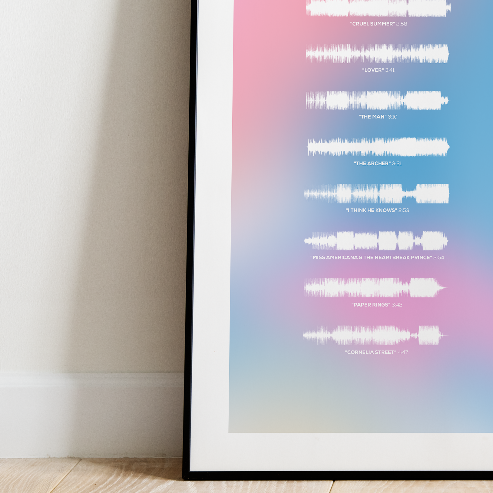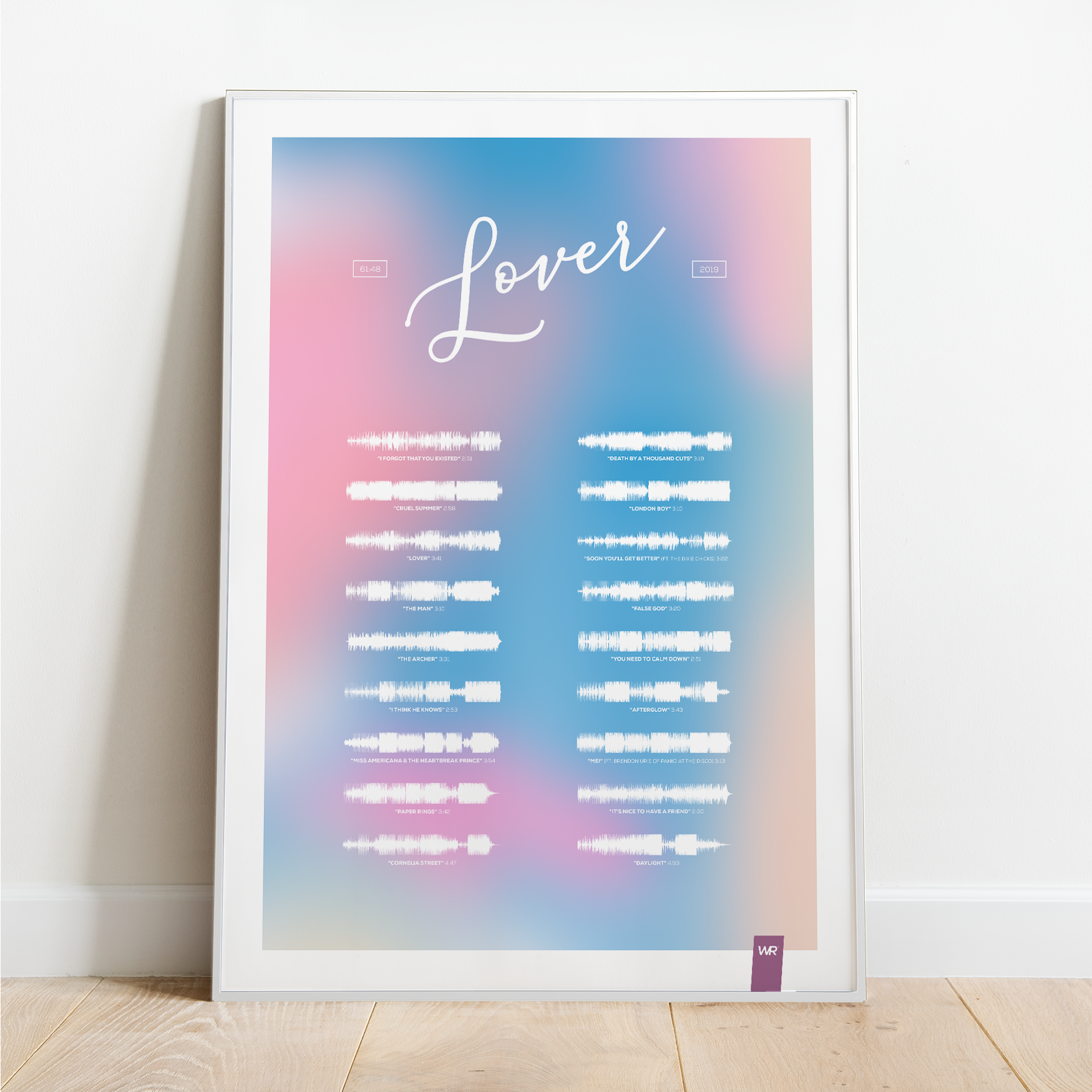 Make waves in your space with this unique soundwave album cover art for "Lover" by TS, available in three sizes: 16x20, 18x24, and 24x36 inches. Each piece is printed on high-quality 150GSM paper using industry-grade archival inks. Elevate your artwork by pairing it with a handcrafted, 100% hardwood frame in black, white, or natural wood, complete with hanging hardware for easy install & display. Certified authentic, each track’s soundwave is extrapolated using The Wav Room's lossless audio transcribing process, making it a must-have for TS music enthusiasts.