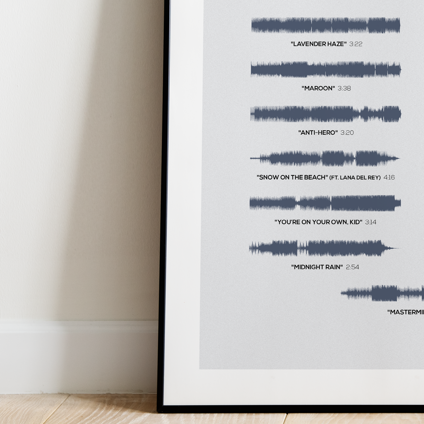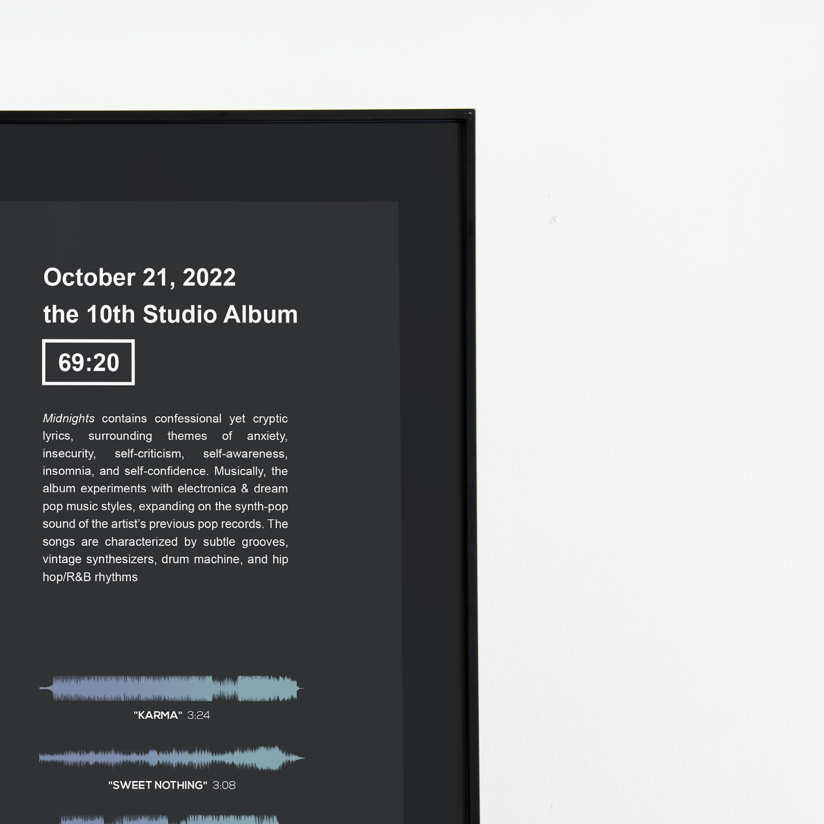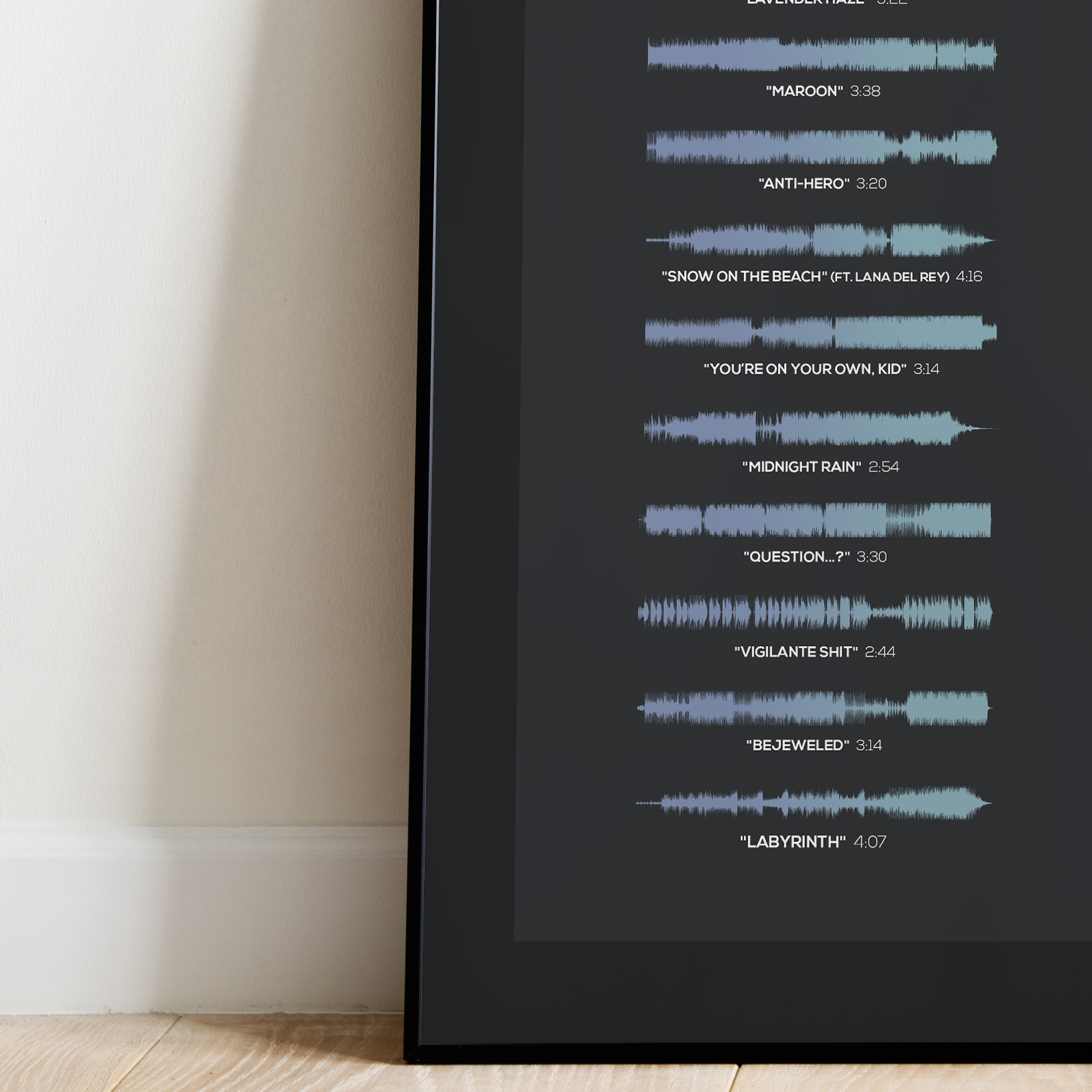 Make waves in your space with this unique soundwave album cover art for "Midnights" by TS, available in three sizes: 16x20, 18x24, and 24x36 inches. Each piece is printed on high-quality 150GSM paper using industry-grade archival inks. Elevate your artwork by pairing it with a handcrafted, 100% hardwood frame in black, white, or natural wood, complete with hanging hardware for easy install & display. Certified authentic, each track’s soundwave is extrapolated using The Wav Room's lossless audio transcribing process, making it a must-have for TS music enthusiasts.
