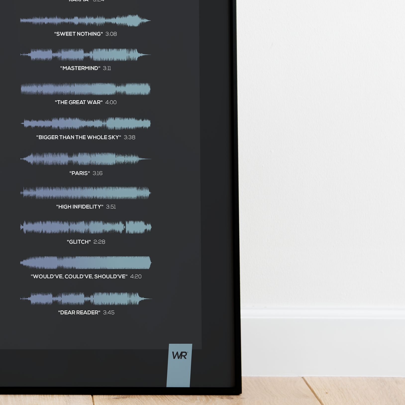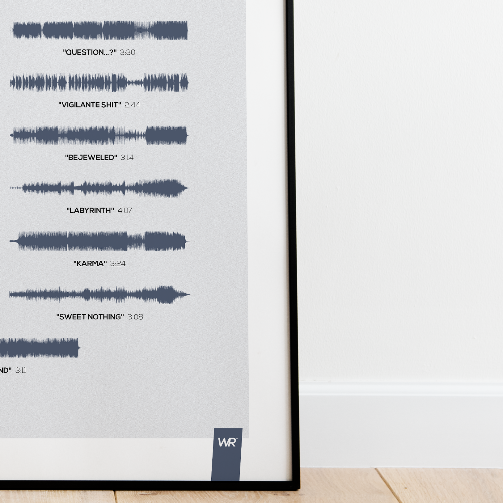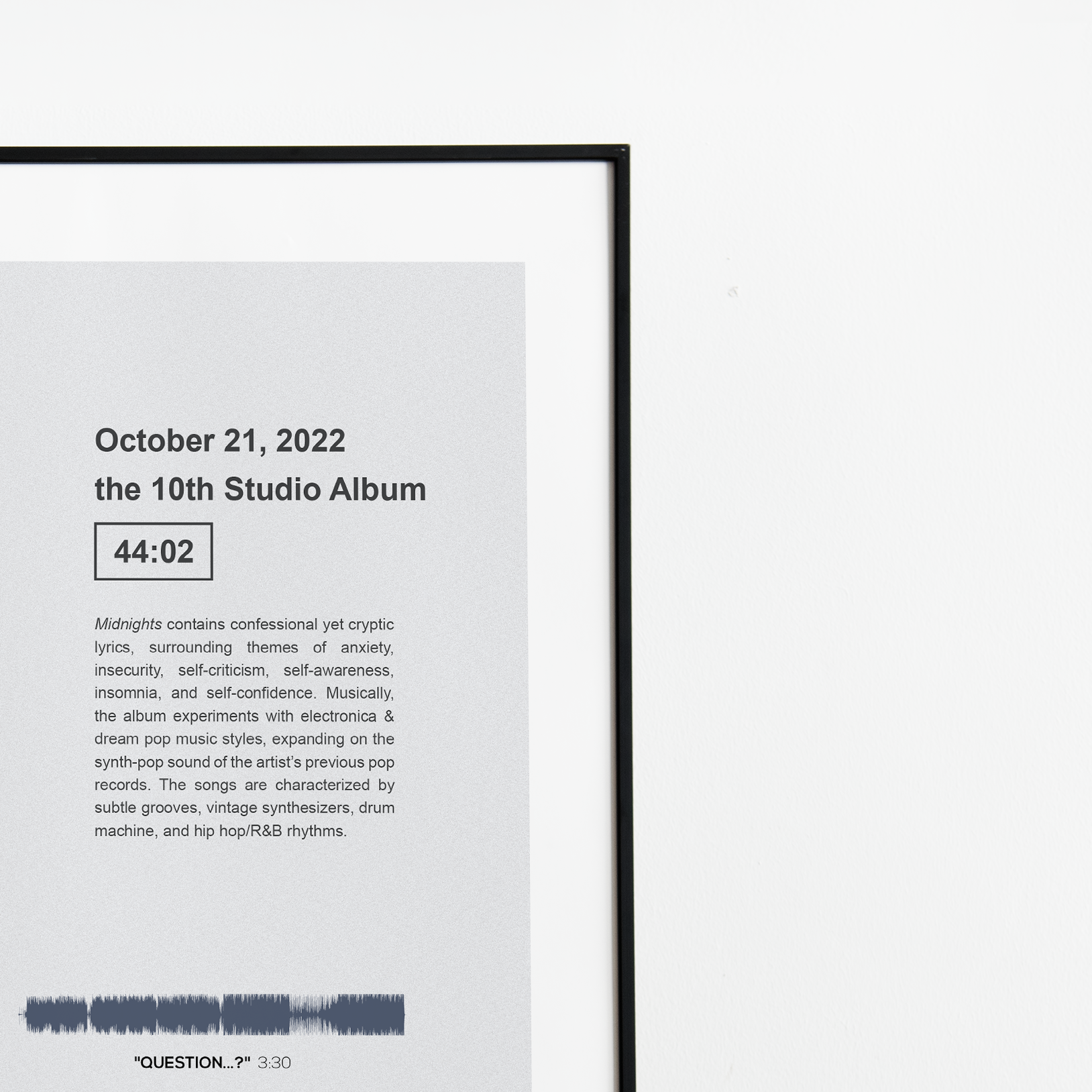 Make waves in your space with this unique soundwave album cover art for "Midnights" by TS, available in three sizes: 16x20, 18x24, and 24x36 inches. Each piece is printed on high-quality 150GSM paper using industry-grade archival inks. Elevate your artwork by pairing it with a handcrafted, 100% hardwood frame in black, white, or natural wood, complete with hanging hardware for easy install & display. Certified authentic, each track’s soundwave is extrapolated using The Wav Room's lossless audio transcribing process, making it a must-have for TS music enthusiasts.