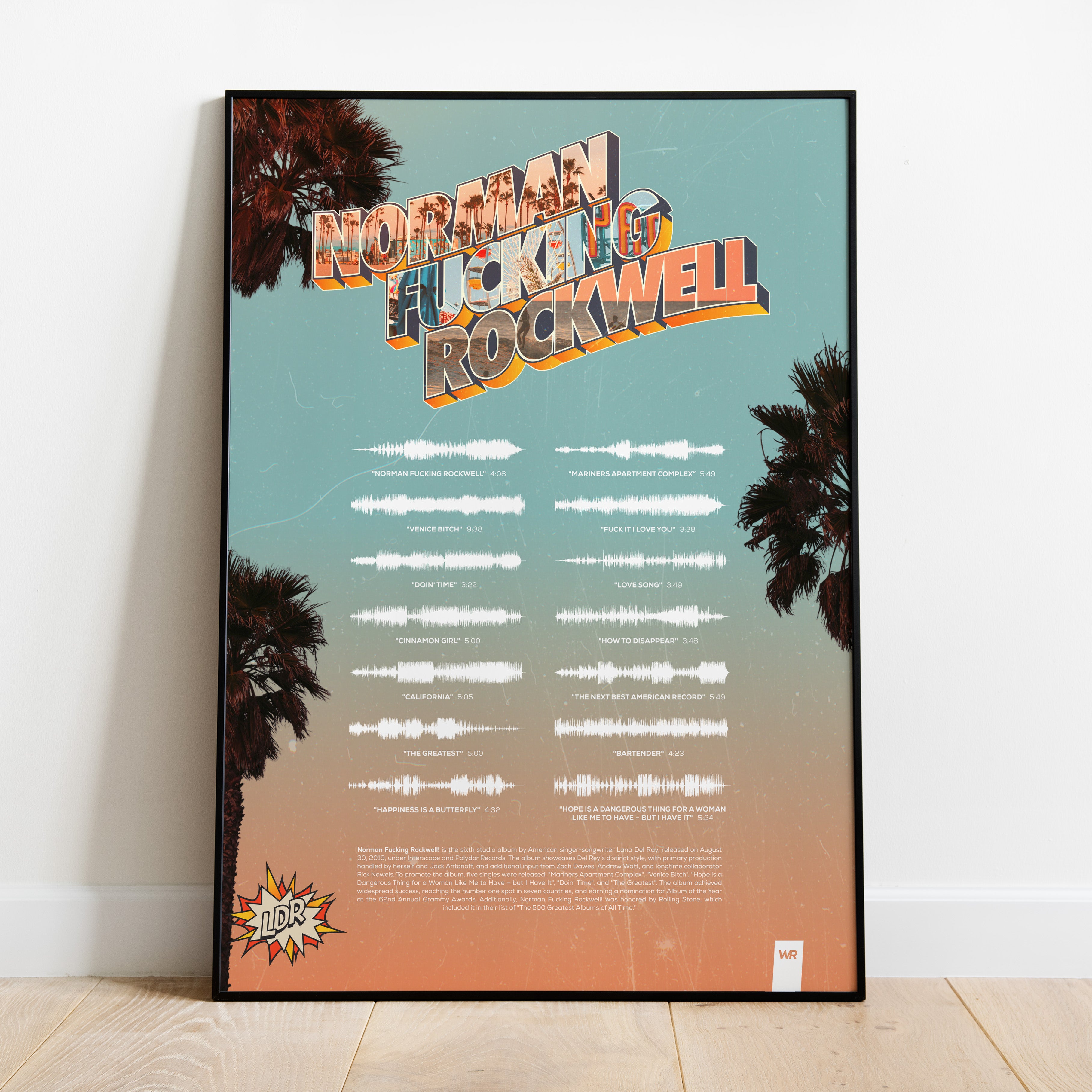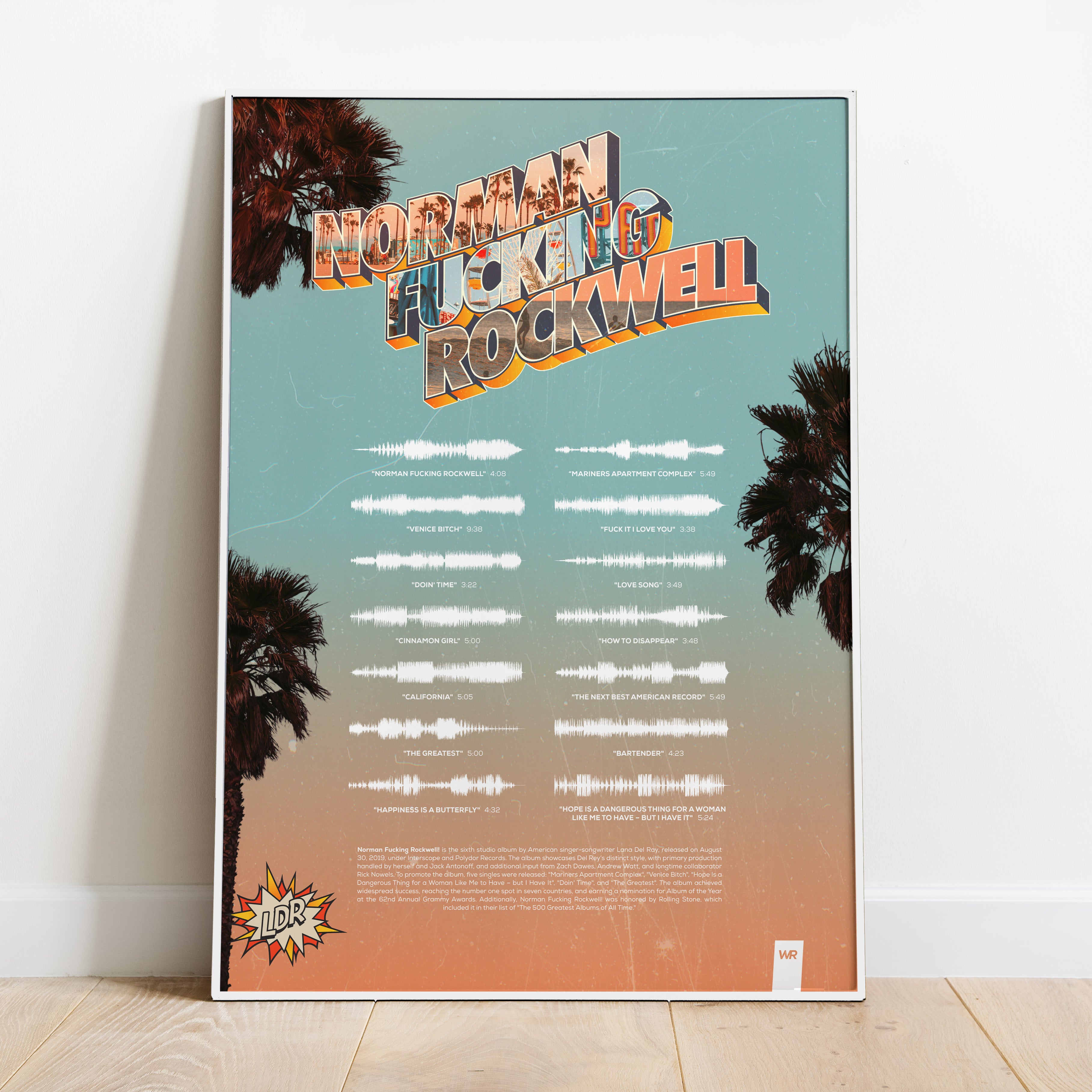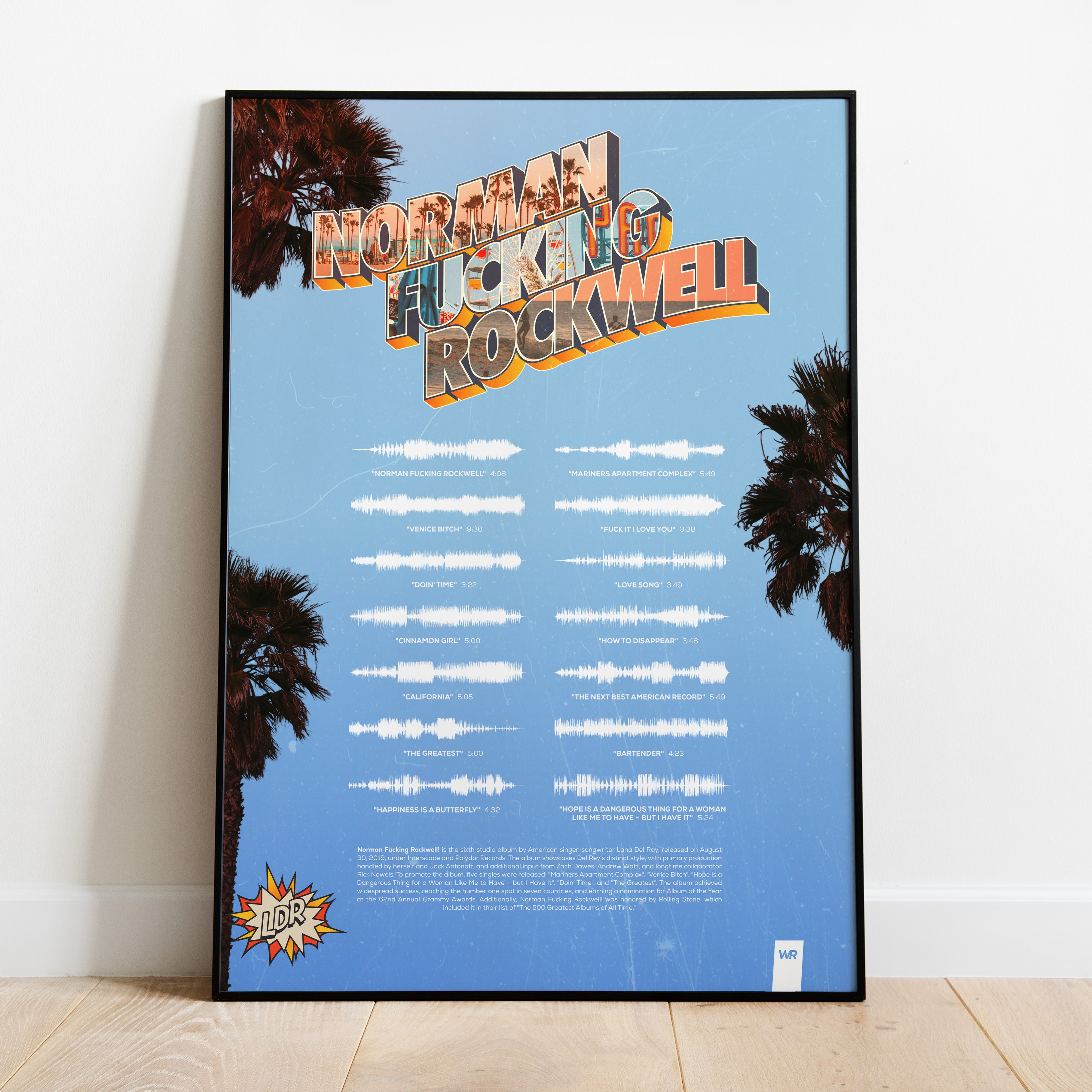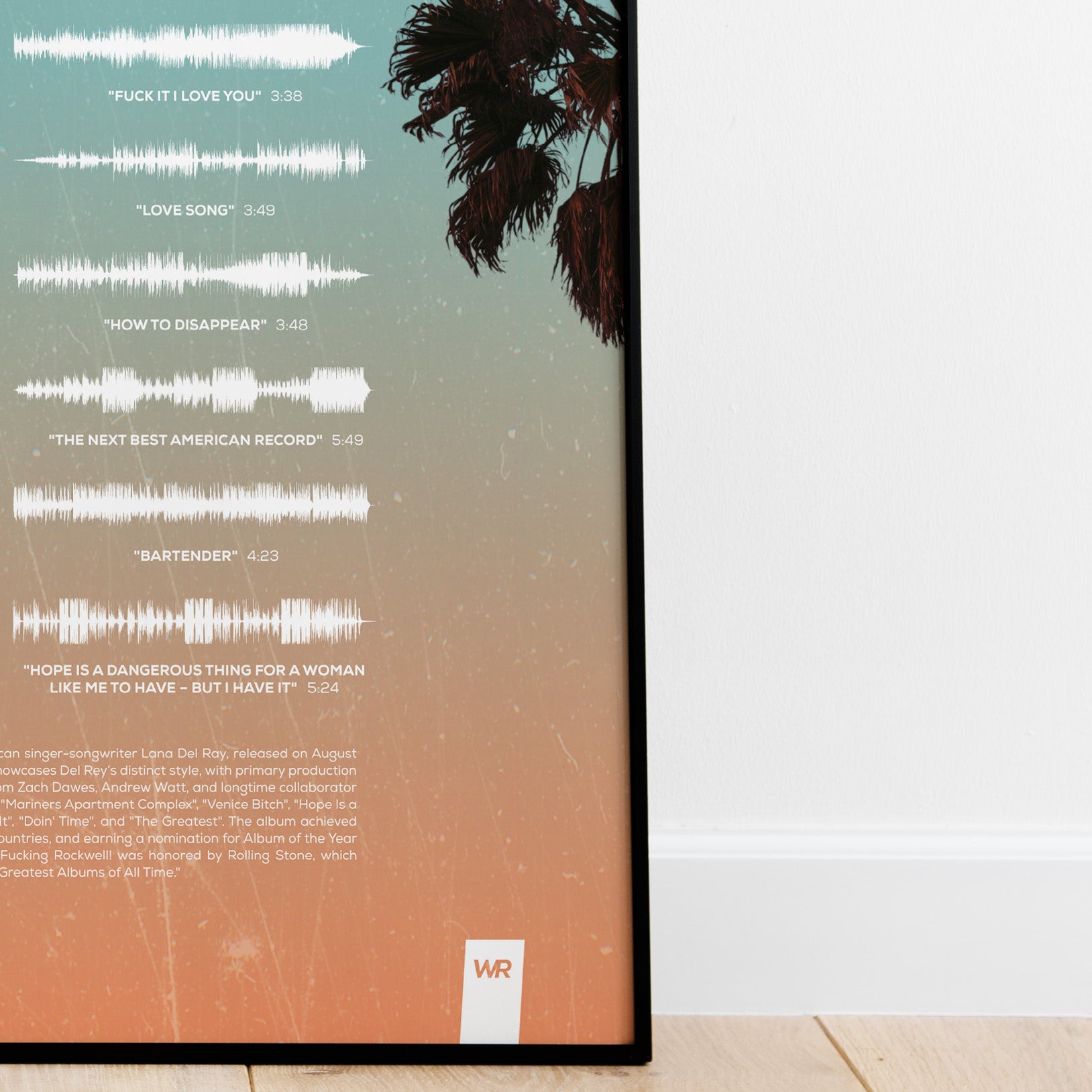 Make waves in your space with this unique soundwave album cover art for "Norman Fucking Rockwell!" by Lana Del Rey, available in three sizes: 16x20, 18x24, and 24x36 inches. Each piece is printed on high-quality 150GSM paper using industry-grade archival inks. Elevate your artwork by pairing it with a handcrafted, 100% hardwood frame in black, white, or natural wood, complete with hanging hardware for easy install & display. Certified authentic, each track’s soundwave is extrapolated using The Wav Room's lossless audio transcribing process, making it a must-have for Lana Del Rey music enthusiasts.