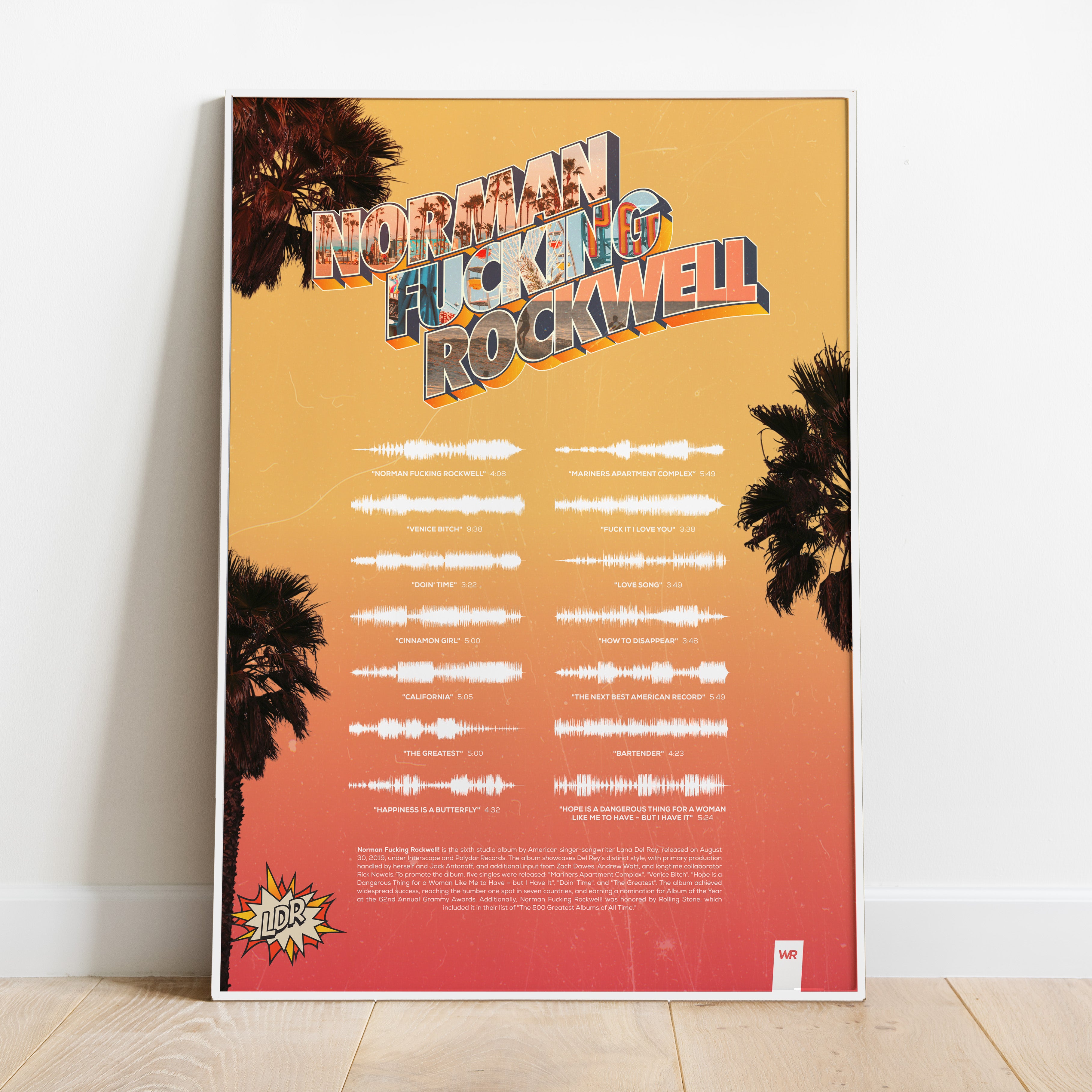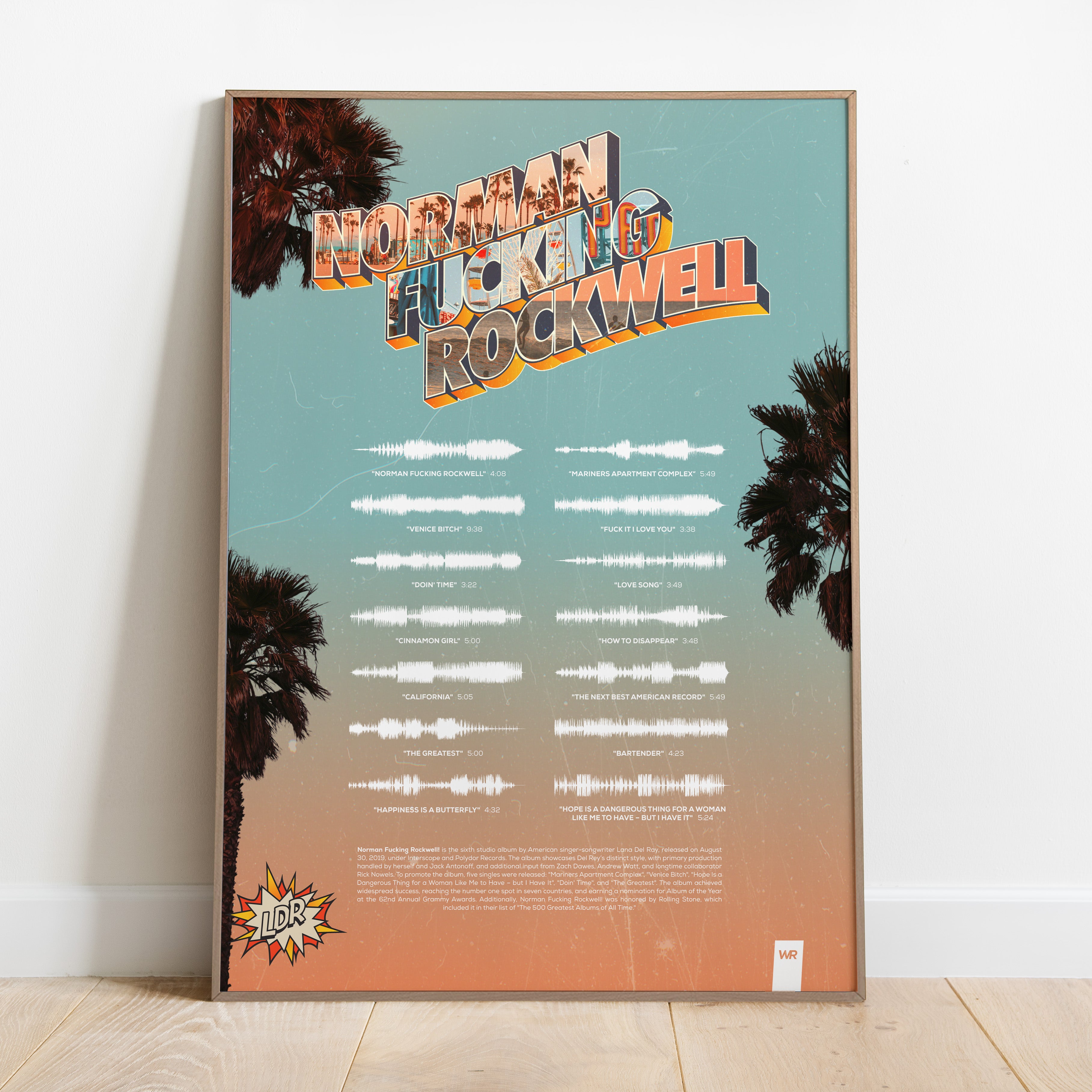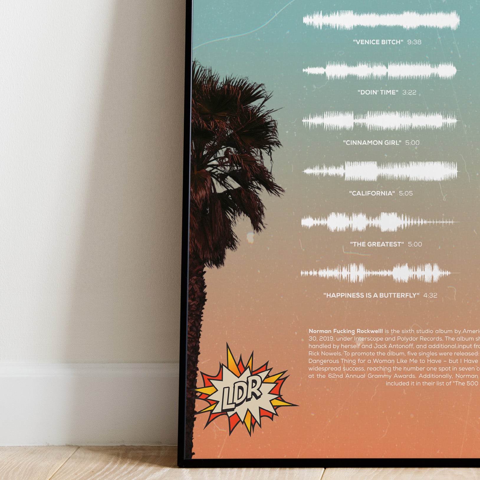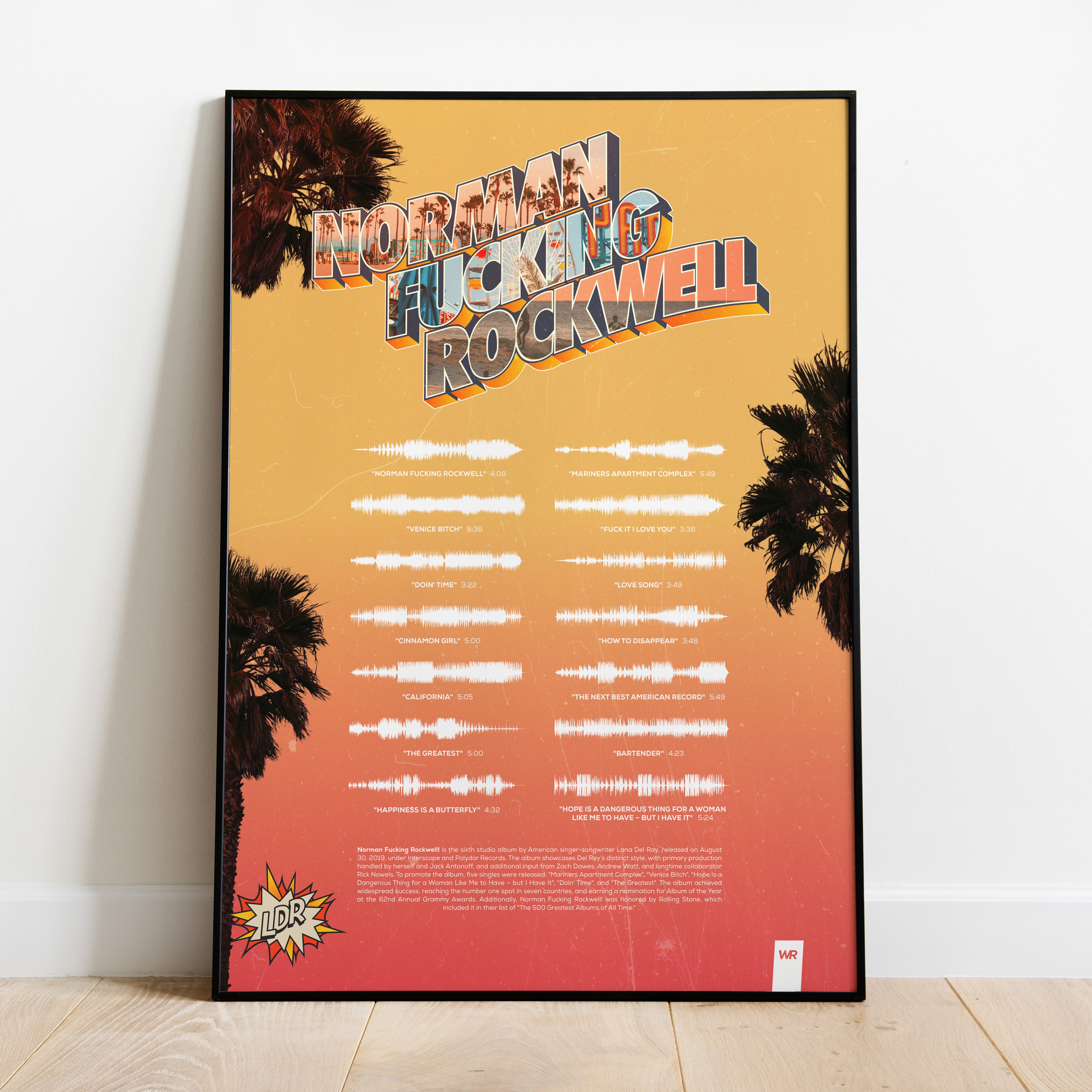Make waves in your space with this unique soundwave album cover art for "Norman Fucking Rockwell!" by Lana Del Rey, available in three sizes: 16x20, 18x24, and 24x36 inches. Each piece is printed on high-quality 150GSM paper using industry-grade archival inks. Elevate your artwork by pairing it with a handcrafted, 100% hardwood frame in black, white, or natural wood, complete with hanging hardware for easy install & display. Certified authentic, each track’s soundwave is extrapolated using The Wav Room's lossless audio transcribing process, making it a must-have for Lana Del Rey music enthusiasts.