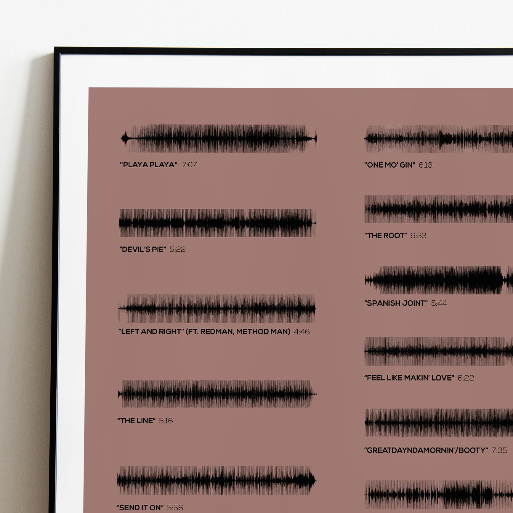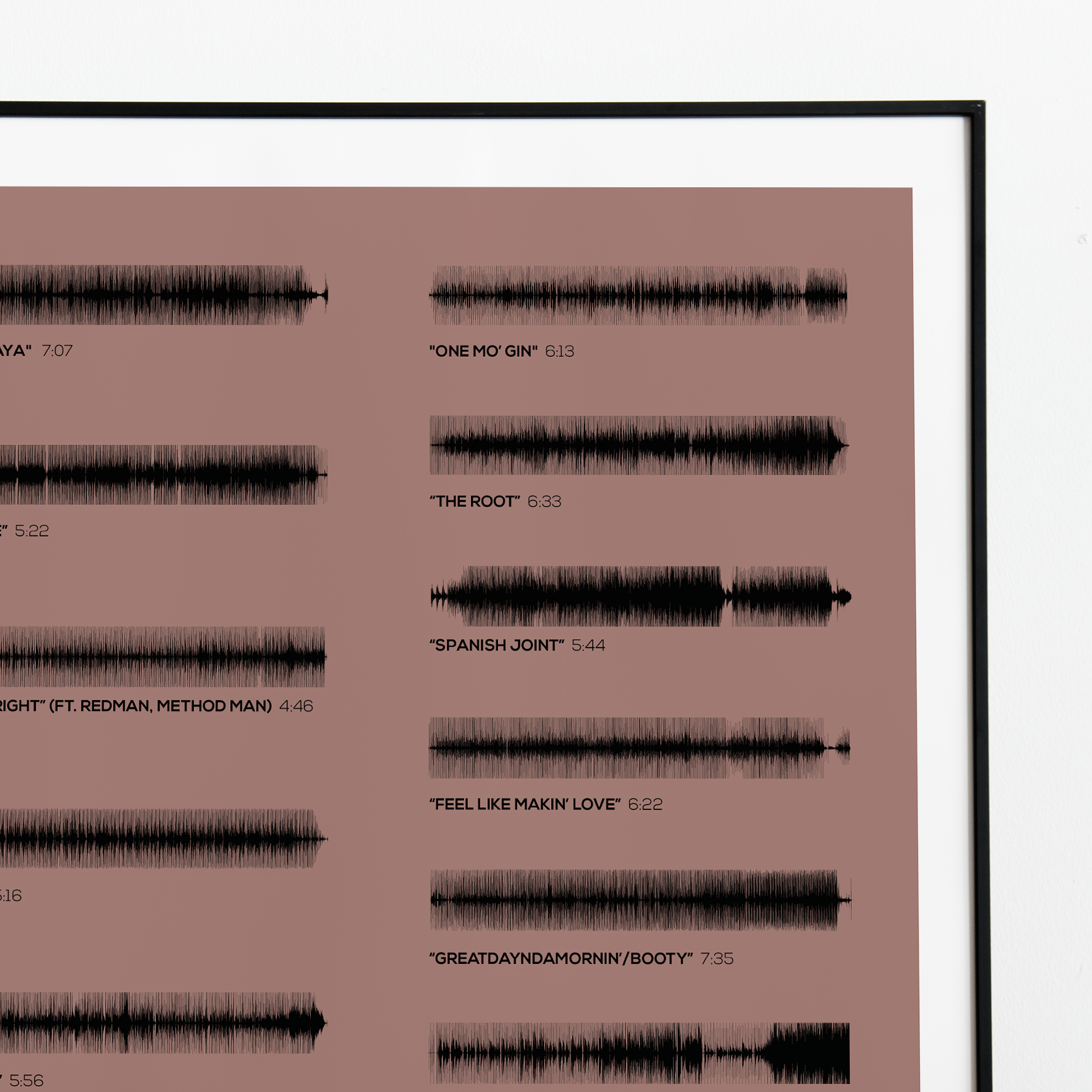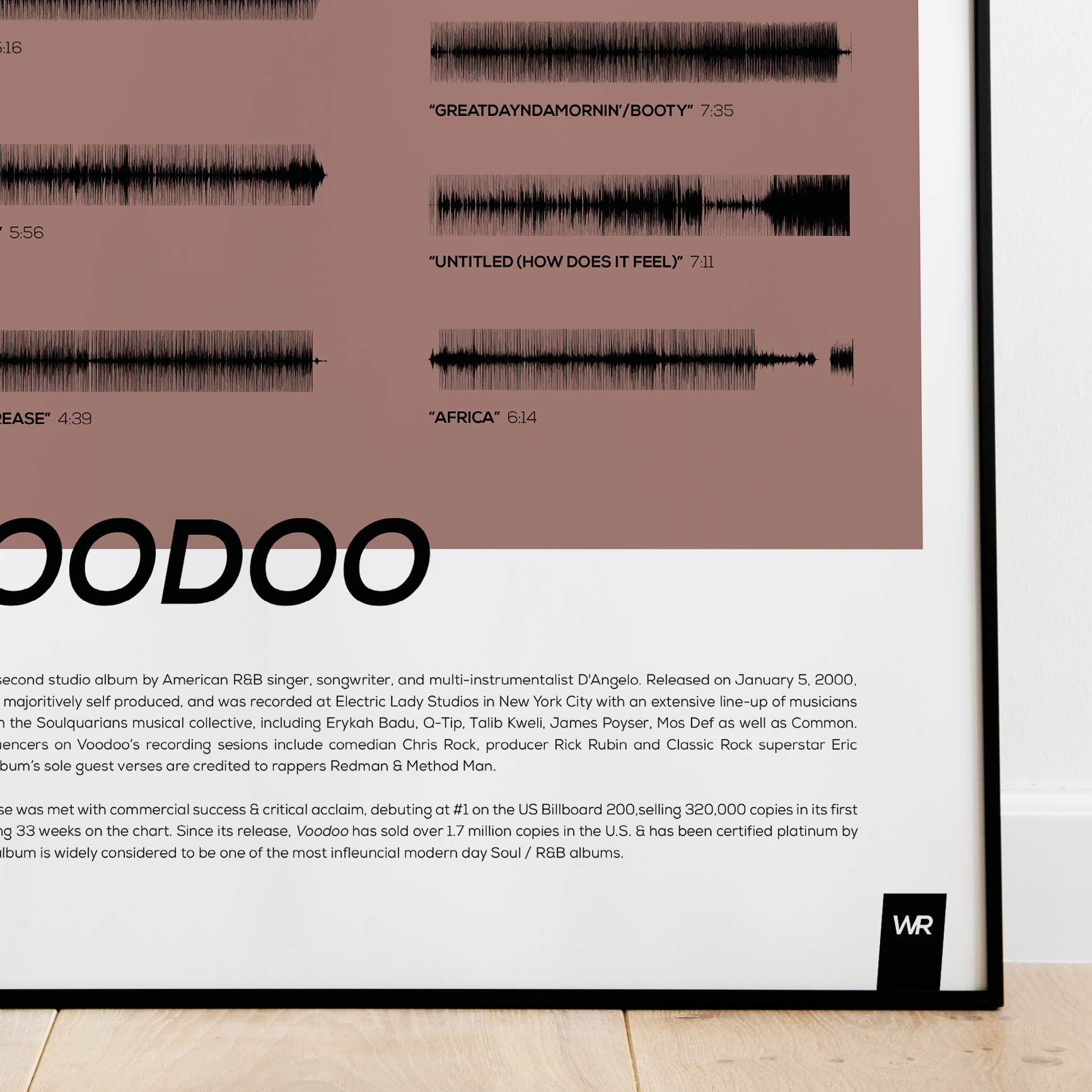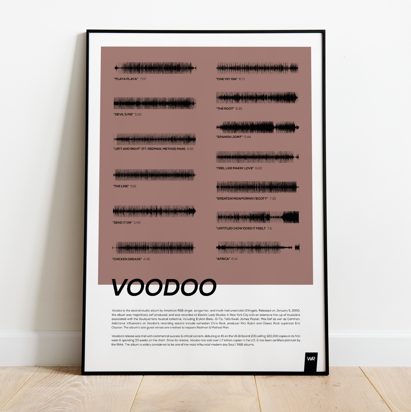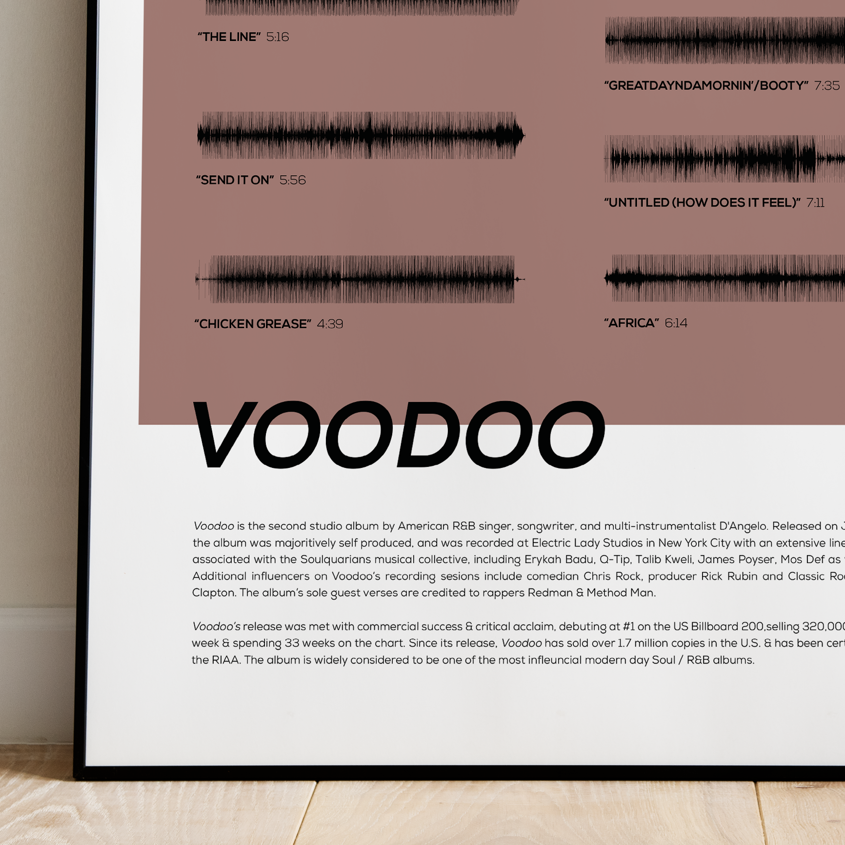 Make waves in your space with this unique soundwave album cover art for "Voodoo" by D'Angelo, available in three sizes: 16x20, 18x24, and 24x36 inches. Each piece is printed on high-quality 150GSM paper using industry-grade archival inks. Elevate your artwork by pairing it with a handcrafted, 100% hardwood frame in black, white, or natural wood, complete with hanging hardware for easy install & display. Certified authentic, each track’s soundwave is extrapolated using The Wav Room's lossless audio transcribing process, making it a must-have for D'Angelo music enthusiasts.