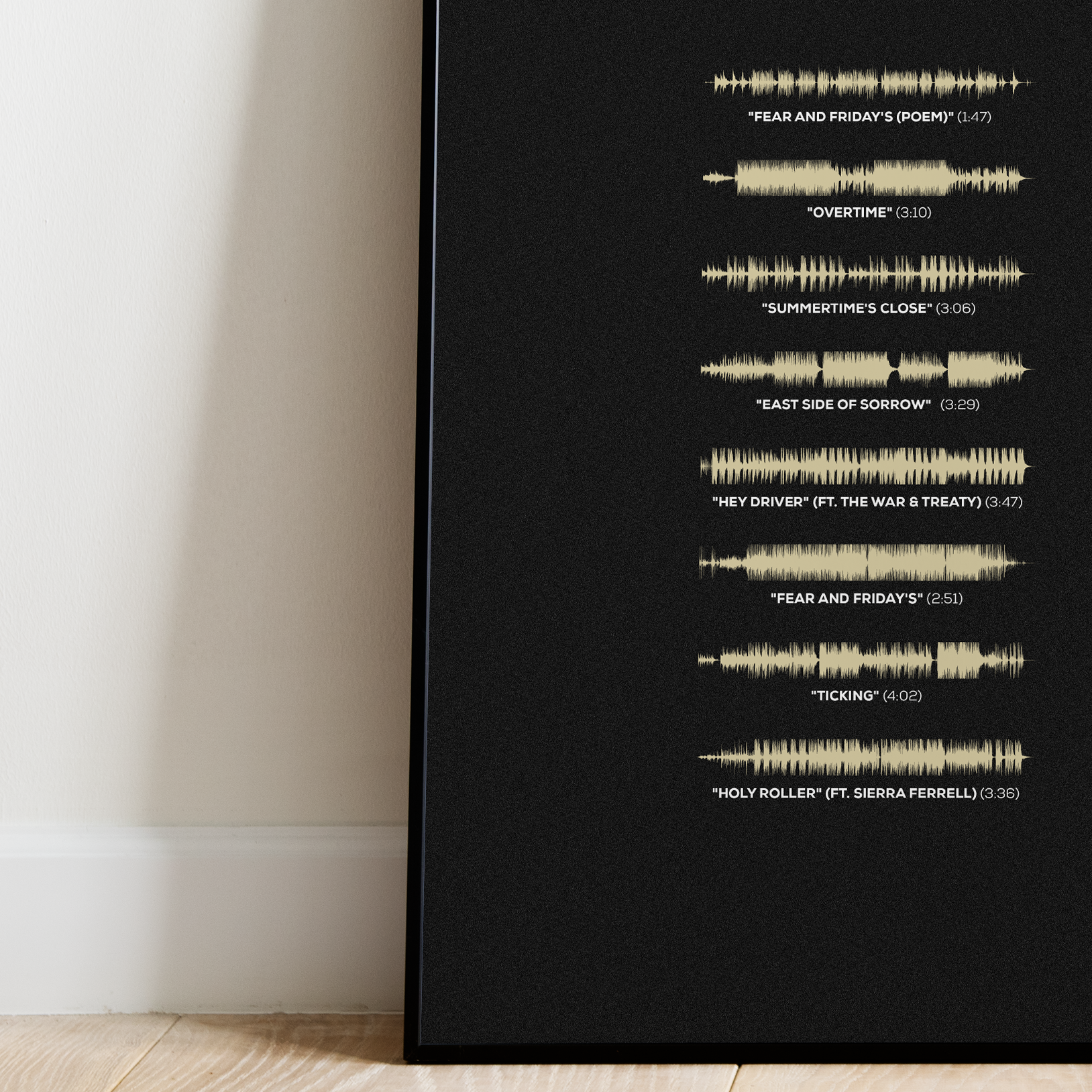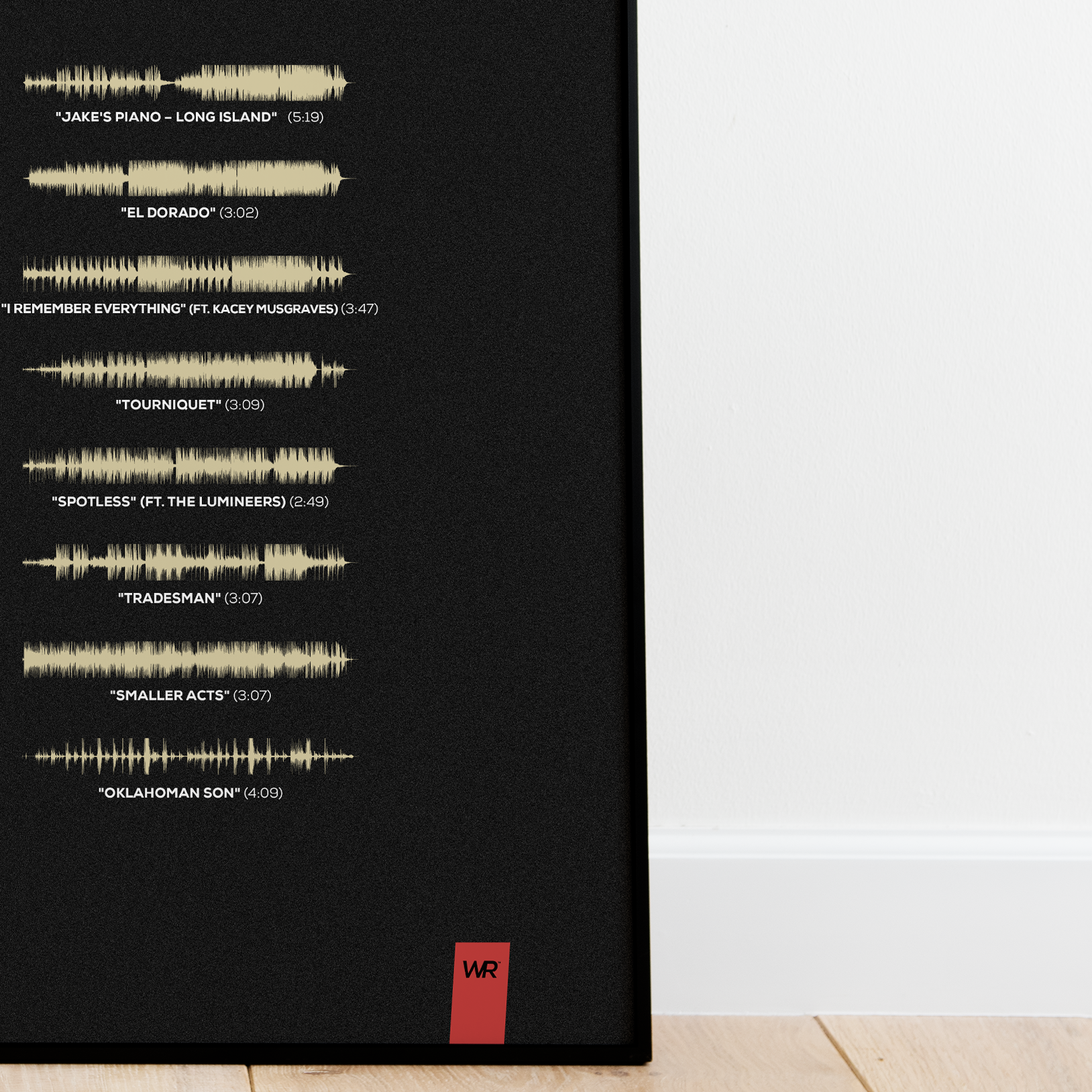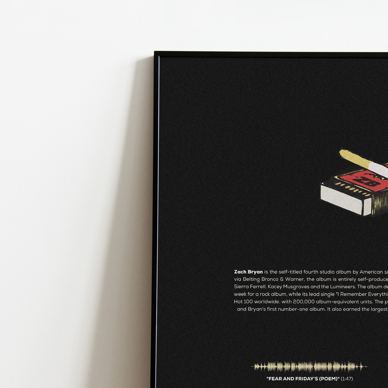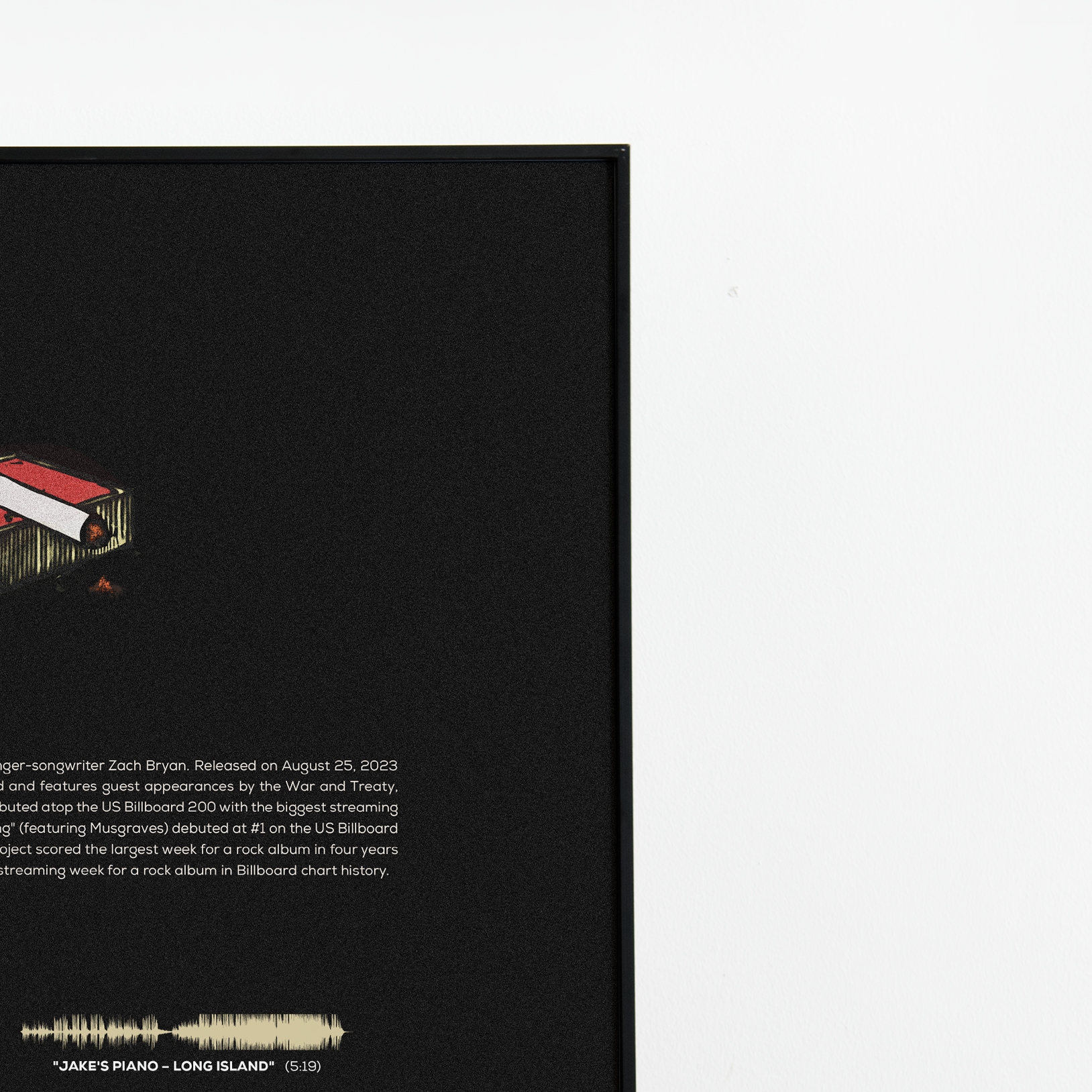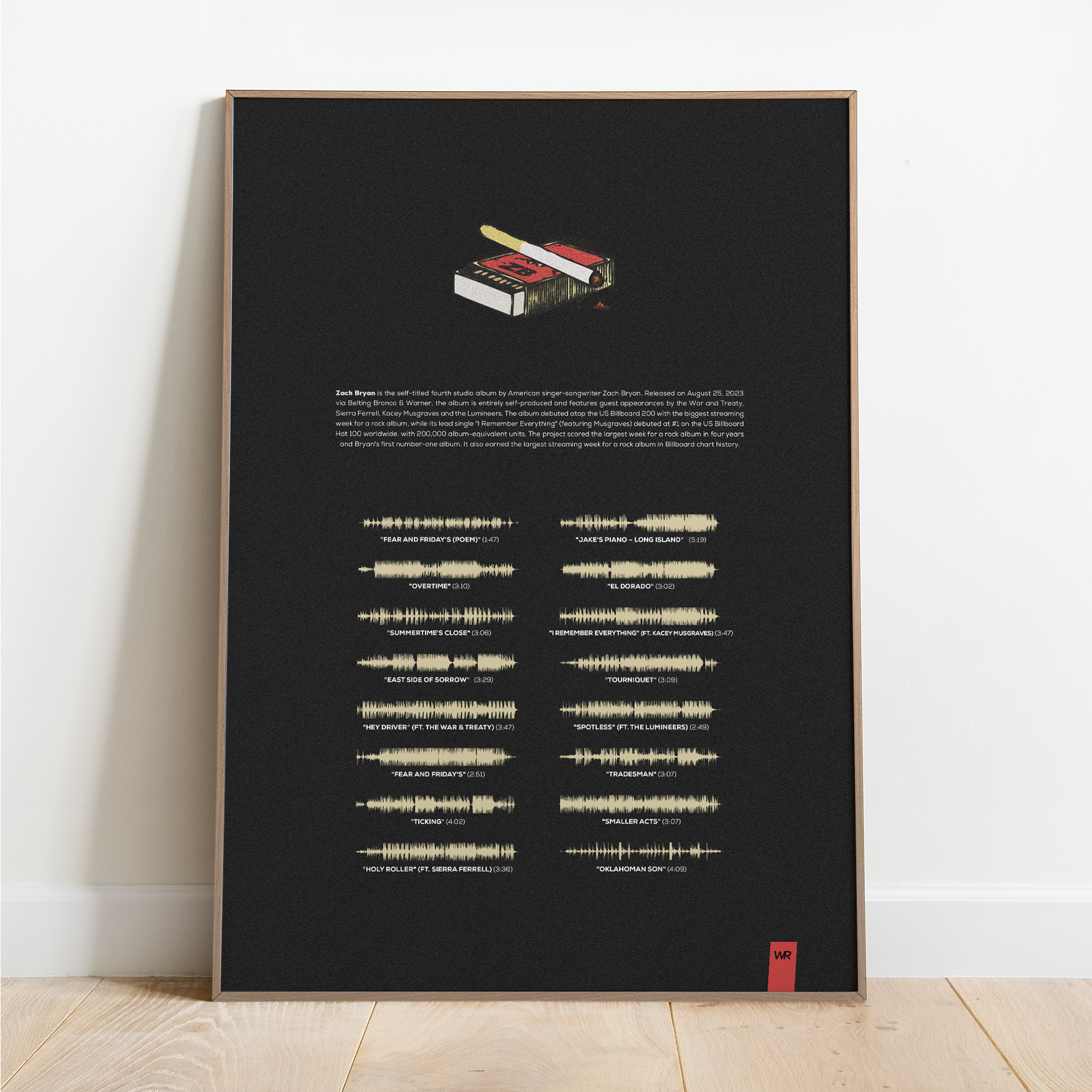 Make waves in your space with this unique soundwave album cover art for "Zach Bryan" by Zach Bryan, available in three sizes: 16x20, 18x24, and 24x36 inches. Each piece is printed on high-quality 150GSM paper using industry-grade archival inks. Elevate your artwork by pairing it with a handcrafted, 100% hardwood frame in black, white, or natural wood, complete with hanging hardware for easy install & display. Certified authentic, each track’s soundwave is extrapolated using The Wav Room's lossless audio transcribing process, making it a must-have for Zach Bryan music enthusiasts.