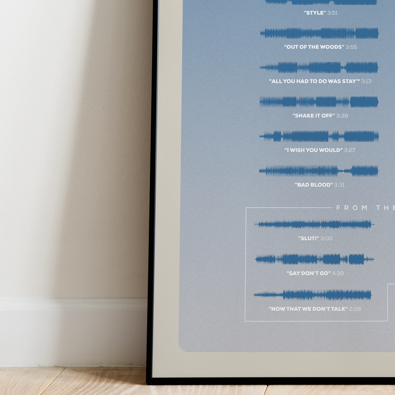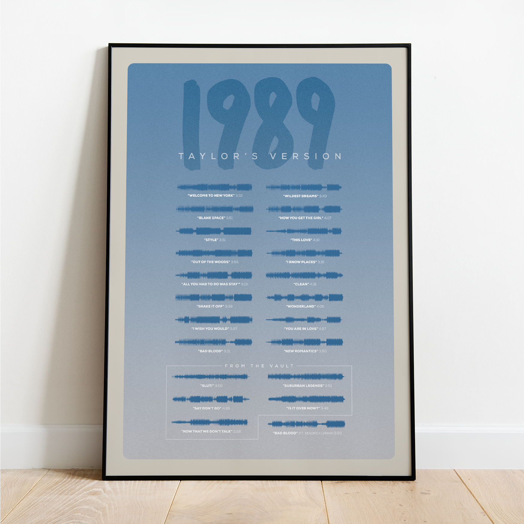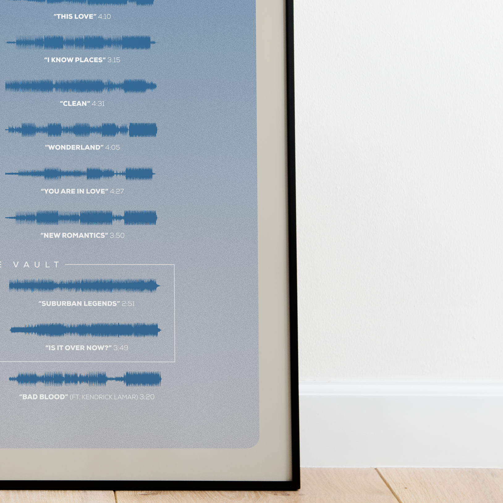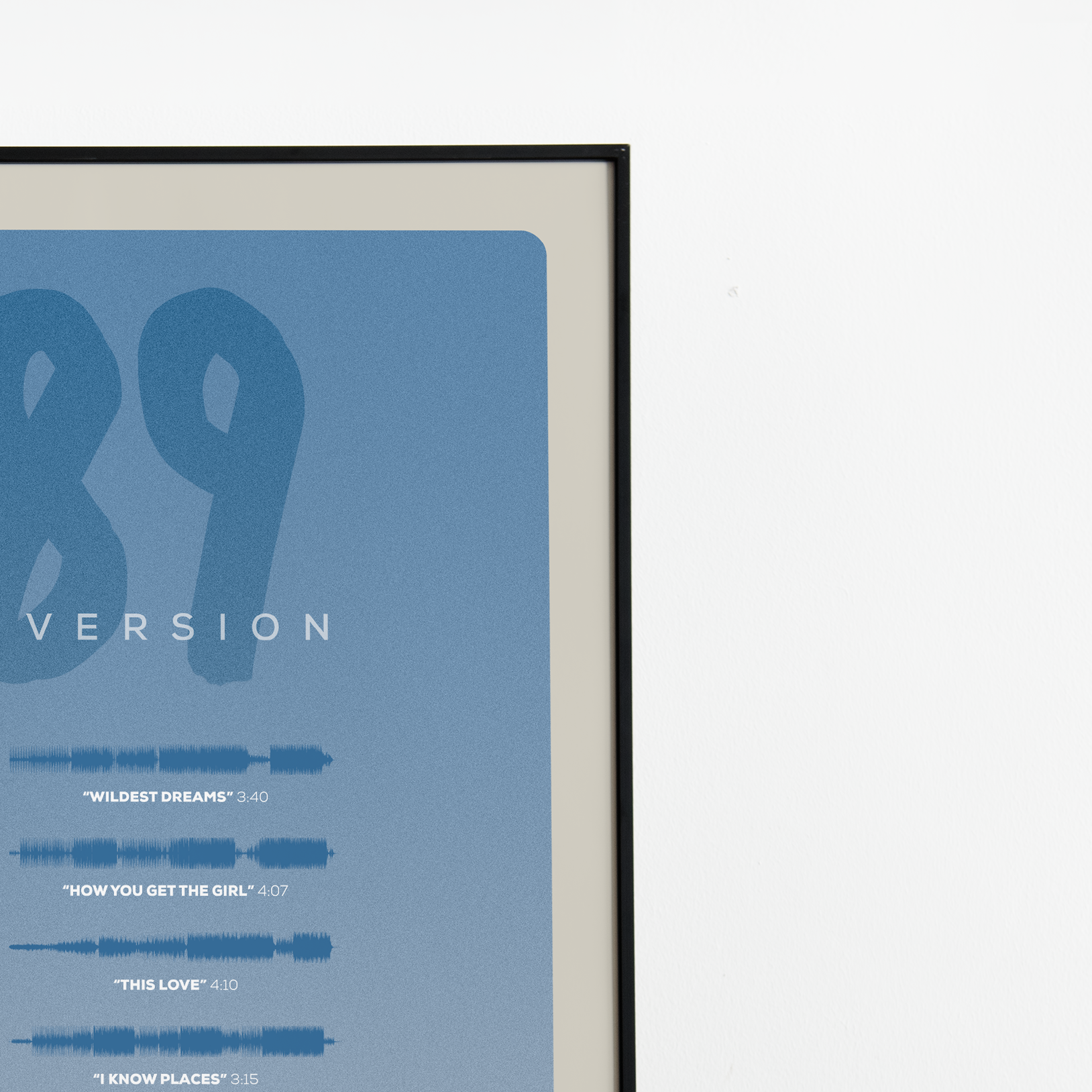 Make waves in your space with this unique soundwave album cover art for "1989 (Taylor's Version)" by TS, available in three sizes: 16x20, 18x24, and 24x36 inches. Each piece is printed on high-quality 150GSM paper using industry-grade archival inks. Elevate your artwork by pairing it with a handcrafted, 100% hardwood frame in black, white, or natural wood, complete with hanging hardware for easy install & display. Certified authentic, each track’s soundwave is extrapolated using The Wav Room's lossless audio transcribing process, making it a must-have for TS music enthusiasts.