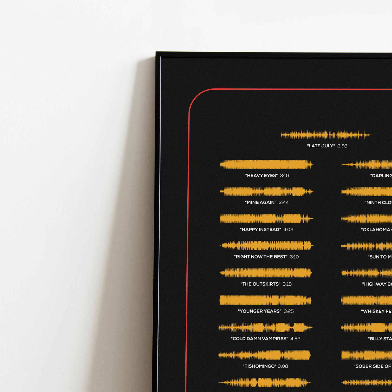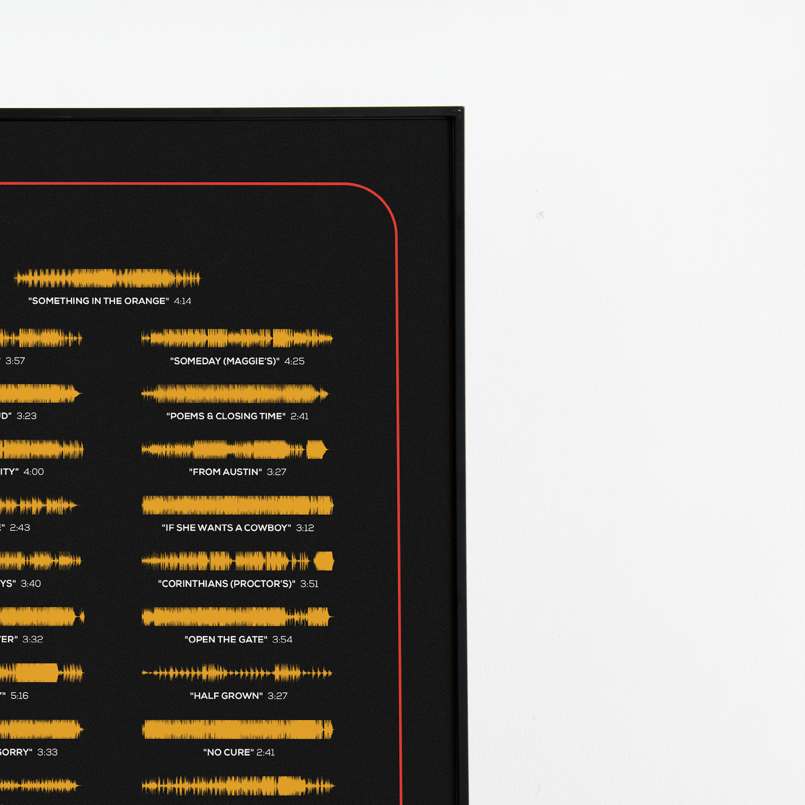 Make waves in your space with this unique soundwave album cover art for "American Heartbreak" by Zach Bryan, available in three sizes: 16x20, 18x24, and 24x36 inches. Each piece is printed on high-quality 150GSM paper using industry-grade archival inks. Elevate your artwork by pairing it with a handcrafted, 100% hardwood frame in black, white, or natural wood, complete with hanging hardware for easy install & display. Certified authentic, each track’s soundwave is extrapolated using The Wav Room's lossless audio transcribing process, making it a must-have for Zach Bryan music enthusiasts.