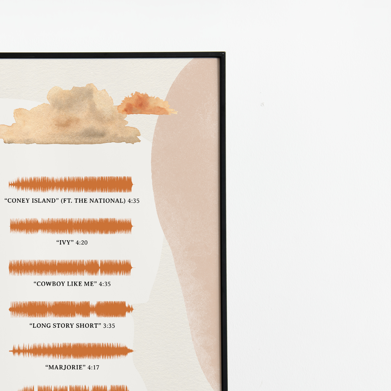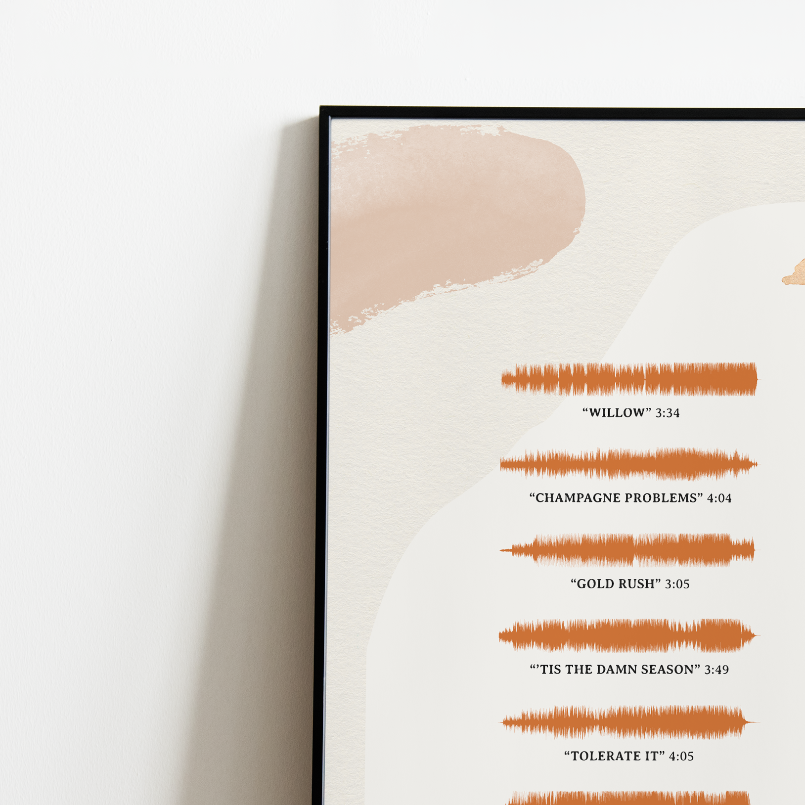 Make waves in your space with this unique soundwave album cover art for "Evermore" (Limited Edition) by TS, available in three sizes: 16x20, 18x24, and 24x36 inches. Each piece is printed on high-quality 150GSM paper using industry-grade archival inks. Elevate your artwork by pairing it with a handcrafted, 100% hardwood frame in black, white, or natural wood, complete with hanging hardware for easy install & display. Certified authentic, each track’s soundwave is extrapolated using The Wav Room's lossless audio transcribing process, making it a must-have for TS music enthusiasts.
