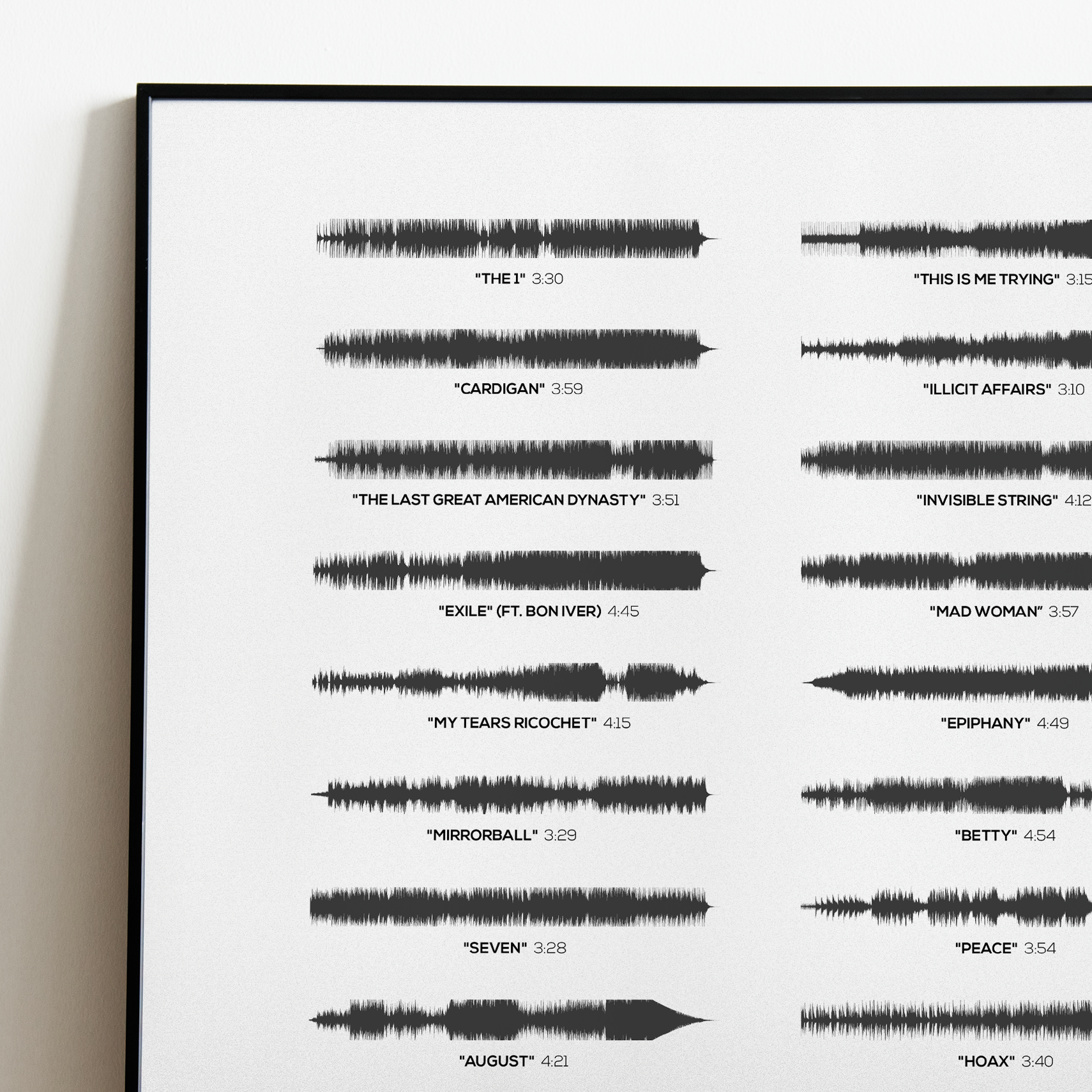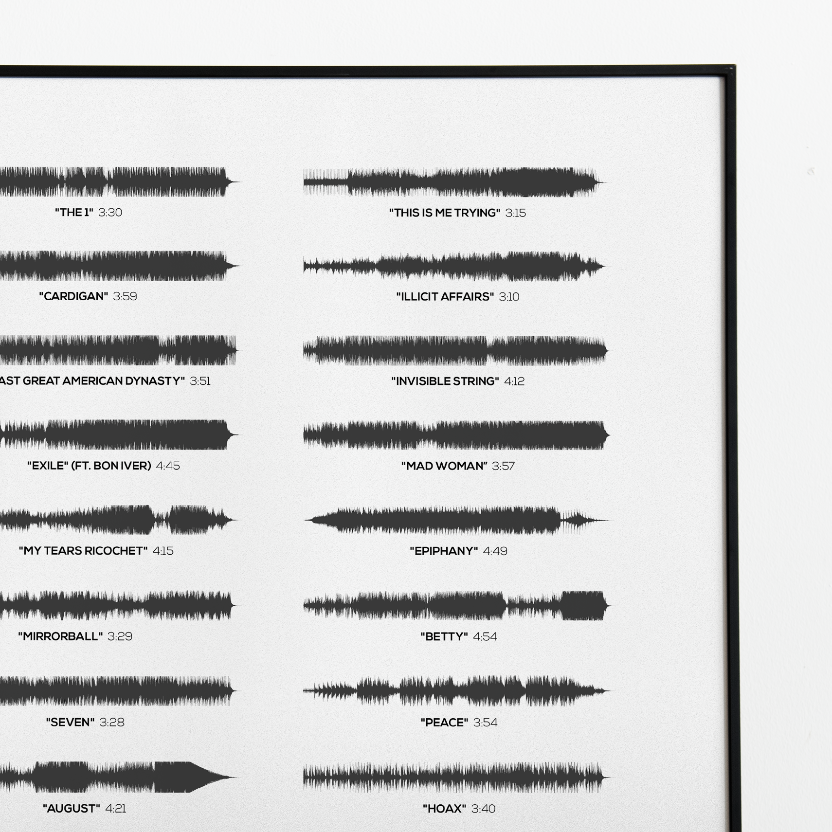 Make waves in your space with this unique soundwave album cover art for "Folklore" by TS, available in three sizes: 16x20, 18x24, and 24x36 inches. Each piece is printed on high-quality 150GSM paper using industry-grade archival inks. Elevate your artwork by pairing it with a handcrafted, 100% hardwood frame in black, white, or natural wood, complete with hanging hardware for easy install & display. Certified authentic, each track’s soundwave is extrapolated using The Wav Room's lossless audio transcribing process, making it a must-have for TS music enthusiasts.