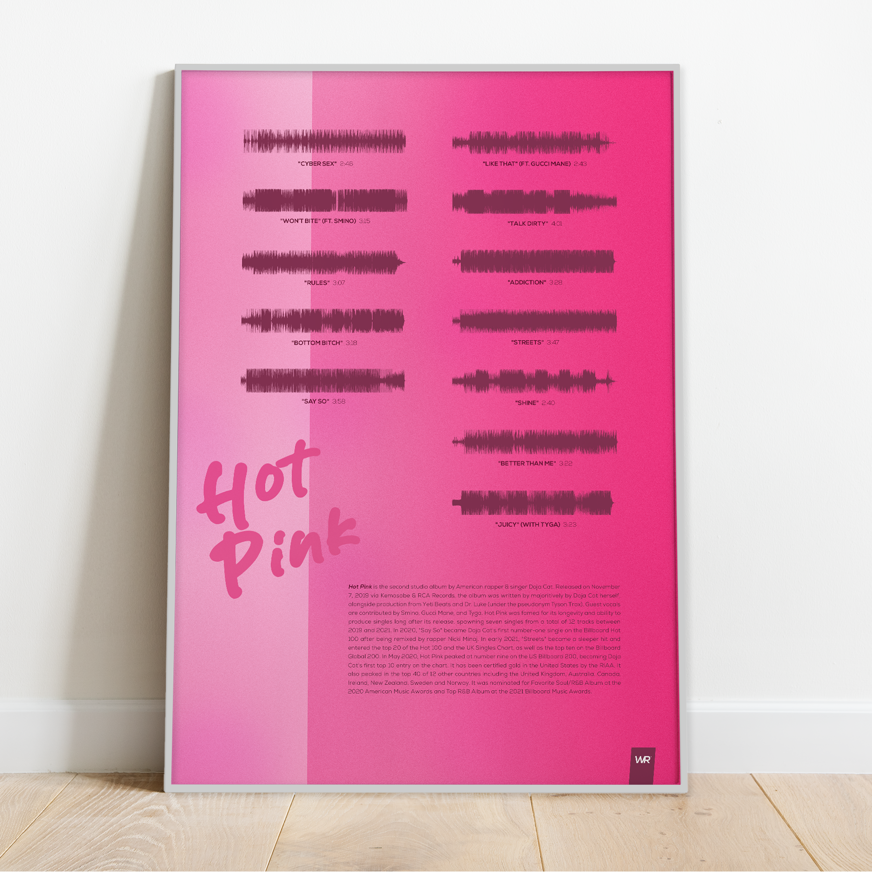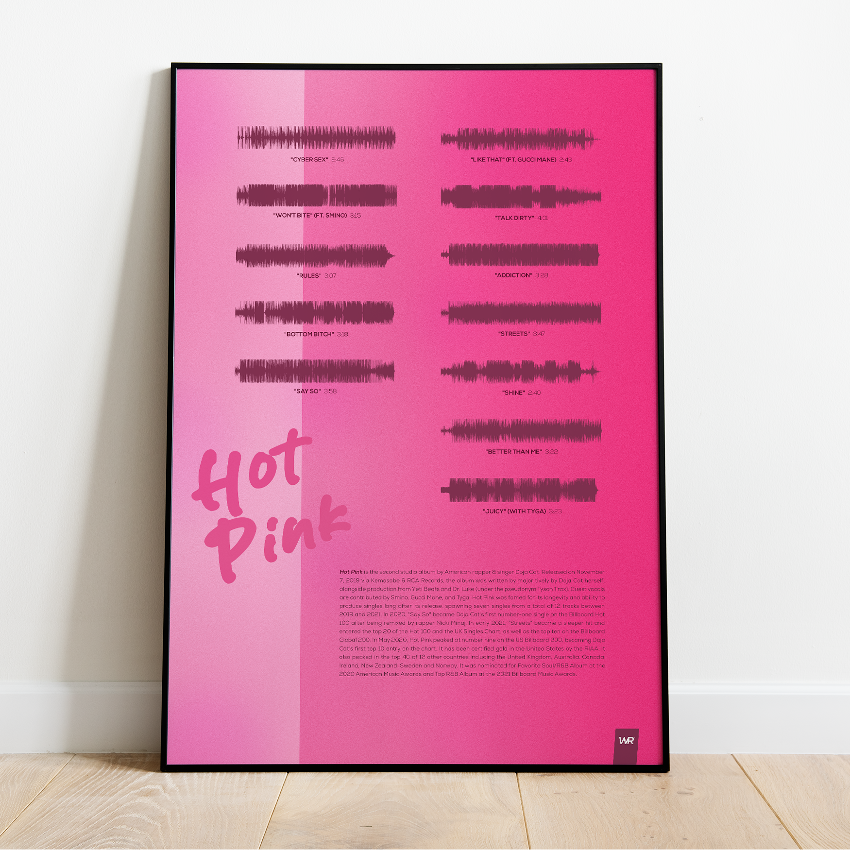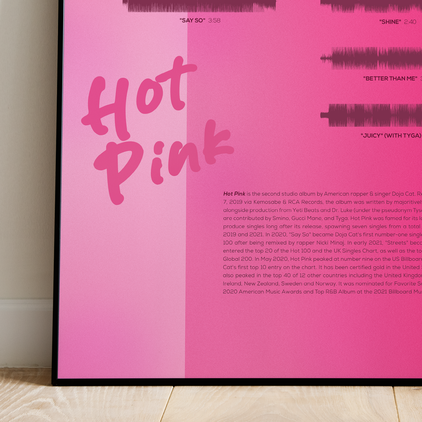 Make waves in your space with this unique soundwave album cover art for "Hot Pink" by Doja Cat, available in three sizes: 16x20, 18x24, and 24x36 inches. Each piece is printed on high-quality 150GSM paper using industry-grade archival inks. Elevate your artwork by pairing it with a handcrafted, 100% hardwood frame in black, white, or natural wood, complete with hanging hardware for easy install & display. Certified authentic, each track’s soundwave is extrapolated using The Wav Room's lossless audio transcribing process, making it a must-have for Doja Cat music enthusiasts.