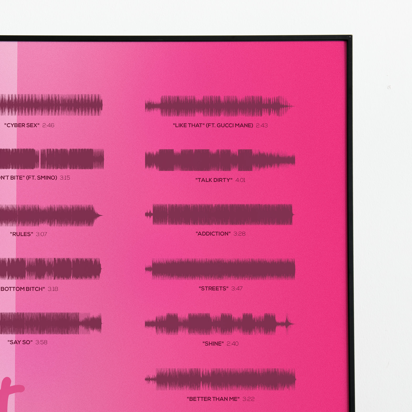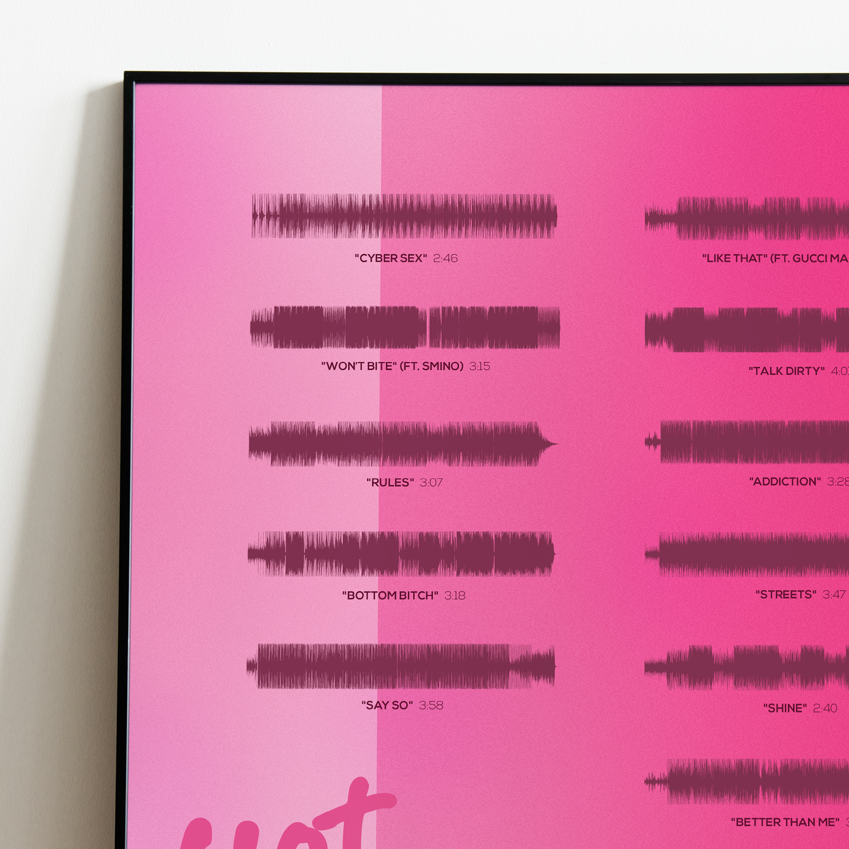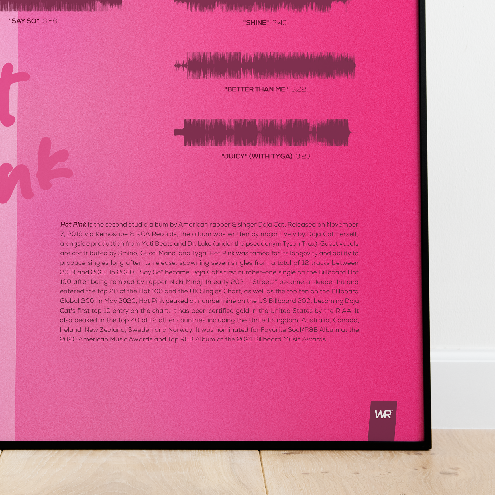 Make waves in your space with this unique soundwave album cover art for "Hot Pink" by Doja Cat, available in three sizes: 16x20, 18x24, and 24x36 inches. Each piece is printed on high-quality 150GSM paper using industry-grade archival inks. Elevate your artwork by pairing it with a handcrafted, 100% hardwood frame in black, white, or natural wood, complete with hanging hardware for easy install & display. Certified authentic, each track’s soundwave is extrapolated using The Wav Room's lossless audio transcribing process, making it a must-have for Doja Cat music enthusiasts.