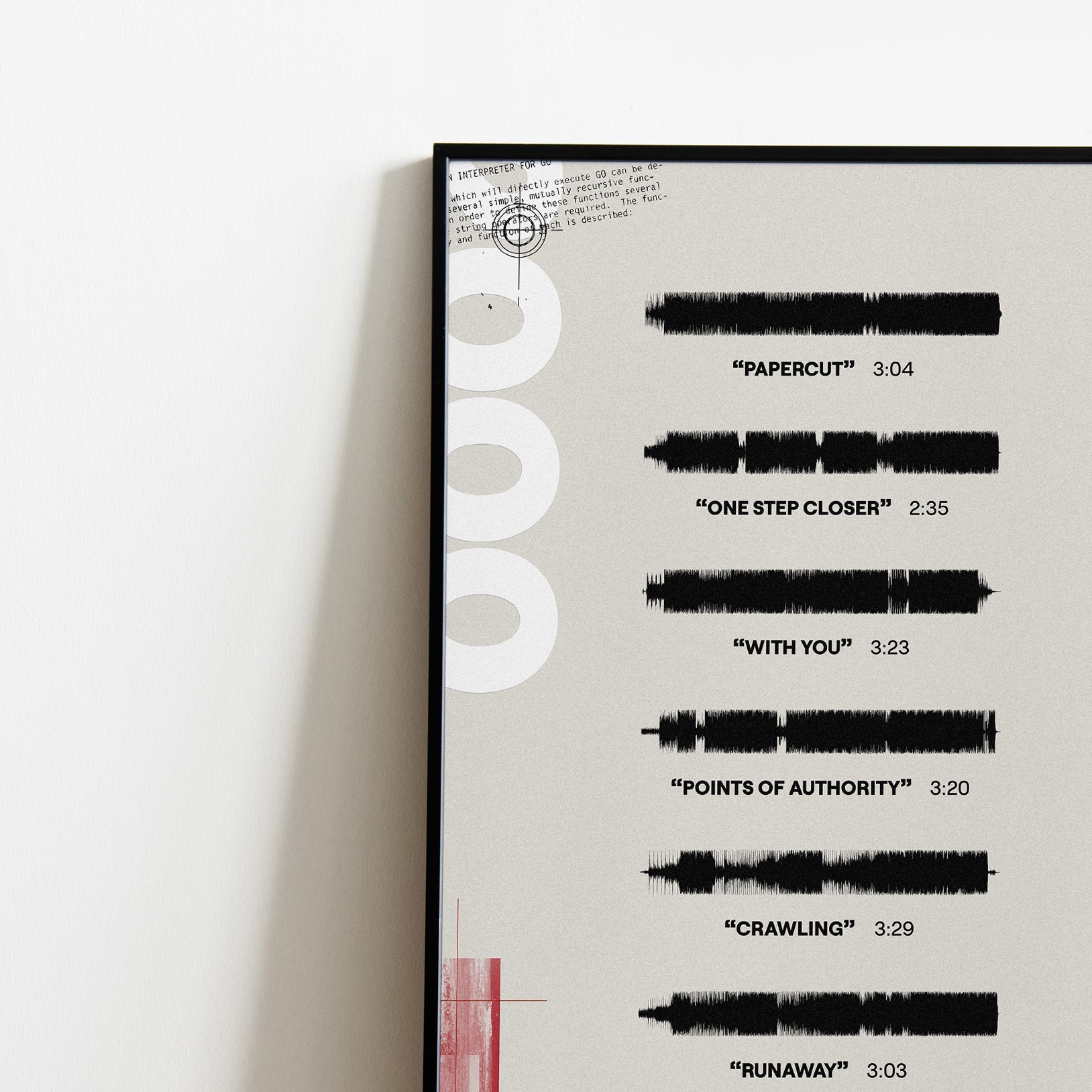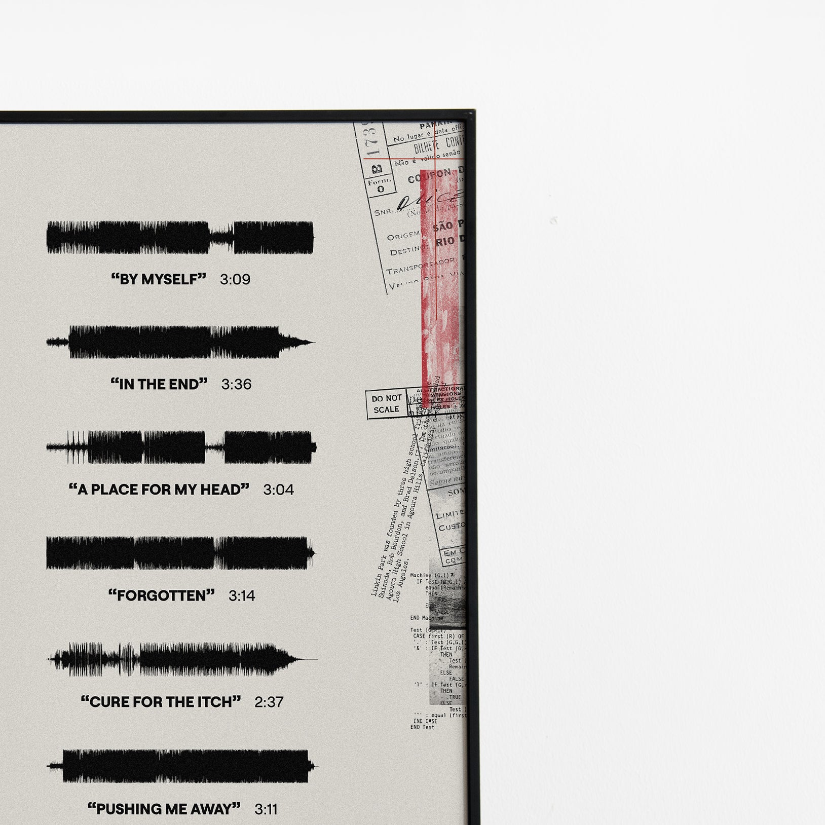 Make waves in your space with this unique soundwave album cover art for "Hybrid Theory" by Linkin Park, available in three sizes: 16x20, 18x24, and 24x36 inches. Each piece is printed on high-quality 150GSM paper using industry-grade archival inks. Elevate your artwork by pairing it with a handcrafted, 100% hardwood frame in black, white, or natural wood, complete with hanging hardware for easy install & display. Certified authentic, each track’s soundwave is extrapolated using The Wav Room's lossless audio transcribing process, making it a must-have for Linkin Park music enthusiasts.