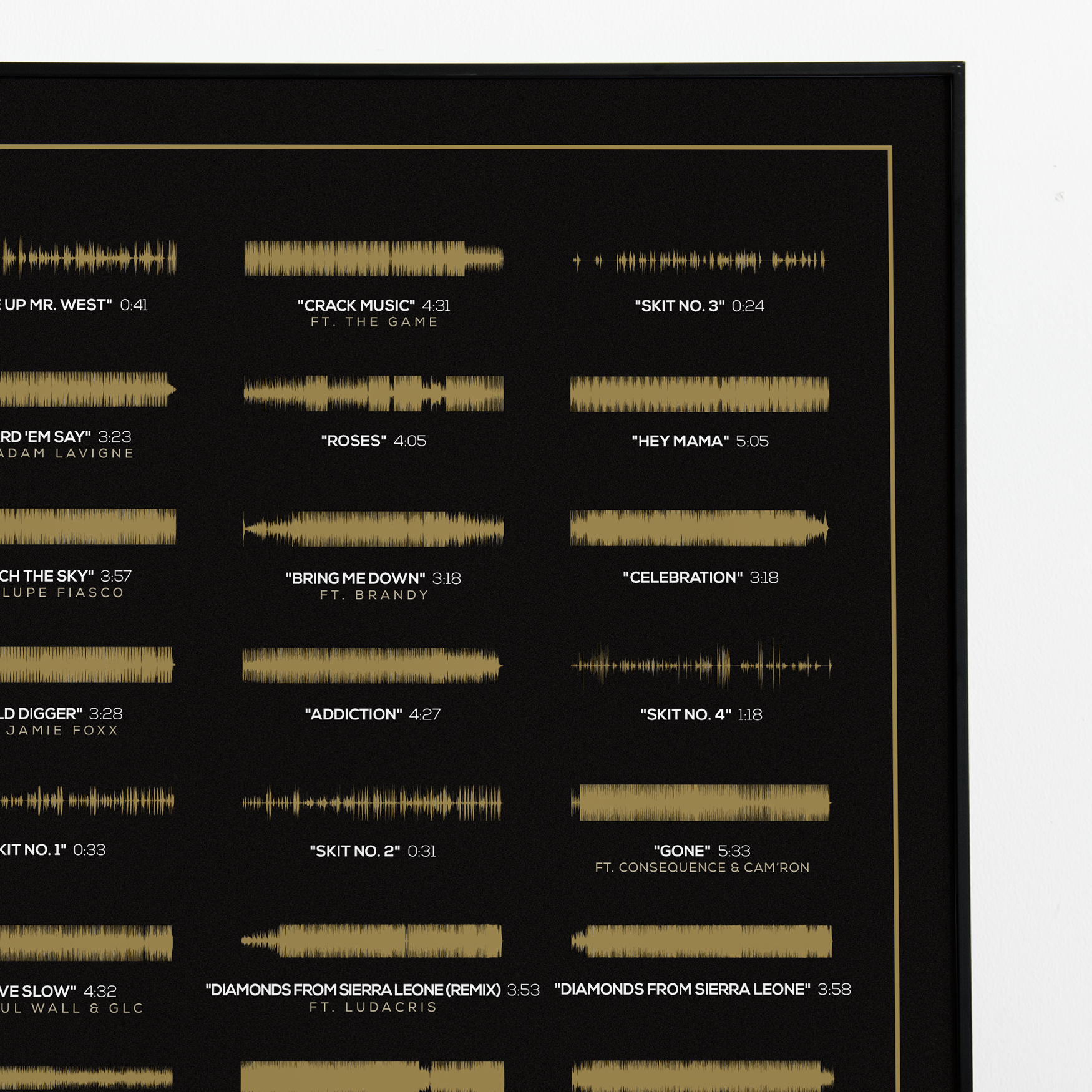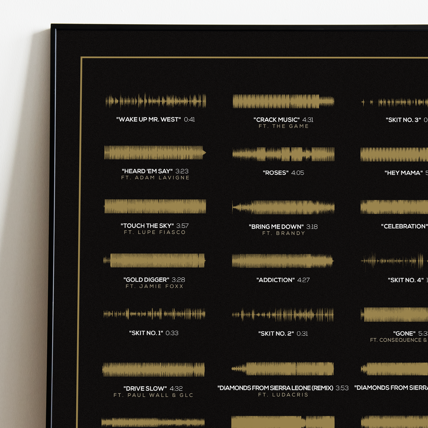 Make waves in your space with this unique soundwave album cover art for "Late Registration" by Kanye West, available in three sizes: 16x20, 18x24, and 24x36 inches. Each piece is printed on high-quality 150GSM paper using industry-grade archival inks. Elevate your artwork by pairing it with a handcrafted, 100% hardwood frame in black, white, or natural wood, complete with hanging hardware for easy install & display. Certified authentic, each track’s soundwave is extrapolated using The Wav Room's lossless audio transcribing process, making it a must-have for Kanye West music enthusiasts.
