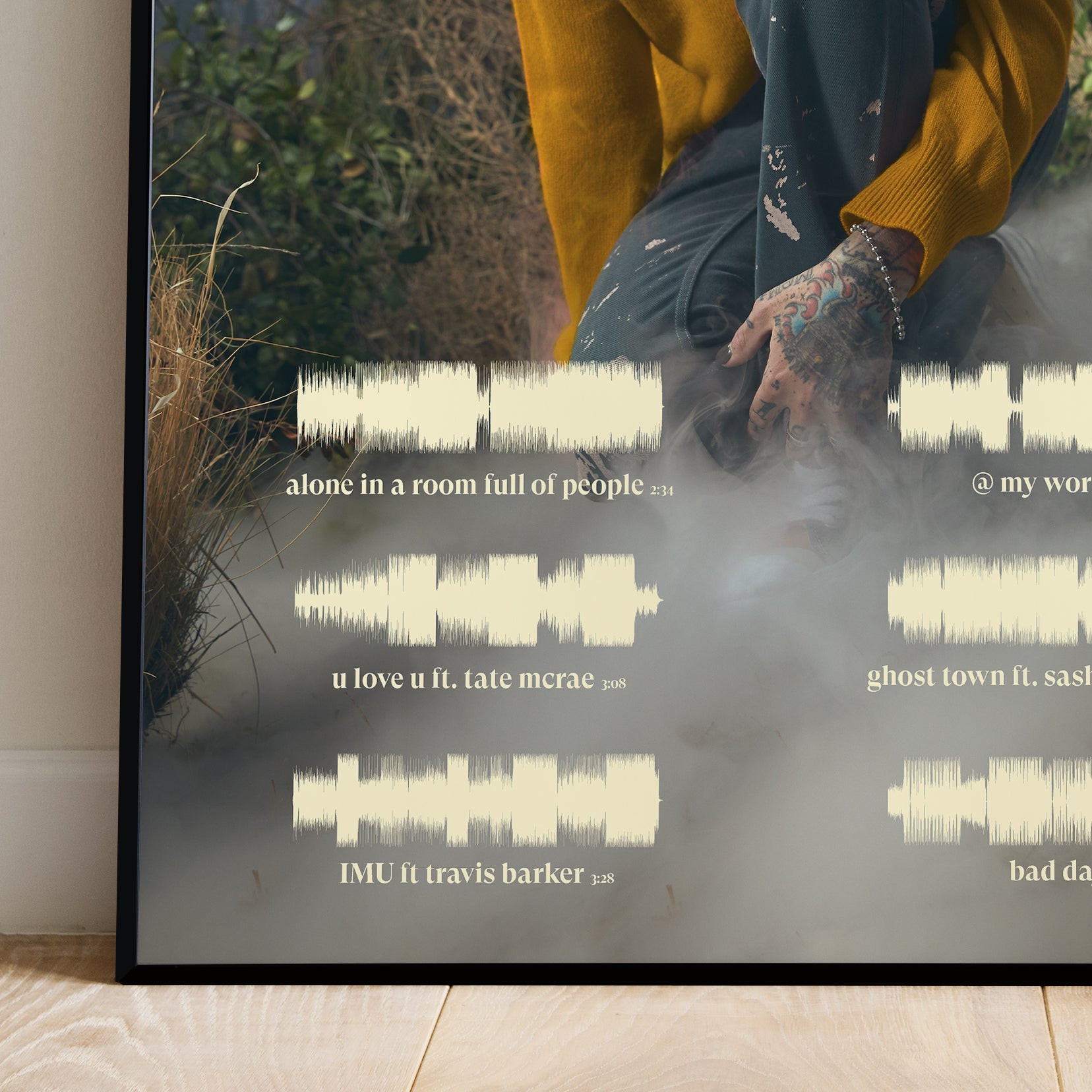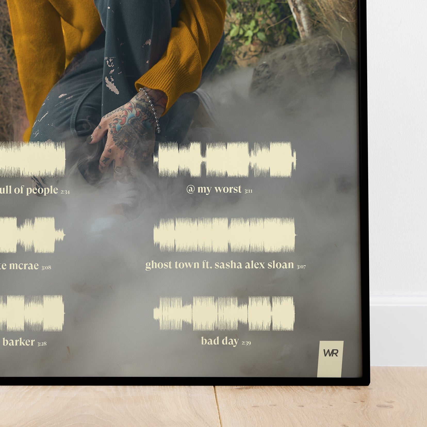 Make waves in your space with this unique soundwave album cover art for "Misery Lake" (Artist Collaboration Series) by Blackbear, available in three sizes: 16x20, 18x24, and 24x36 inches. Each piece is printed on high-quality 150GSM paper using industry-grade archival inks. Elevate your artwork by pairing it with a handcrafted, 100% hardwood frame in black, white, or natural wood, complete with hanging hardware for easy install & display. Certified authentic, each track’s soundwave is extrapolated using The Wav Room's lossless audio transcribing process, making it a must-have for Blackbear music enthusiasts.