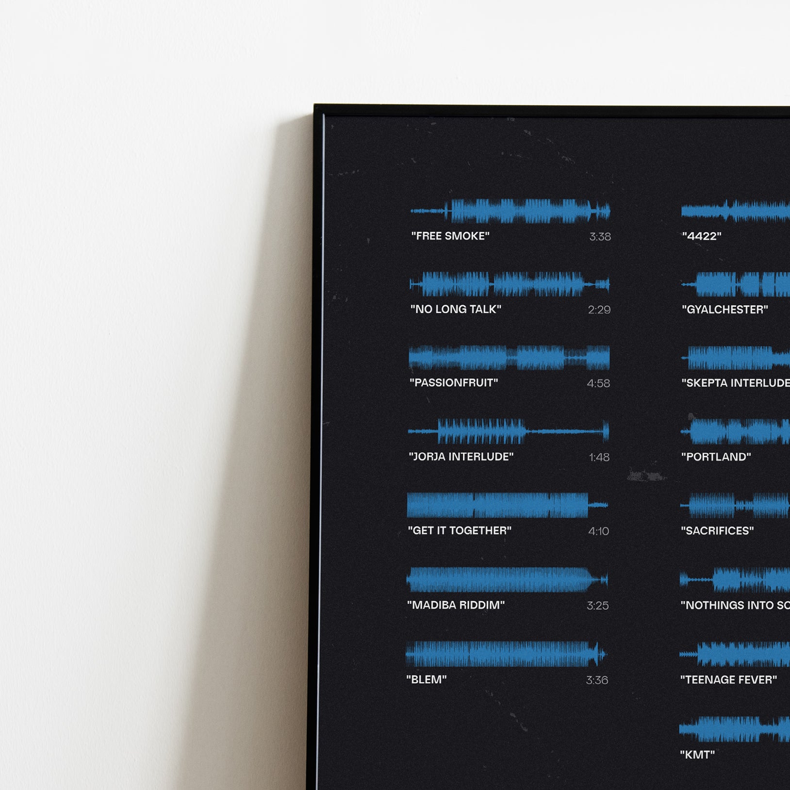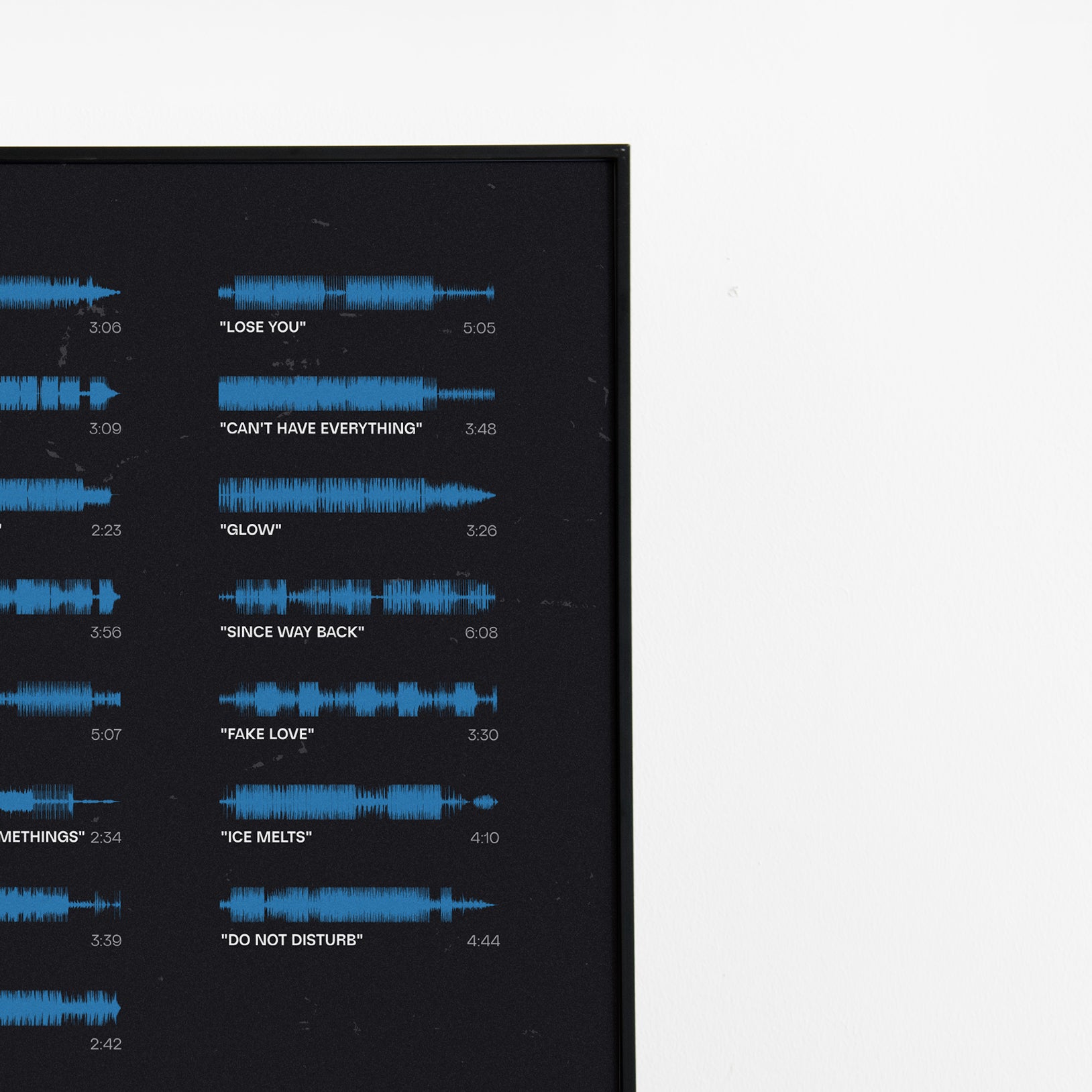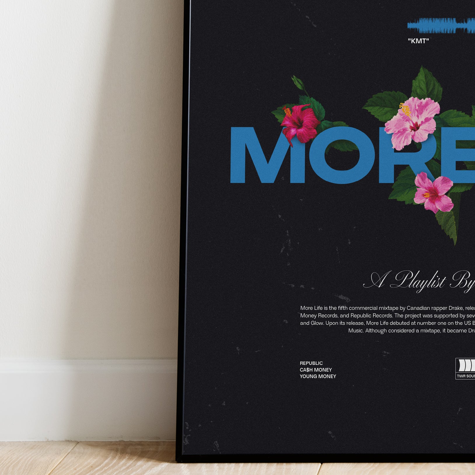 Make waves in your space with this unique soundwave album cover art for "More Life" by Drake, available in three sizes: 16x20, 18x24, and 24x36 inches. Each piece is printed on high-quality 150GSM paper using industry-grade archival inks. Elevate your artwork by pairing it with a handcrafted, 100% hardwood frame in black, white, or natural wood, complete with hanging hardware for easy install & display. Certified authentic, each track’s soundwave is extrapolated using The Wav Room's lossless audio transcribing process, making it a must-have for Drake music enthusiasts.