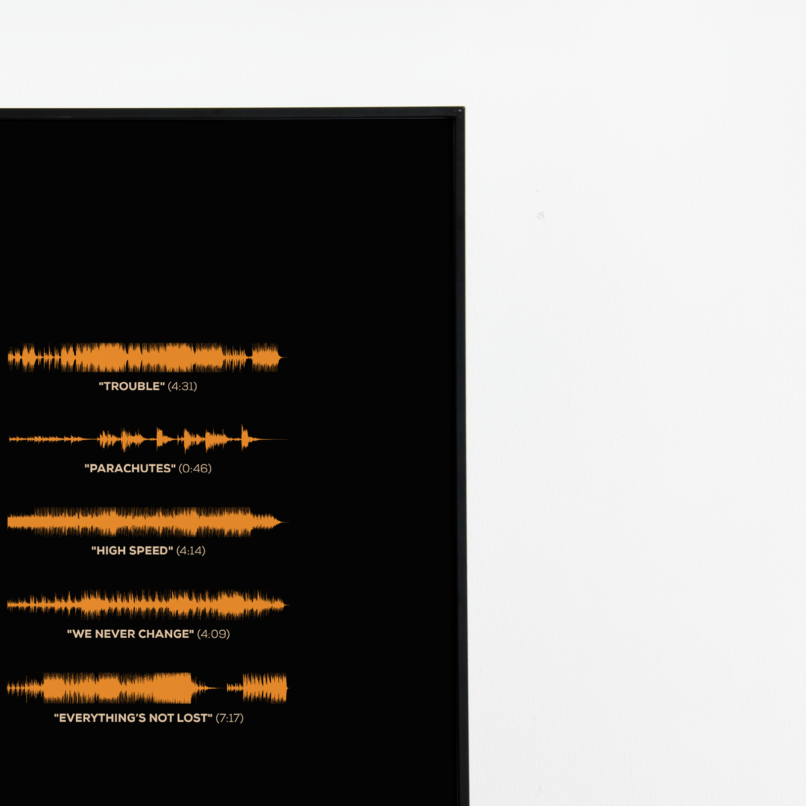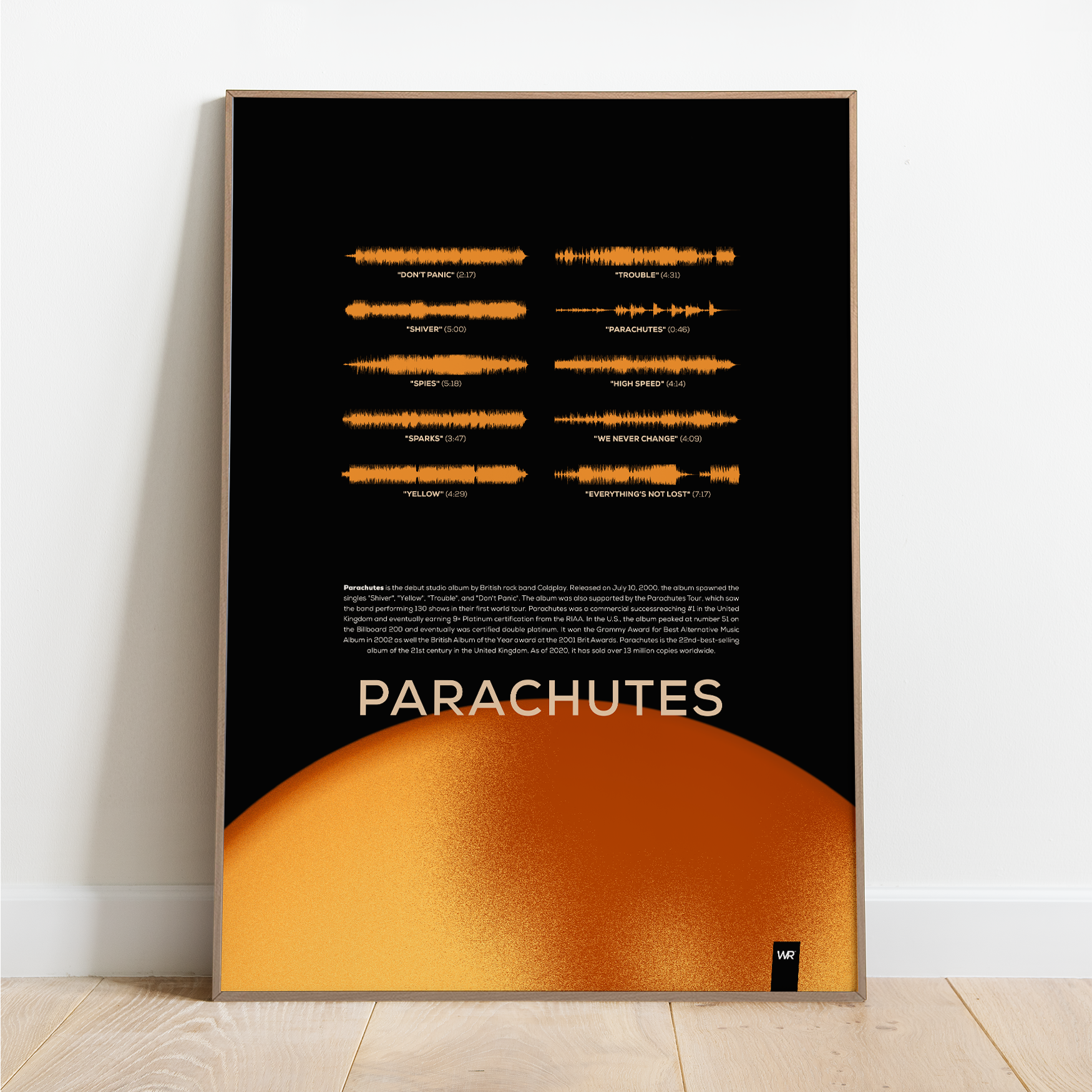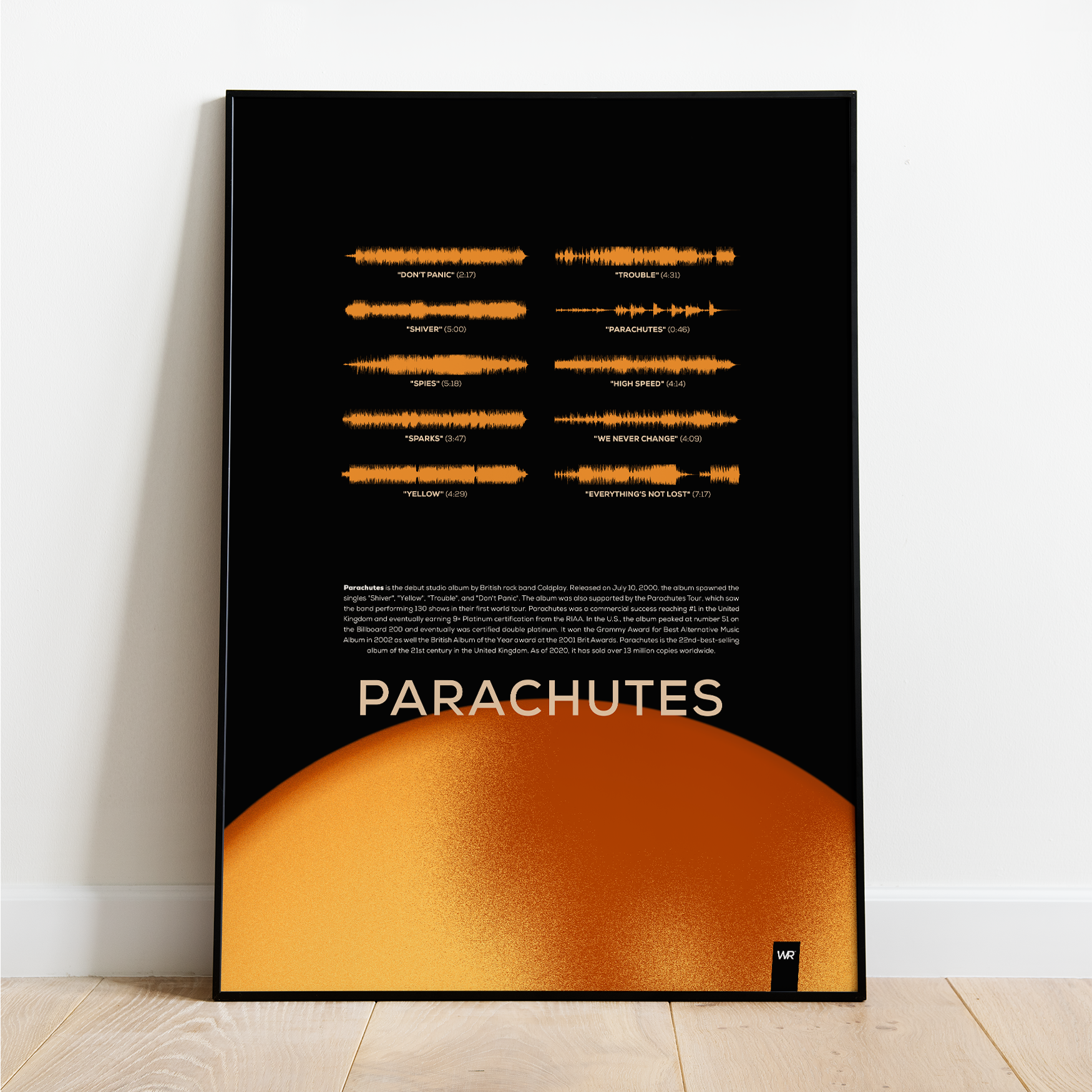Make waves in your space with this unique soundwave album cover art for "Parachutes" by Coldplay, available in three sizes: 16x20, 18x24, and 24x36 inches. Each piece is printed on high-quality 150GSM paper using industry-grade archival inks. Elevate your artwork by pairing it with a handcrafted, 100% hardwood frame in black, white, or natural wood, complete with hanging hardware for easy install & display. Certified authentic, each track’s soundwave is extrapolated using The Wav Room's lossless audio transcribing process, making it a must-have for Coldplay music enthusiasts.