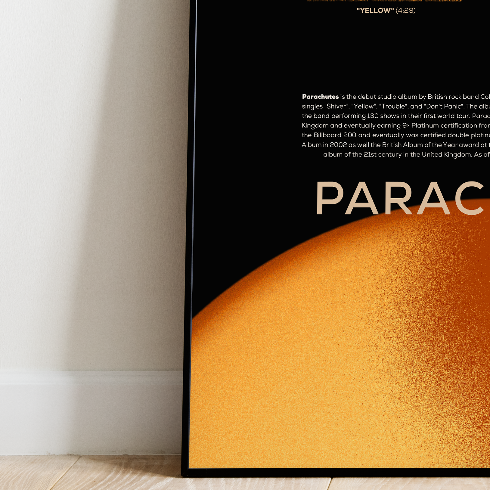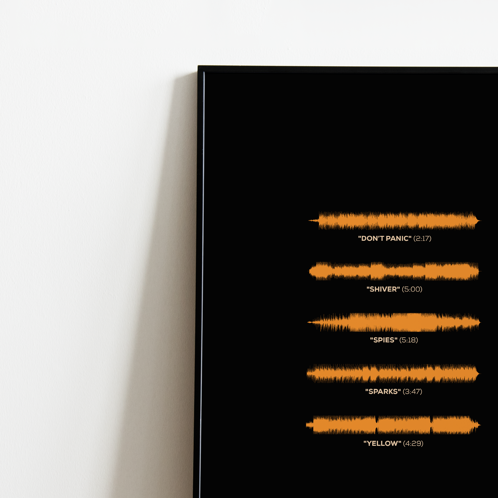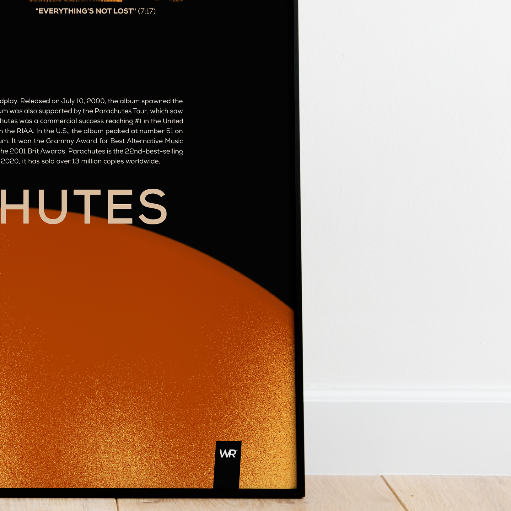 Make waves in your space with this unique soundwave album cover art for "Parachutes" by Coldplay, available in three sizes: 16x20, 18x24, and 24x36 inches. Each piece is printed on high-quality 150GSM paper using industry-grade archival inks. Elevate your artwork by pairing it with a handcrafted, 100% hardwood frame in black, white, or natural wood, complete with hanging hardware for easy install & display. Certified authentic, each track’s soundwave is extrapolated using The Wav Room's lossless audio transcribing process, making it a must-have for Coldplay music enthusiasts.