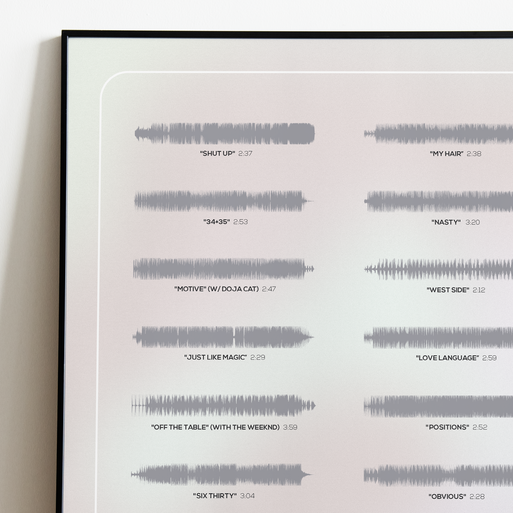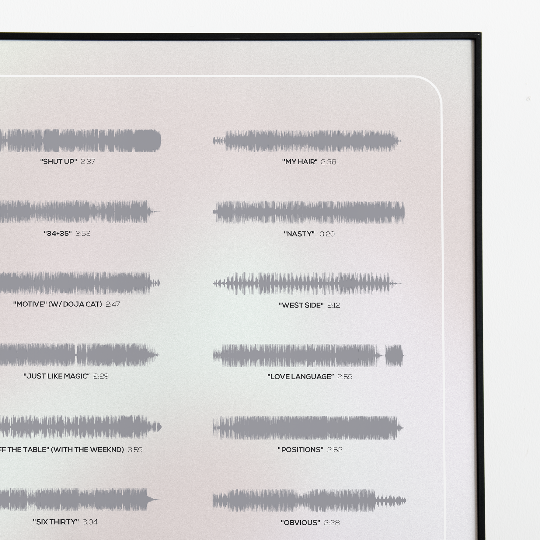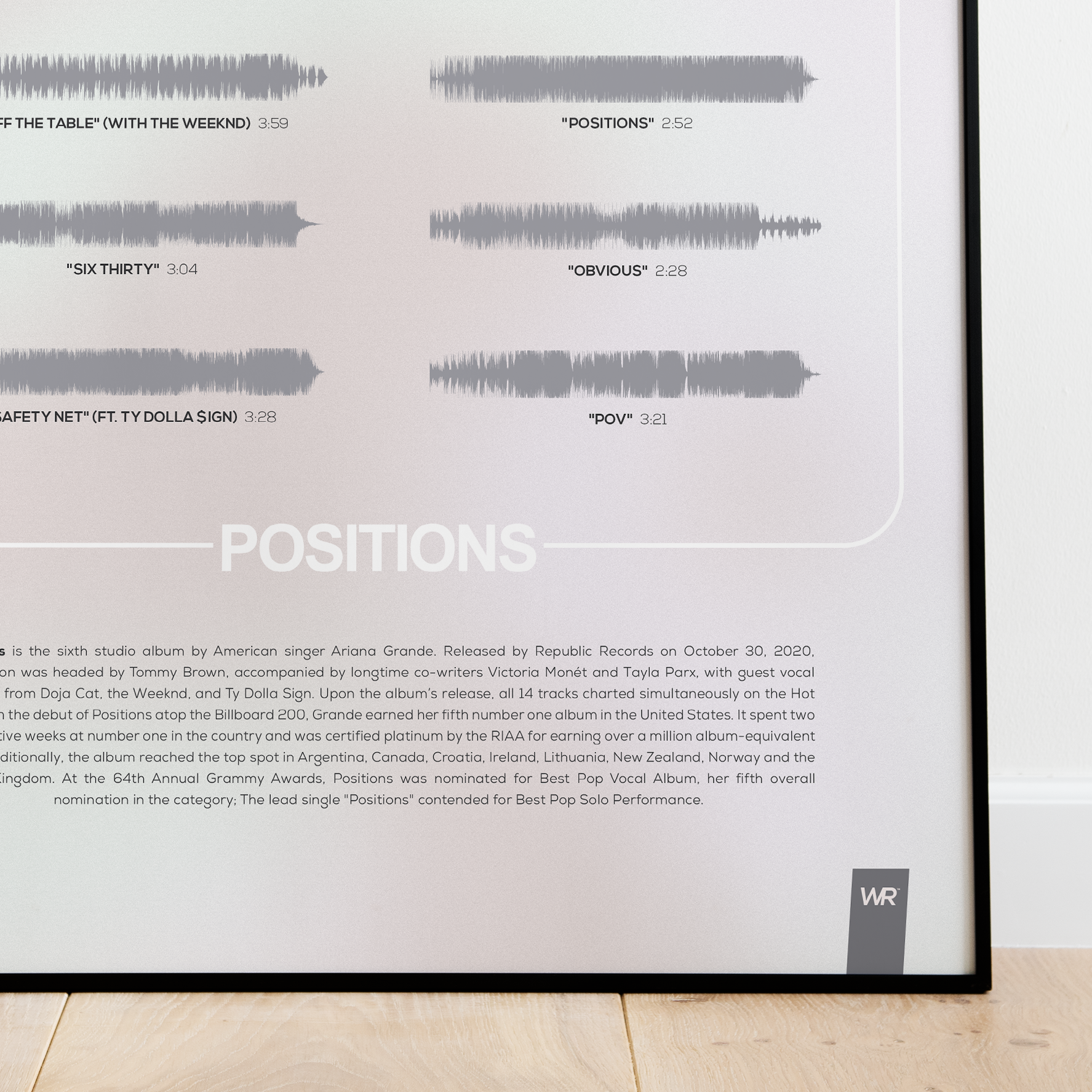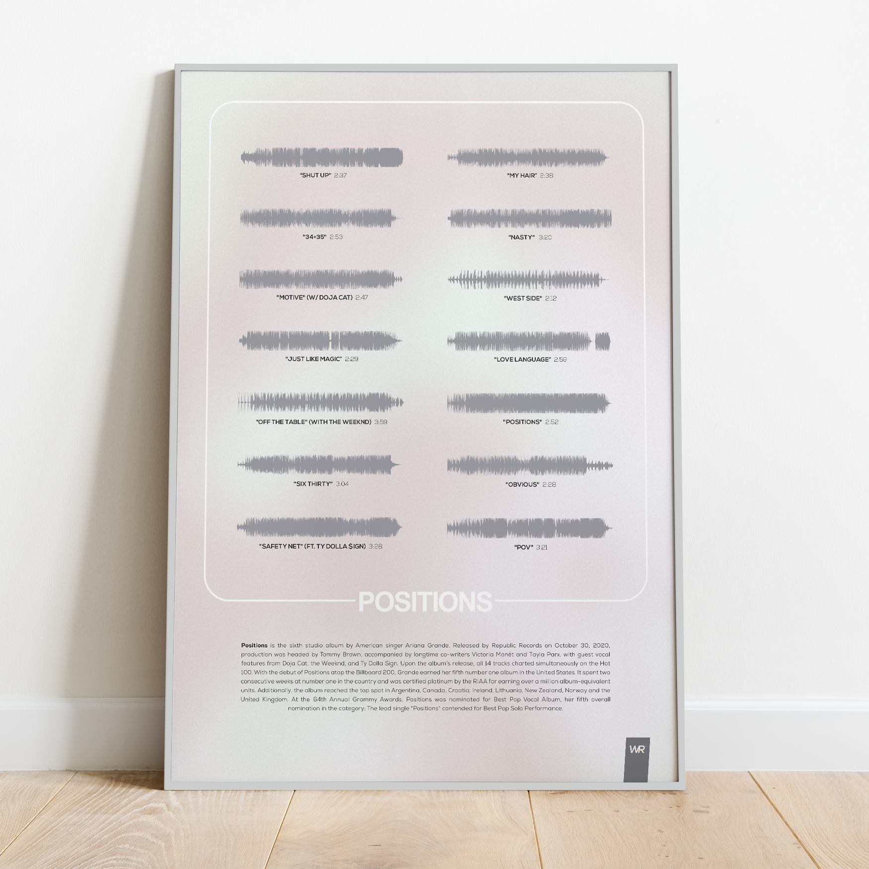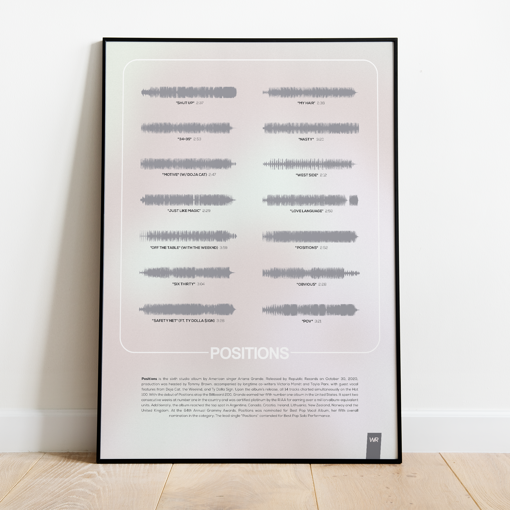Make waves in your space with this unique soundwave album cover art for "Positions" by Ariana Grande, available in three sizes: 16x20, 18x24, and 24x36 inches. Each piece is printed on high-quality 150GSM paper using industry-grade archival inks. Elevate your artwork by pairing it with a handcrafted, 100% hardwood frame in black, white, or natural wood, complete with hanging hardware for easy install & display. Certified authentic, each track’s soundwave is extrapolated using The Wav Room's lossless audio transcribing process, making it a must-have for Ariana Grande music enthusiasts.