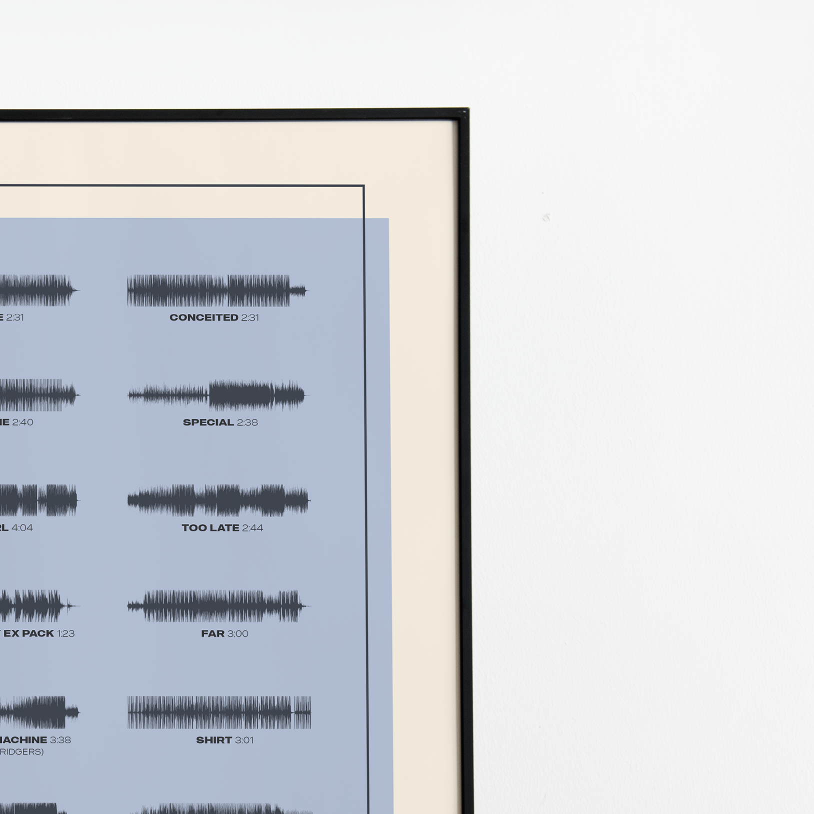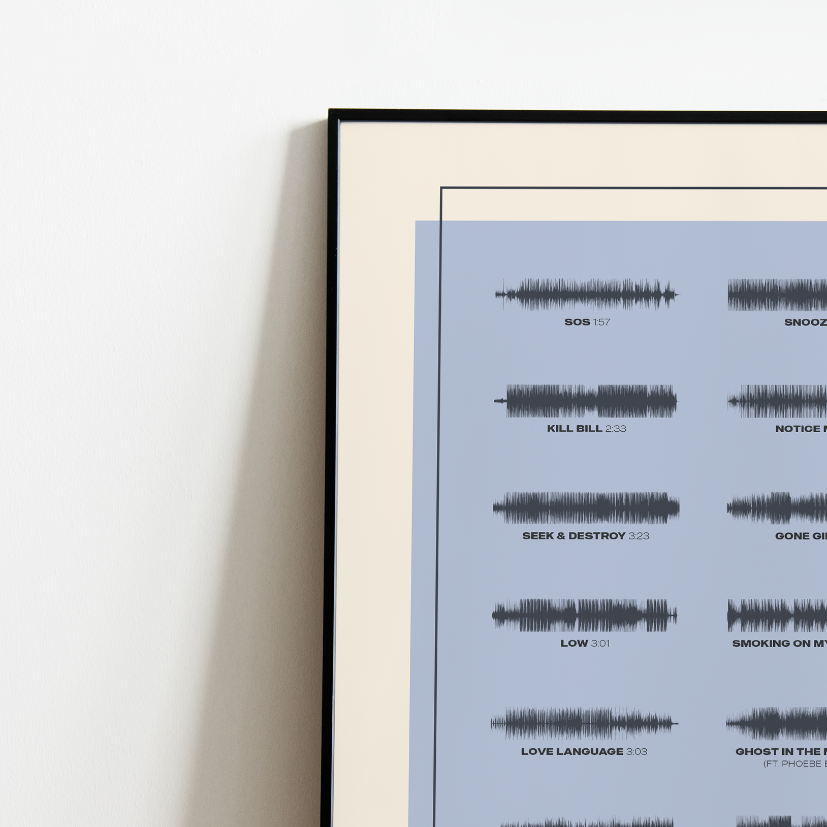 Make waves in your space with this unique soundwave album cover art for "S.O.S" by SZA, available in three sizes: 16x20, 18x24, and 24x36 inches. Each piece is printed on high-quality 150GSM paper using industry-grade archival inks. Elevate your artwork by pairing it with a handcrafted, 100% hardwood frame in black, white, or natural wood, complete with hanging hardware for easy install & display. Certified authentic, each track’s soundwave is extrapolated using The Wav Room's lossless audio transcribing process, making it a must-have for SZA music enthusiasts.