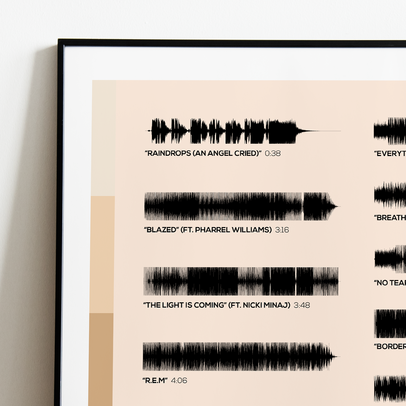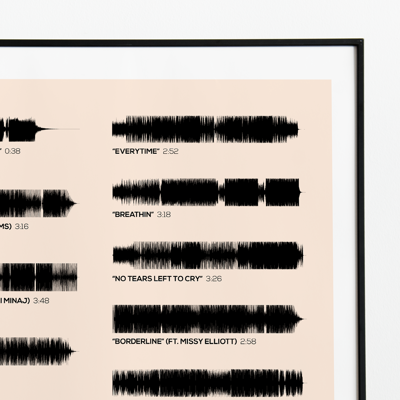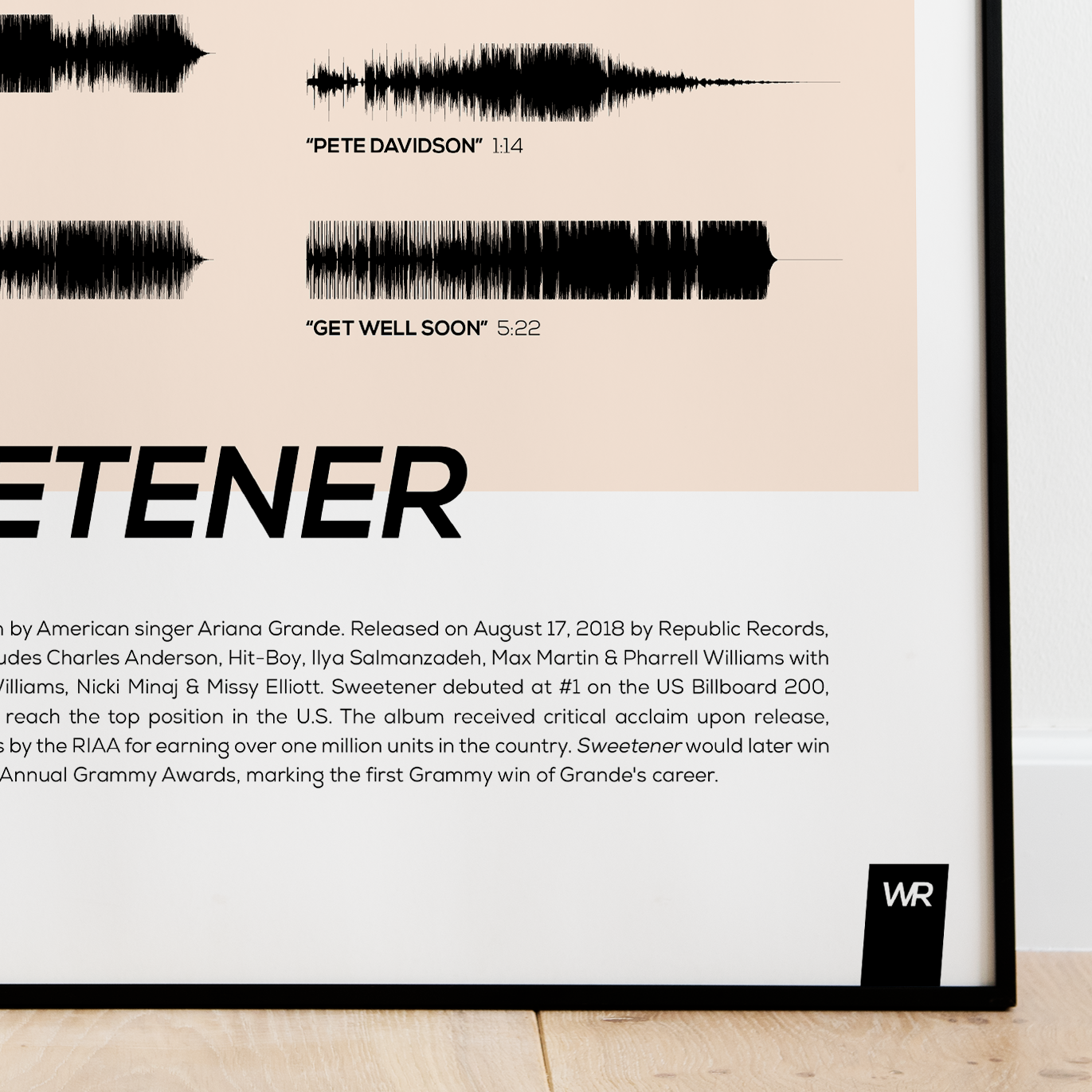 Make waves in your space with this unique soundwave album cover art for "Sweetener" by Ariana Grande, available in three sizes: 16x20, 18x24, and 24x36 inches. Each piece is printed on high-quality 150GSM paper using industry-grade archival inks. Elevate your artwork by pairing it with a handcrafted, 100% hardwood frame in black, white, or natural wood, complete with hanging hardware for easy install & display. Certified authentic, each track’s soundwave is extrapolated using The Wav Room's lossless audio transcribing process, making it a must-have for Ariana Grande music enthusiasts.
