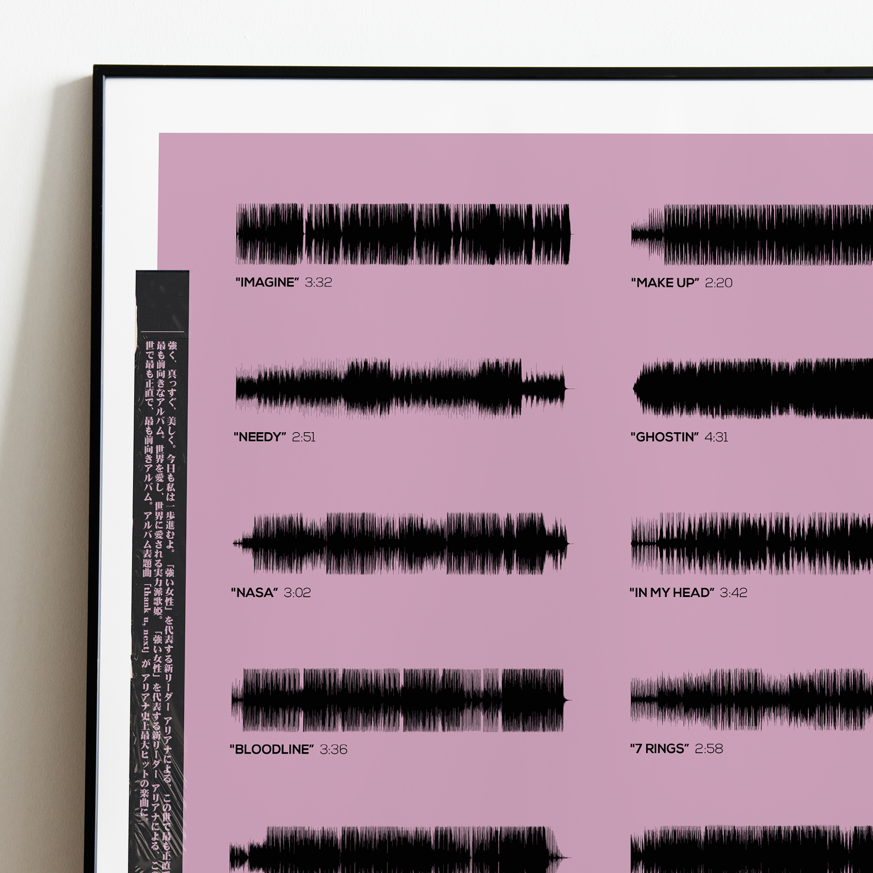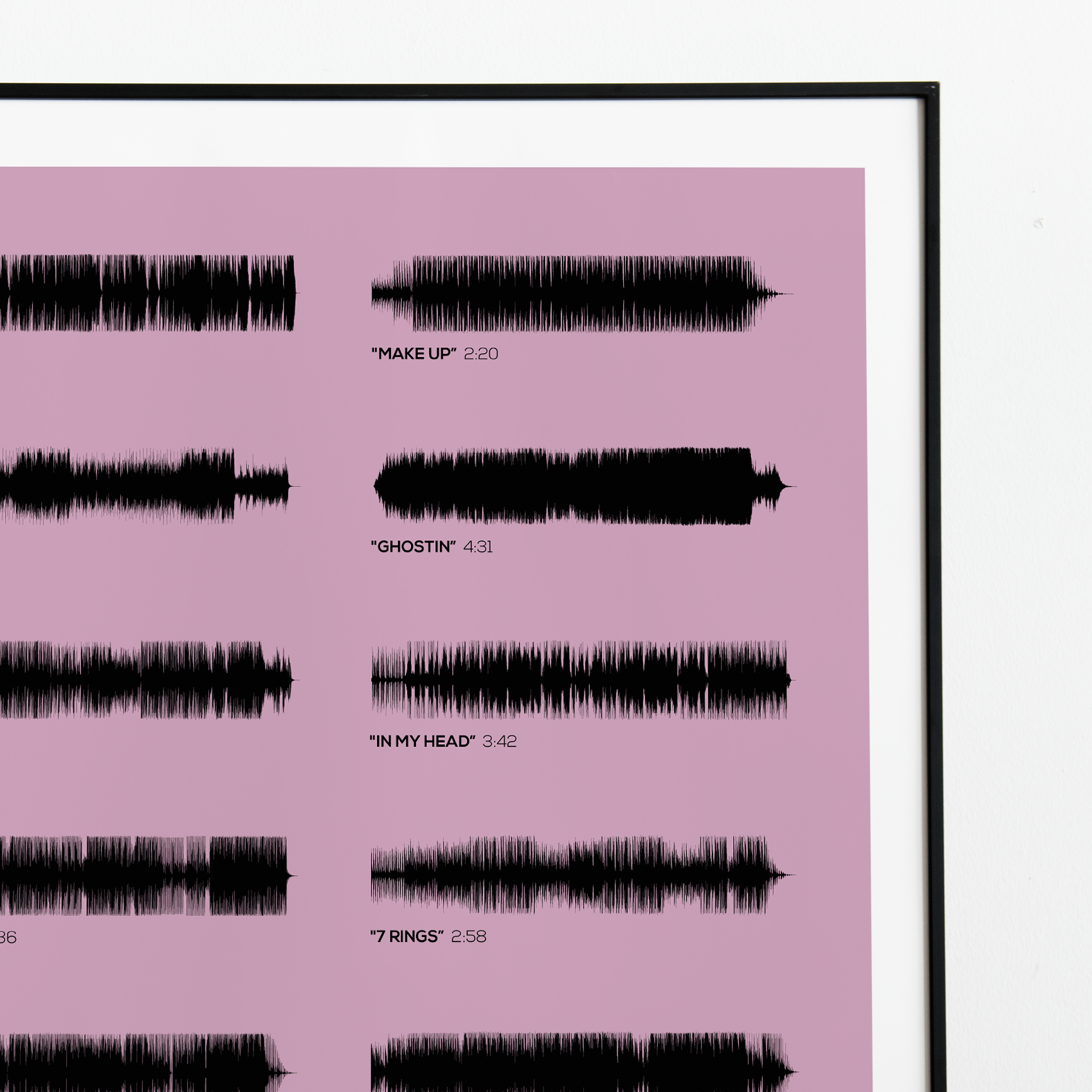 Make waves in your space with this unique soundwave album cover art for "Thank U, Next" by Ariana Grande, available in three sizes: 16x20, 18x24, and 24x36 inches. Each piece is printed on high-quality 150GSM paper using industry-grade archival inks. Elevate your artwork by pairing it with a handcrafted, 100% hardwood frame in black, white, or natural wood, complete with hanging hardware for easy install & display. Certified authentic, each track’s soundwave is extrapolated using The Wav Room's lossless audio transcribing process, making it a must-have for Ariana Grande music enthusiasts.