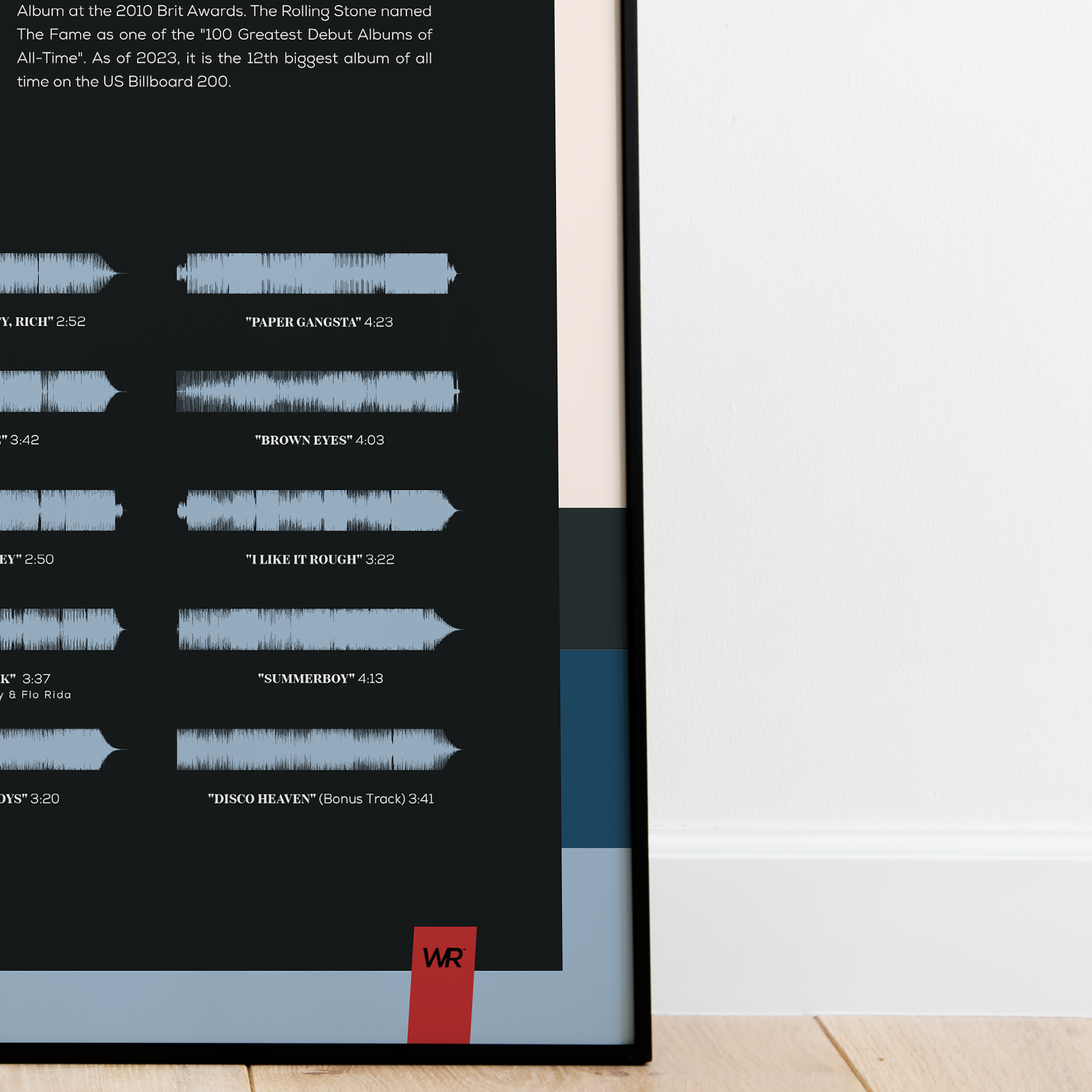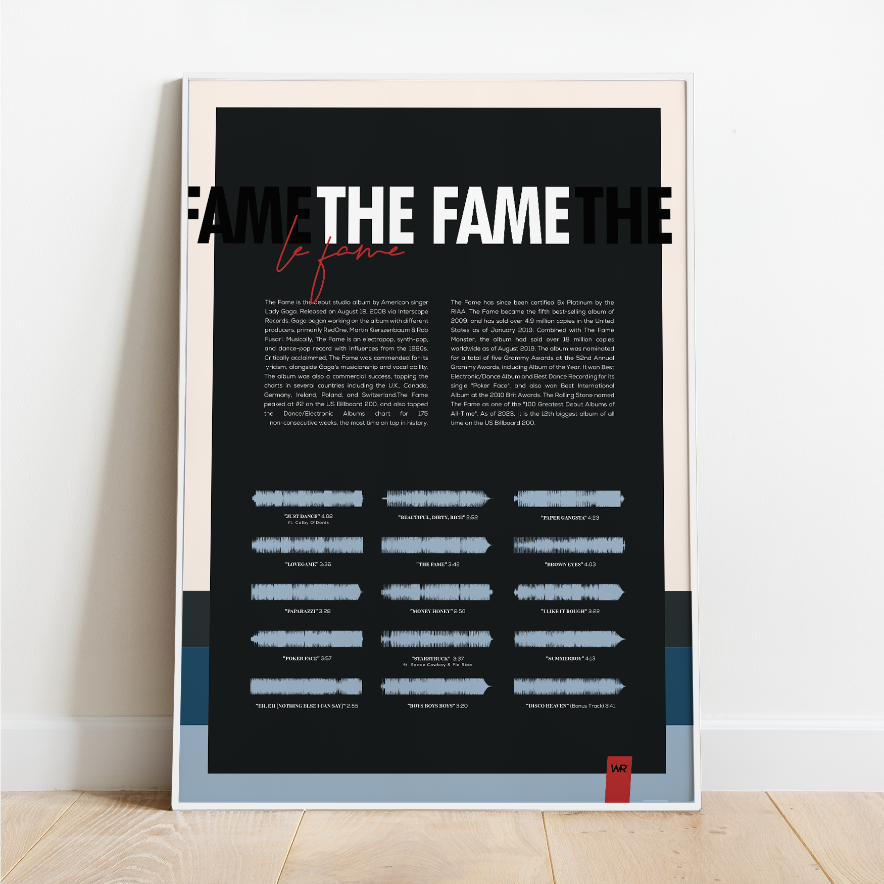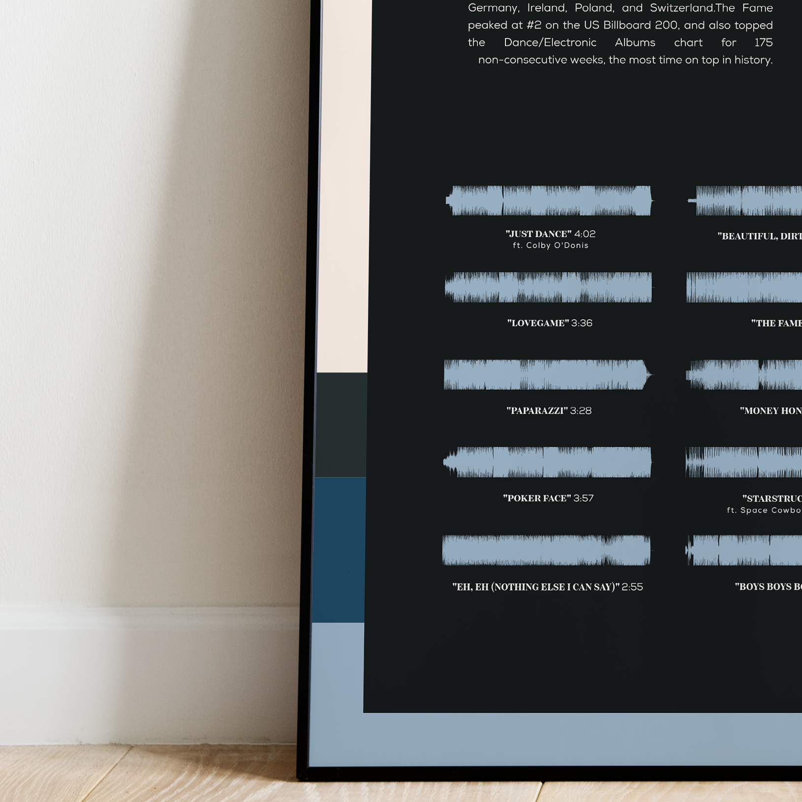 Make waves in your space with this unique soundwave album cover art for "The Fame" by Lady Gaga, available in three sizes: 16x20, 18x24, and 24x36 inches. Each piece is printed on high-quality 150GSM paper using industry-grade archival inks. Elevate your artwork by pairing it with a handcrafted, 100% hardwood frame in black, white, or natural wood, complete with hanging hardware for easy install & display. Certified authentic, each track’s soundwave is extrapolated using The Wav Room's lossless audio transcribing process, making it a must-have for Lady Gaga music enthusiasts.
