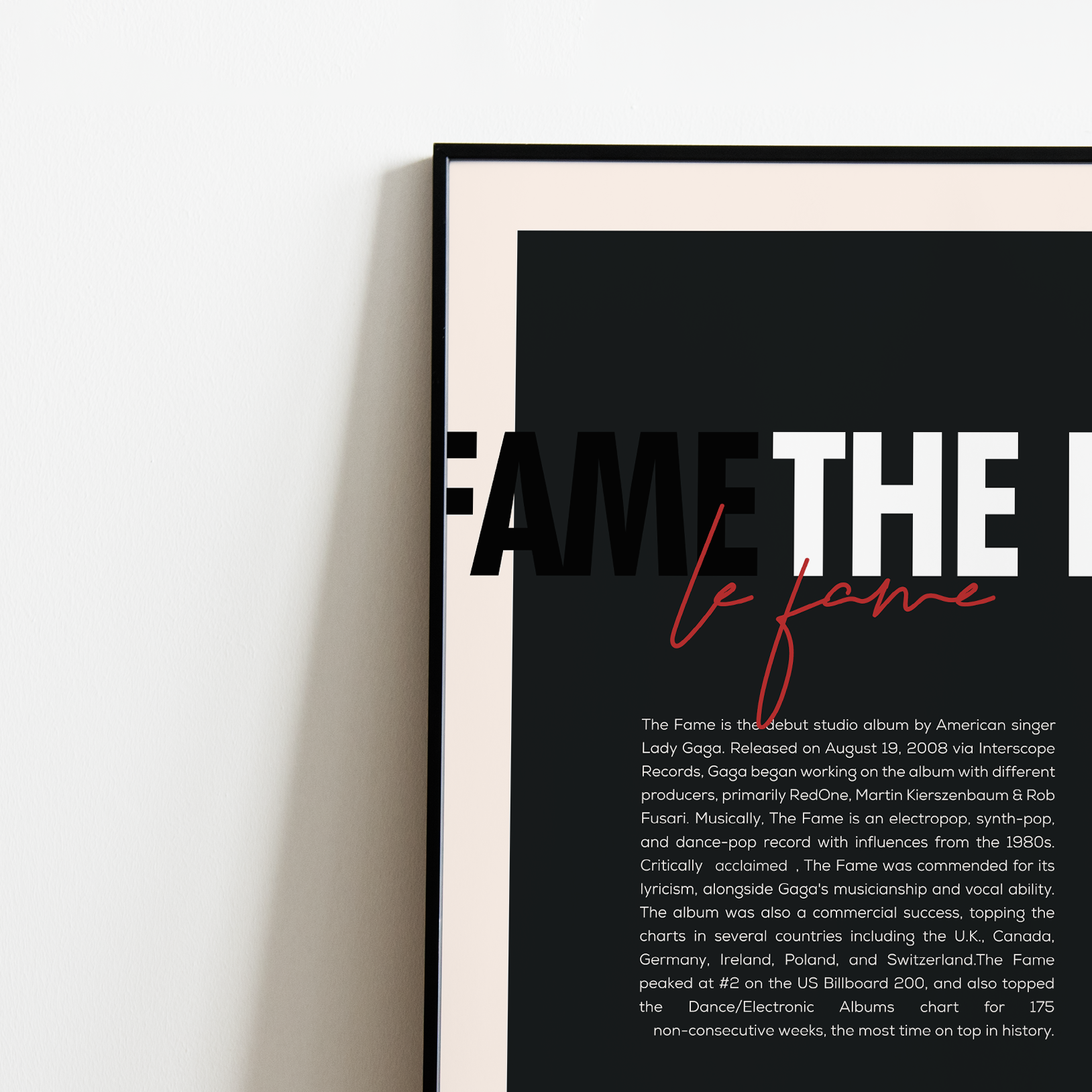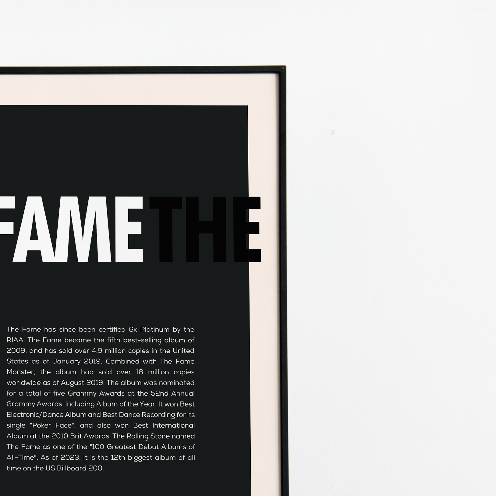 The Fame is the debut studio album by American singer Lady Gaga. Released on August 19, 2008 via Interscope Records, Gaga began working on the album with different producers, primarily RedOne, Martin Kierszenbaum & Rob Fusari. Musically, The Fame is an electropop, synth-pop, and dance-pop record with influences from the 1980s. Critically acclaimed, The Fame was commended for its lyricism, alongside Gaga's musicianship and vocal ability. The album was also a commercial success, topping the charts in several countries including the U.K., Canada, Germany, Ireland, Poland, and Switzerland.The Fame peaked at #2 on the US Billboard 200, and also topped the Dance/Electronic Albums chart for 175 non-consecutive weeks, the most time on top in history. The Fame has since been certified 6x Platinum by the RIAA. The Fame became the fifth best-selling album of 2009, and has sold over 4.9 million copies in the United States as of January 2019. Combined with The Fame Monster, the album had sold over 18 million copies worldwide as of August 2019. The album was nominated for a total of five Grammy Awards at the 52nd Annual Grammy Awards, including Album of the Year. It won Best Electronic/Dance Album and Best Dance Recording for its single "Poker Face", and also won Best International Album at the 2010 Brit Awards. The Rolling Stone named The Fame as one of the "100 Greatest Debut Albums of All-Time". As of 2023, it is the 12th biggest album of all time on the US Billboard 200.
