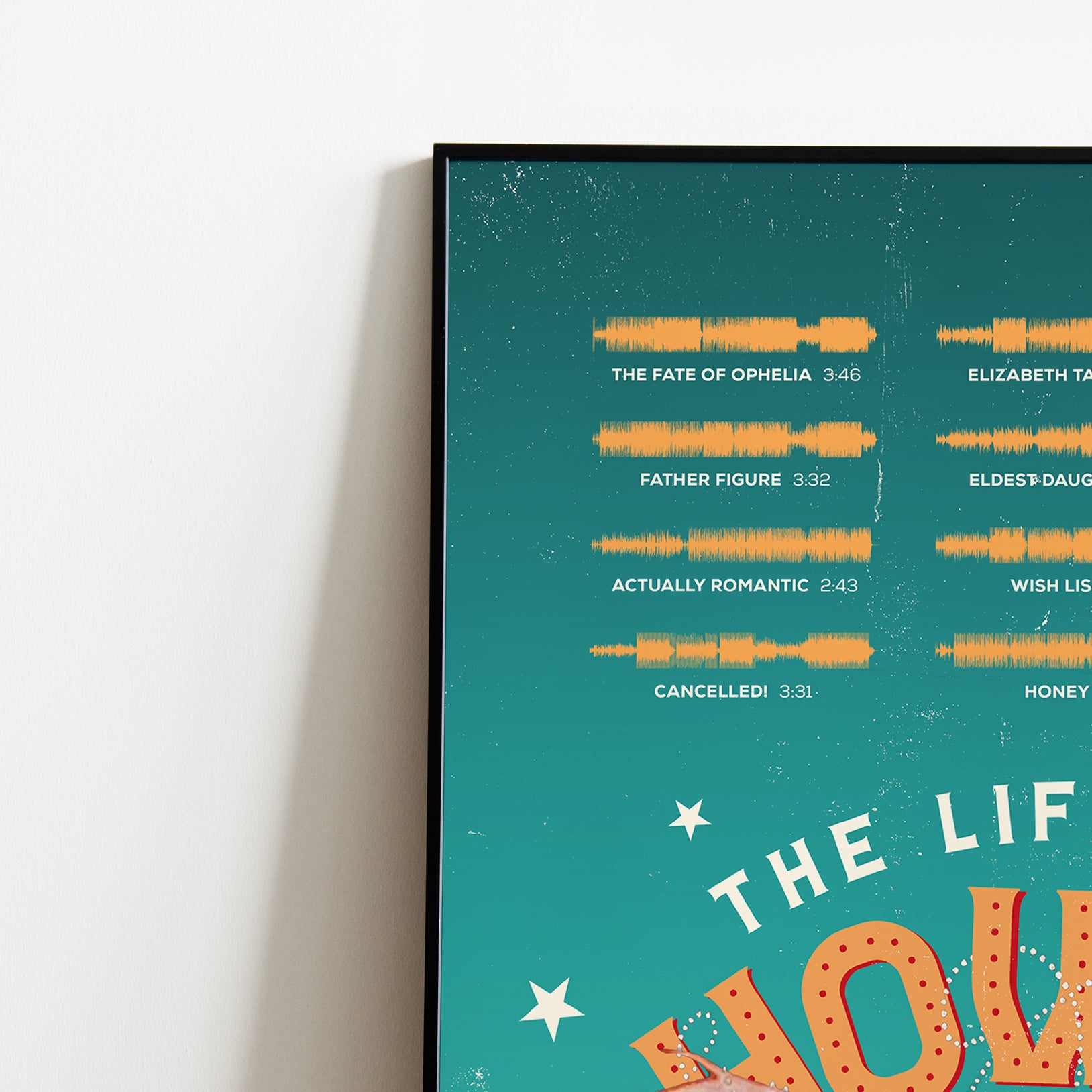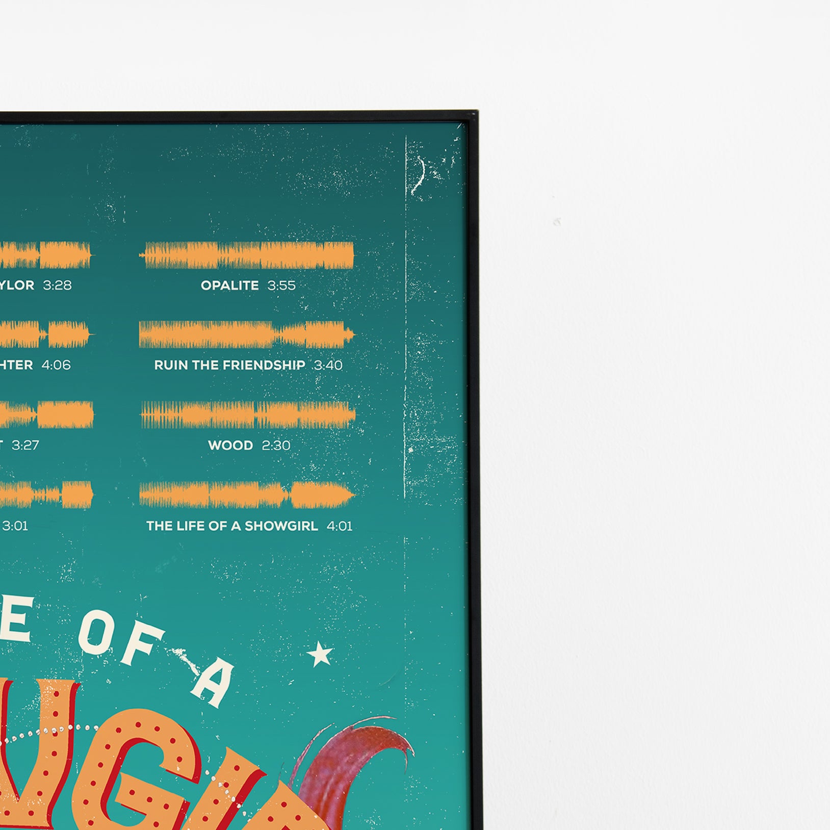 Make waves in your space with this unique soundwave album cover art for "The Life of a Showgirl" by TS, available in three sizes: 16x20, 18x24, and 24x36 inches. Each piece is printed on high-quality 150GSM paper using industry-grade archival inks. Elevate your artwork by pairing it with a handcrafted, 100% hardwood frame in black, white, or natural wood, complete with hanging hardware for easy install & display. Certified authentic, each track’s soundwave is extrapolated using The Wav Room's lossless audio transcribing process, making it a must-have for TS music enthusiasts.