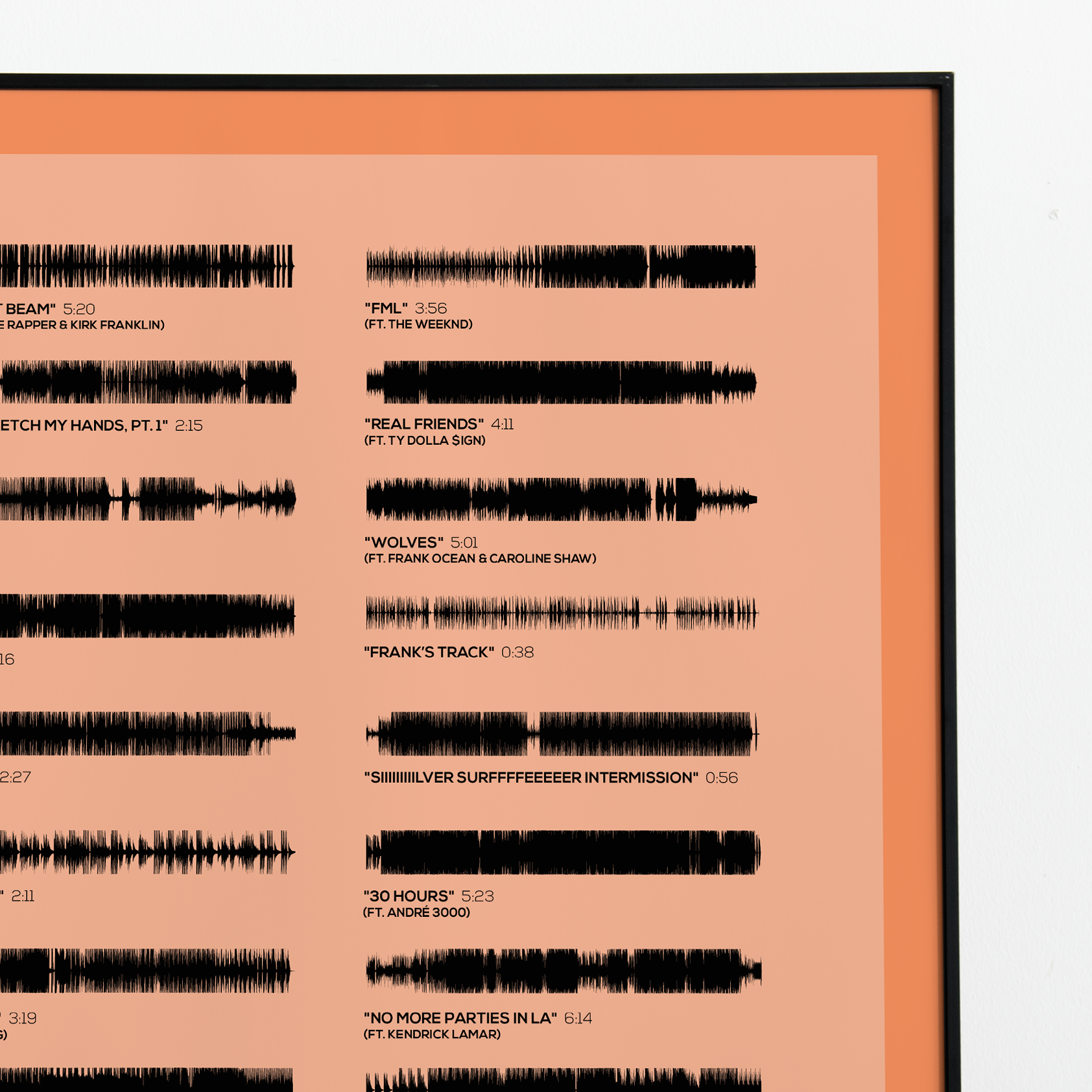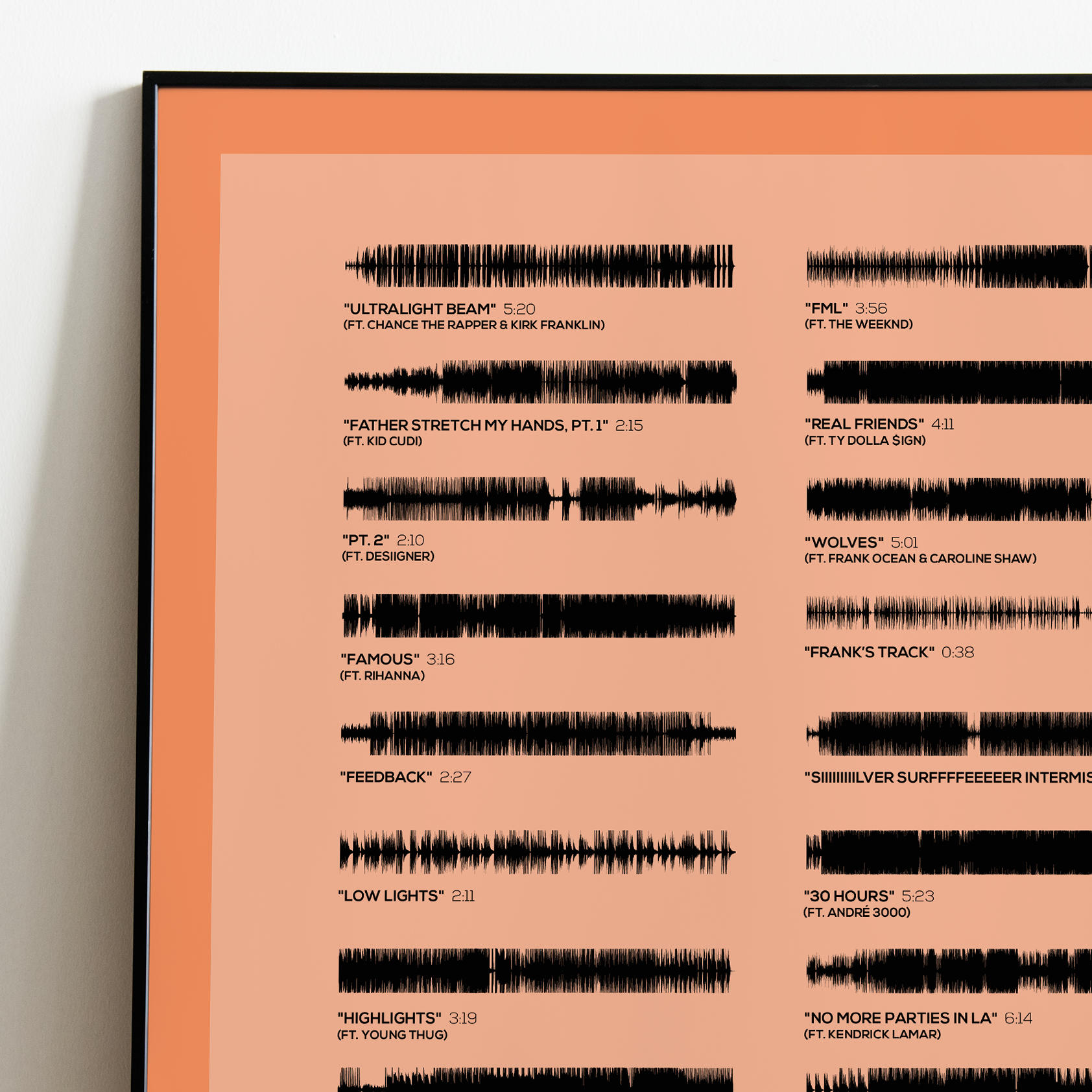 Make waves in your space with this unique soundwave album cover art for "The Life of Pablo" by Kanye West, available in three sizes: 16x20, 18x24, and 24x36 inches. Each piece is printed on high-quality 150GSM paper using industry-grade archival inks. Elevate your artwork by pairing it with a handcrafted, 100% hardwood frame in black, white, or natural wood, complete with hanging hardware for easy install & display. Certified authentic, each track’s soundwave is extrapolated using The Wav Room's lossless audio transcribing process, making it a must-have for Kanye West music enthusiasts.