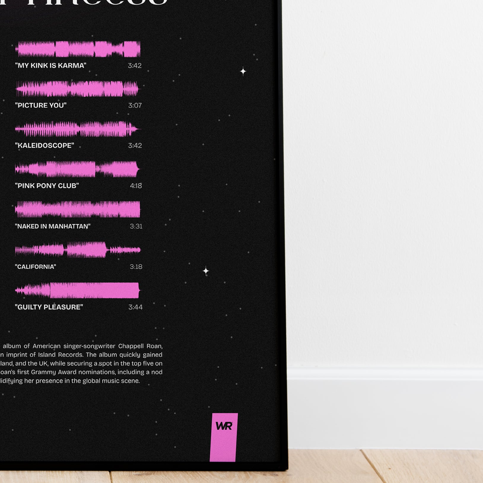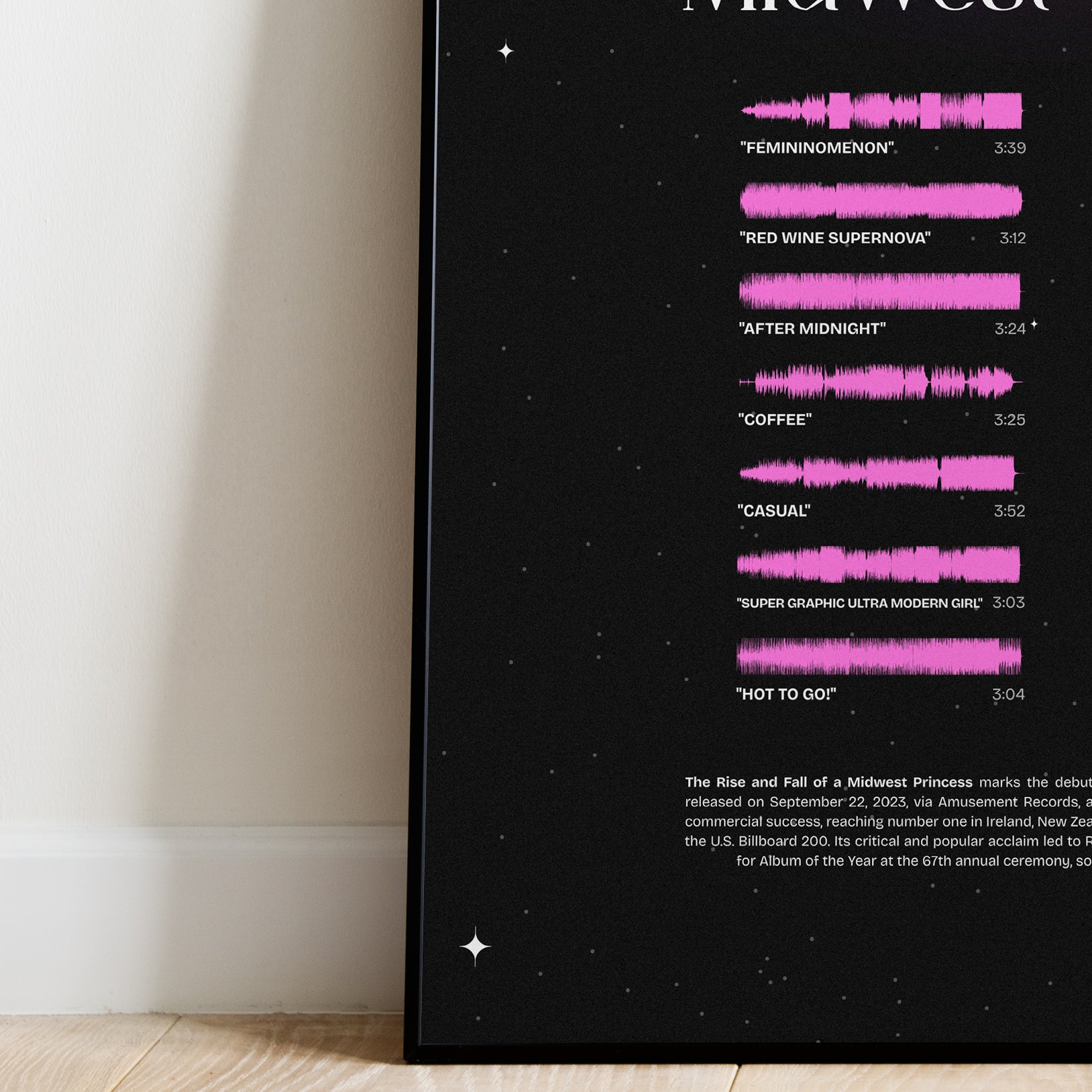 Make waves in your space with this unique soundwave album cover art for "The Rise and Fall of a Midwest Princess" by Chappell Roan, available in three sizes: 16x20, 18x24, and 24x36 inches. Each piece is printed on high-quality 150GSM paper using industry-grade archival inks. Elevate your artwork by pairing it with a handcrafted, 100% hardwood frame in black, white, or natural wood, complete with hanging hardware for easy install & display. Certified authentic, each track’s soundwave is extrapolated using The Wav Room's lossless audio transcribing process, making it a must-have for Chappell Roan music enthusiasts.