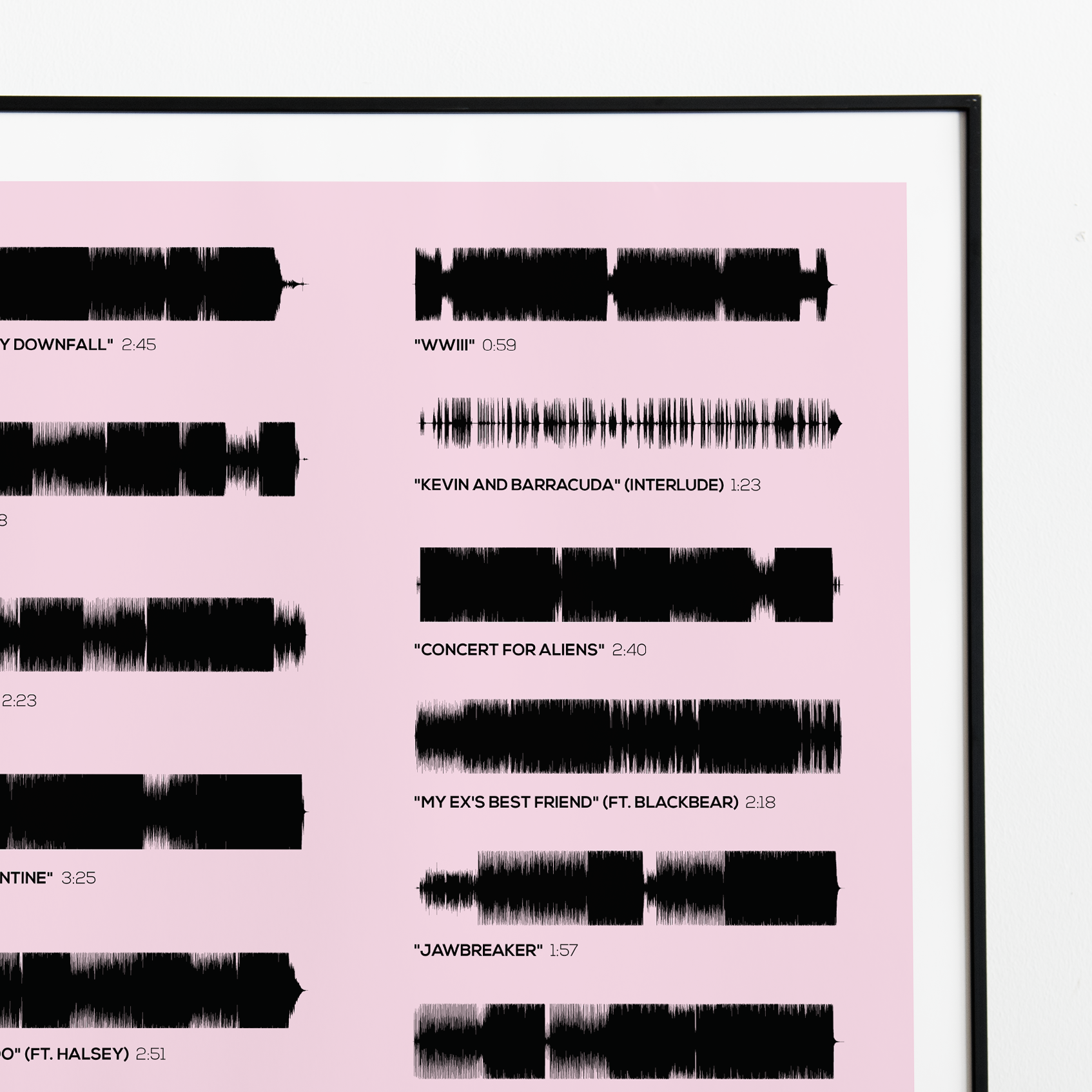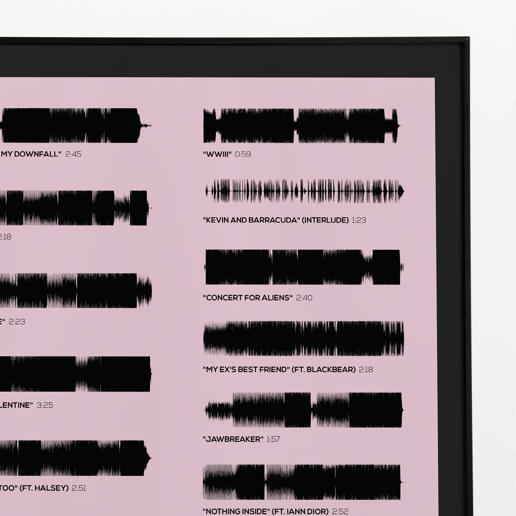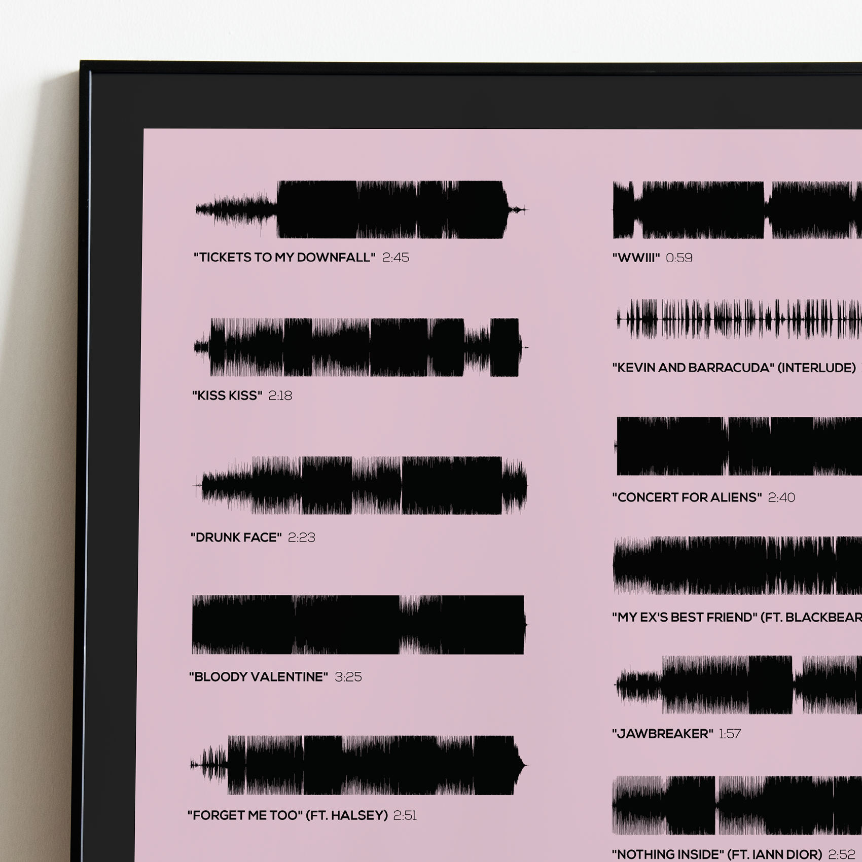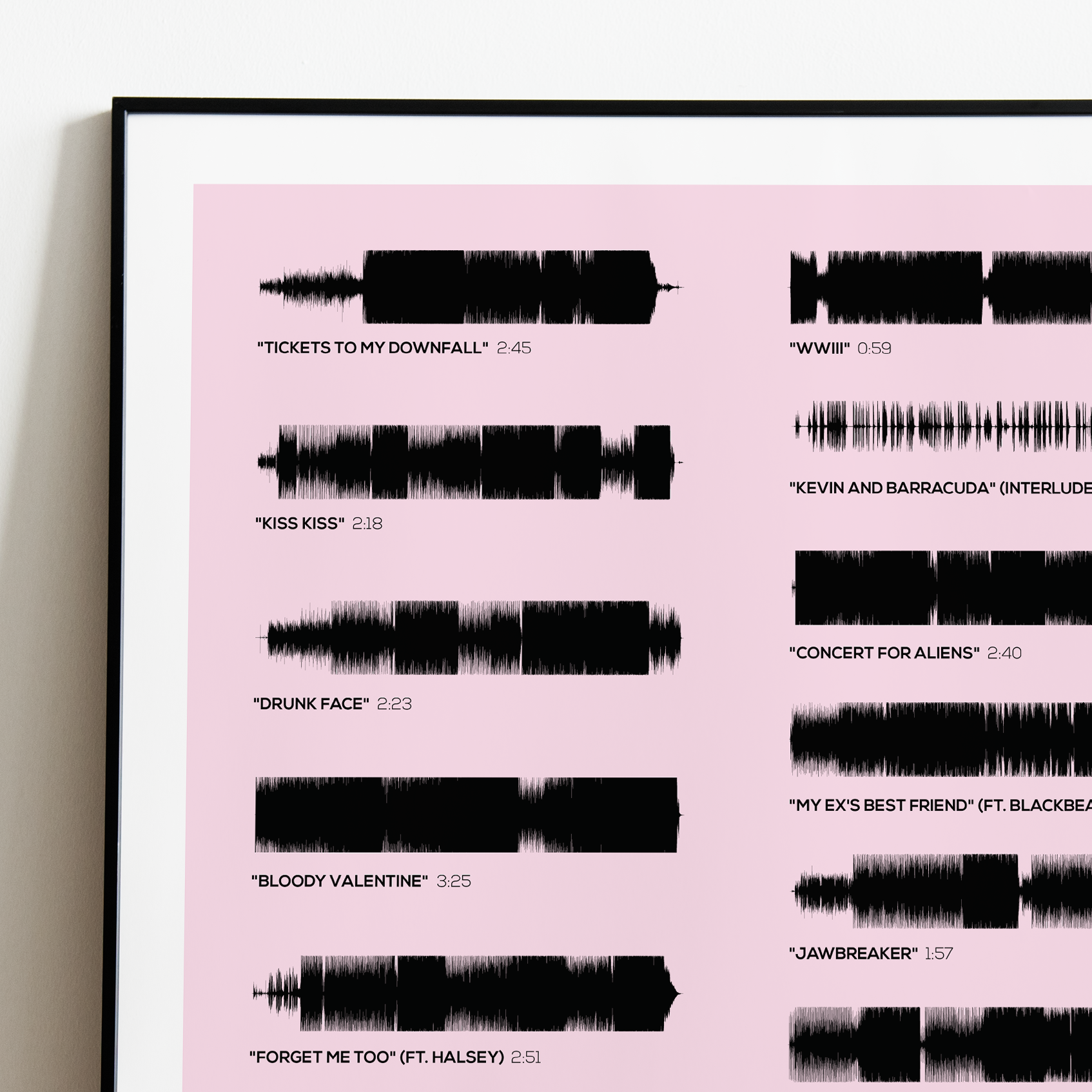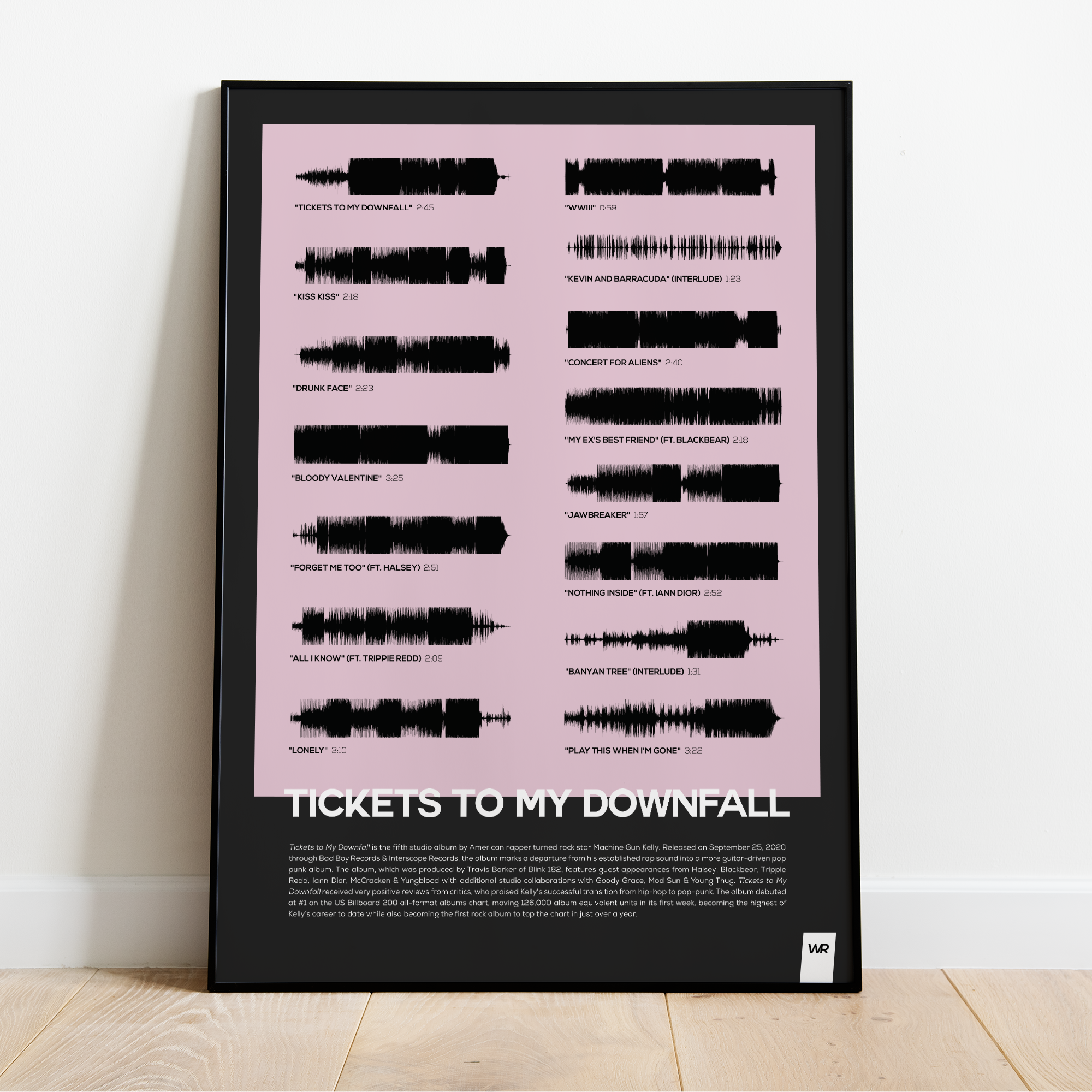 Make waves in your space with this unique soundwave album cover art for "Tickets to My Downfall" by Machine Gun Kelly, available in three sizes: 16x20, 18x24, and 24x36 inches. Each piece is printed on high-quality 150GSM paper using industry-grade archival inks. Elevate your artwork by pairing it with a handcrafted, 100% hardwood frame in black, white, or natural wood, complete with hanging hardware for easy install & display. Certified authentic, each track’s soundwave is extrapolated using The Wav Room's lossless audio transcribing process, making it a must-have for Machine Gun Kelly music enthusiasts.